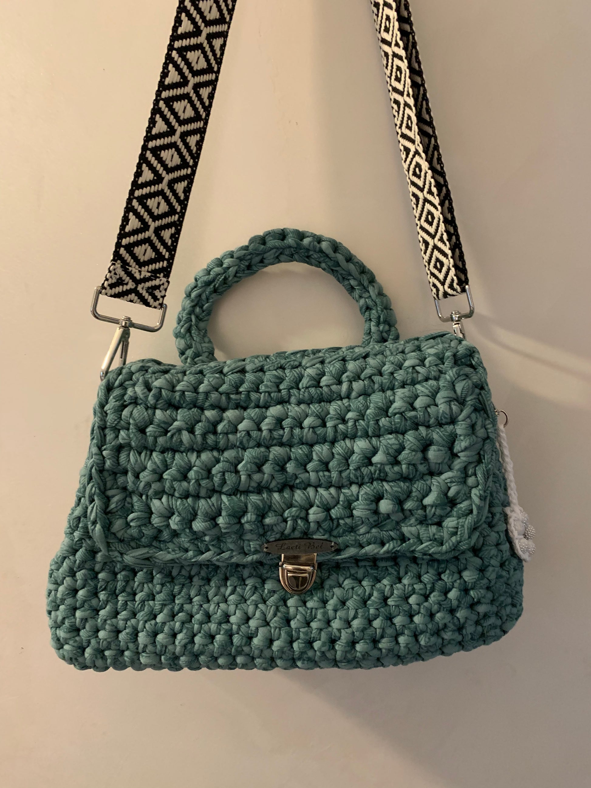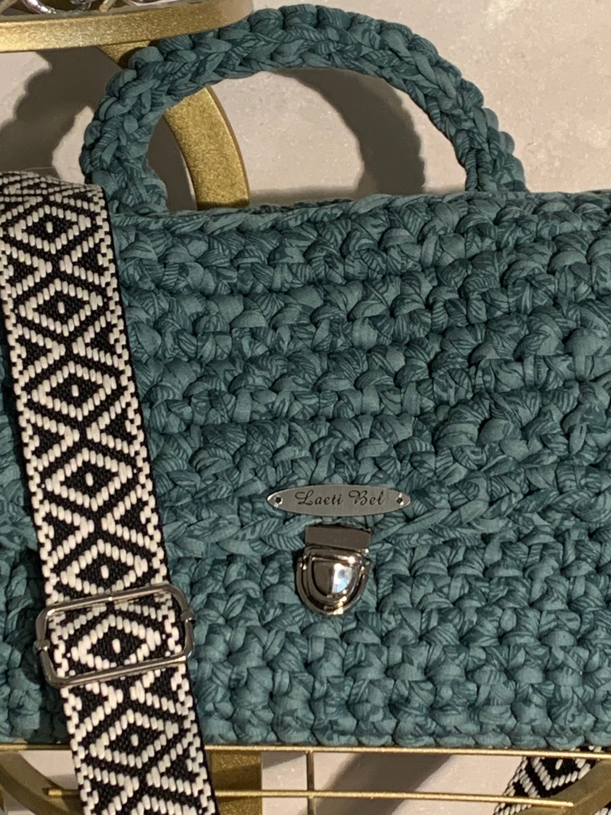 Découvrez l’alliance parfaite entre artisanat et modernité avec le sac à main Alba. Crocheté à la main dans un fil épais vert profond, il séduit par sa texture authentique et sa solidité. Son rabat élégant, fermé par une boucle métallique sécurisée, est mis en valeur par une bandoulière large à motifs graphiques noirs et blancs, apportant une touche contemporaine et originale.