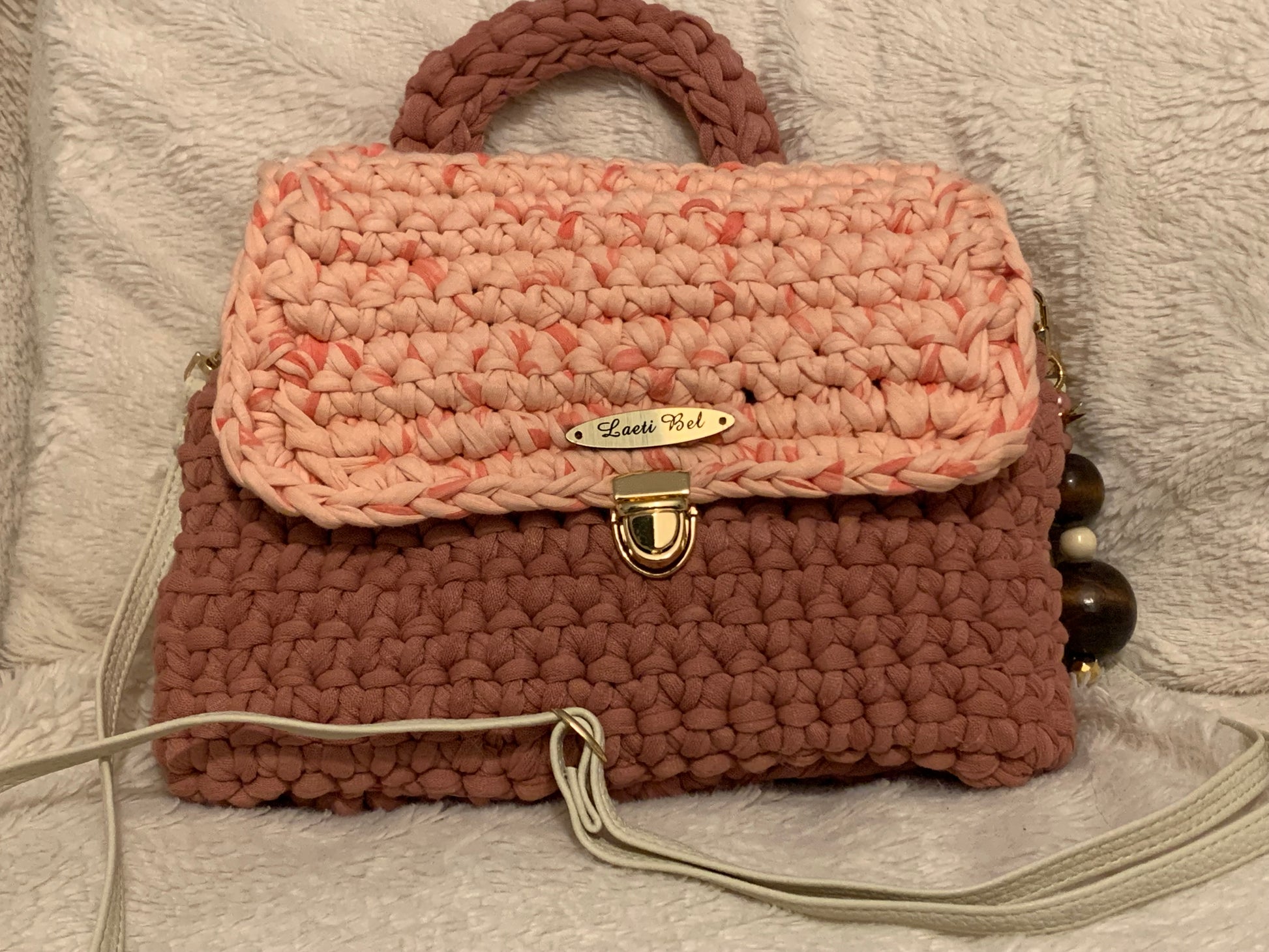 Anse : Poignée crochetée + bandoulière fine ajustable.