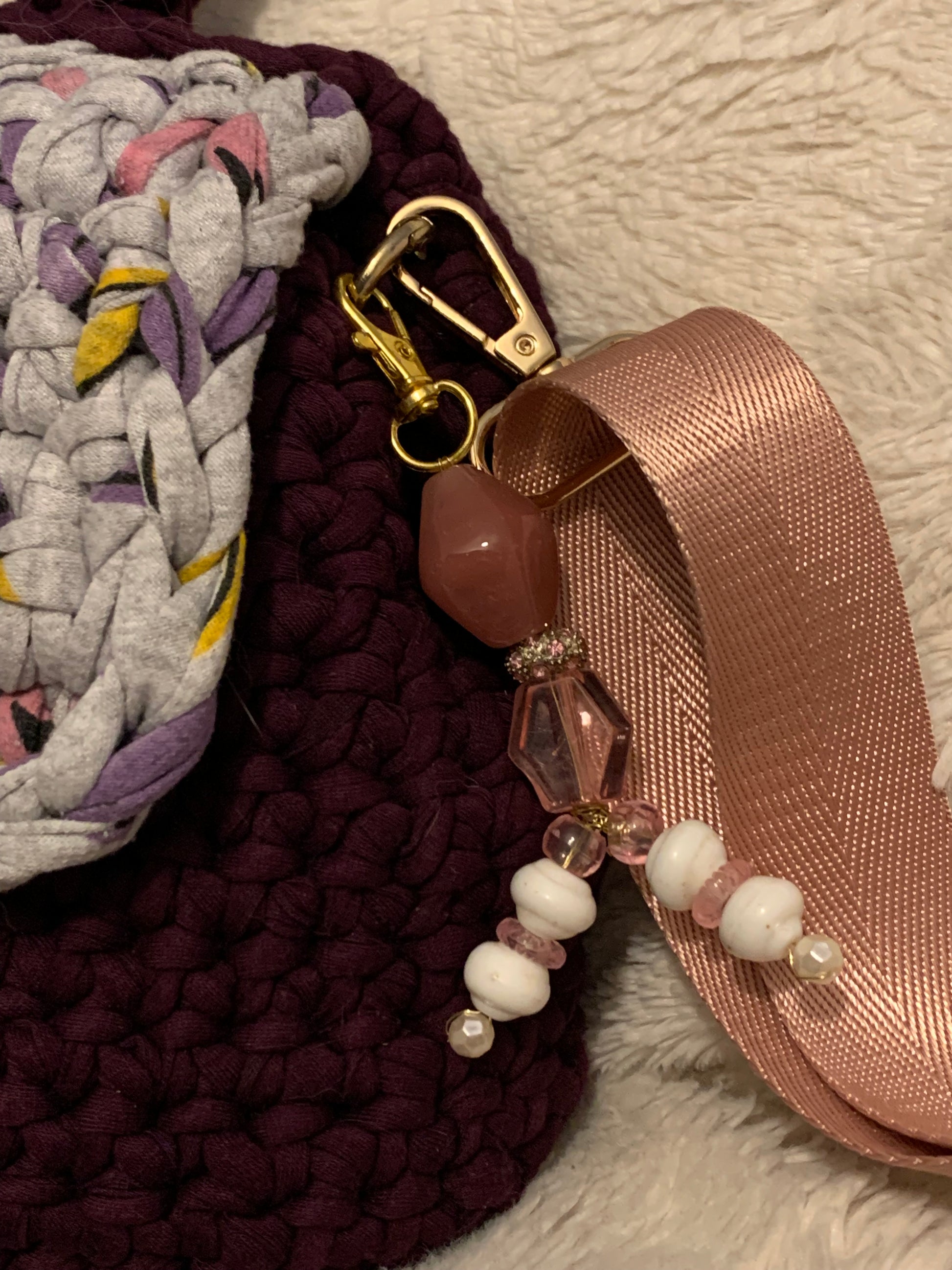 Anse : Poignée crochetée + large bandoulière réglable rose poudré.