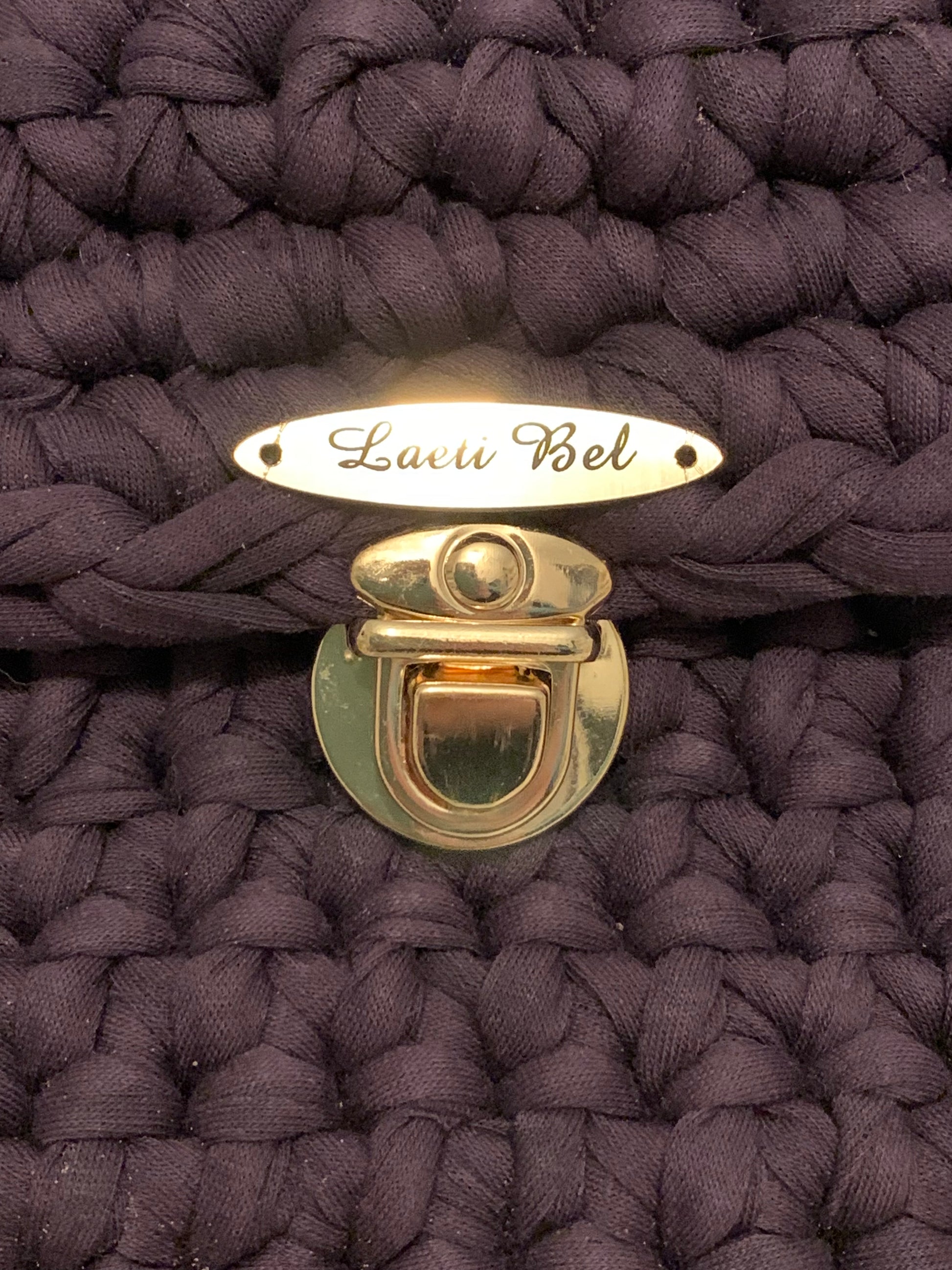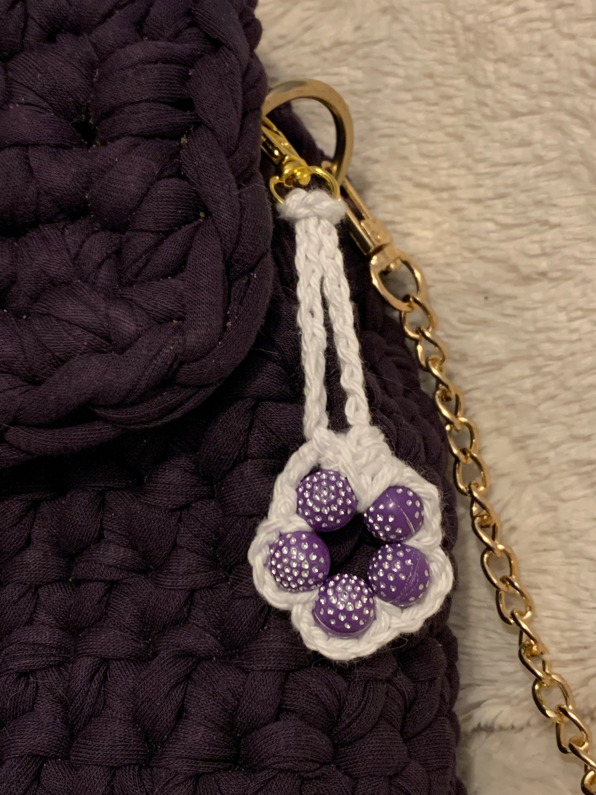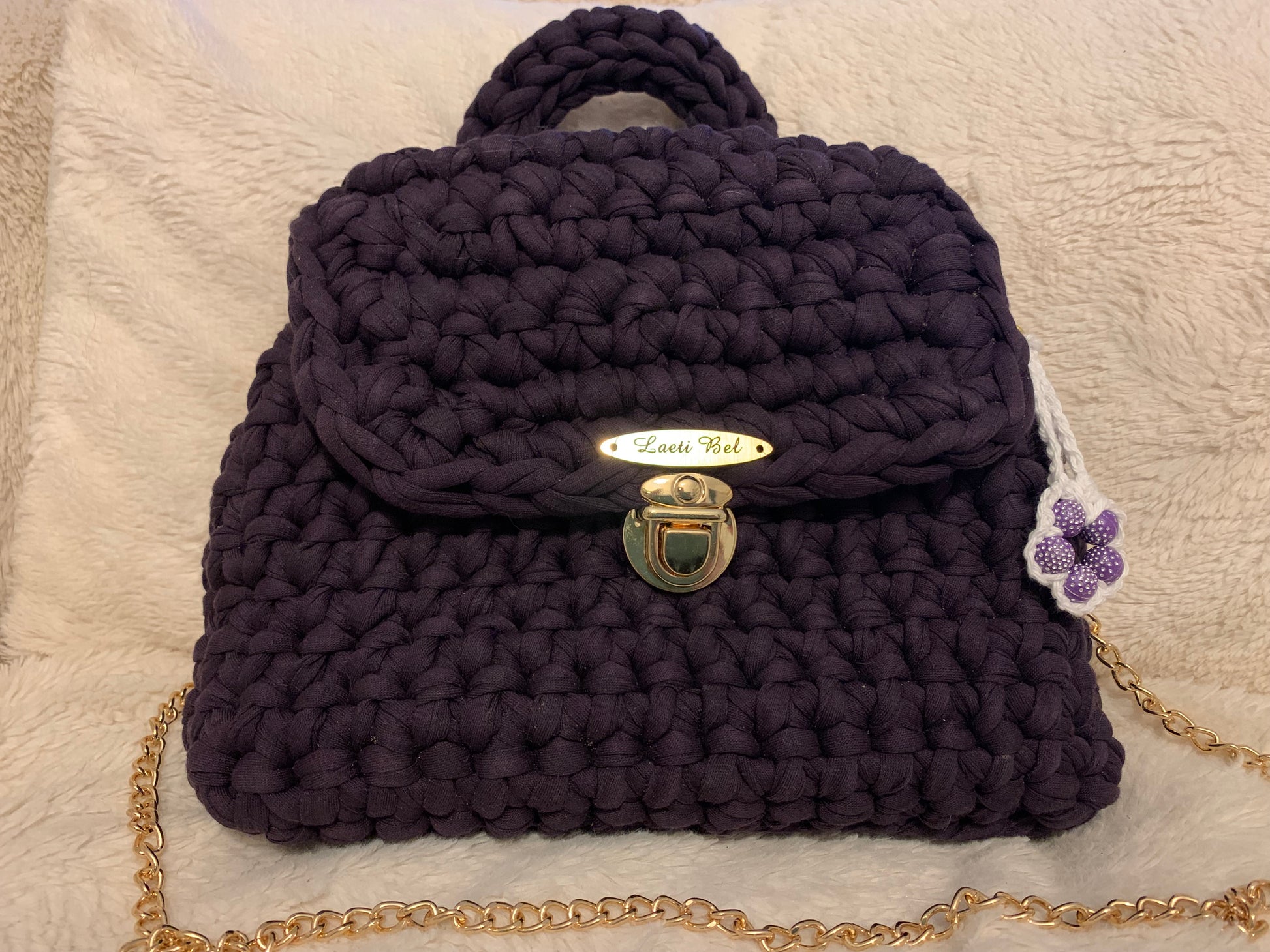 Le modèle Alba se décline dans une version élégante et originale. Réalisé en crochet artisanal de couleur prune intense, il est sublimé par une petite fleur crochetée violette et blanche accrochée sur le côté, qui lui apporte une note poétique et féminine. La chaînette dorée assure raffinement et modernité, tandis que le fermoir métallique doré vient parfaire ce modèle unique.