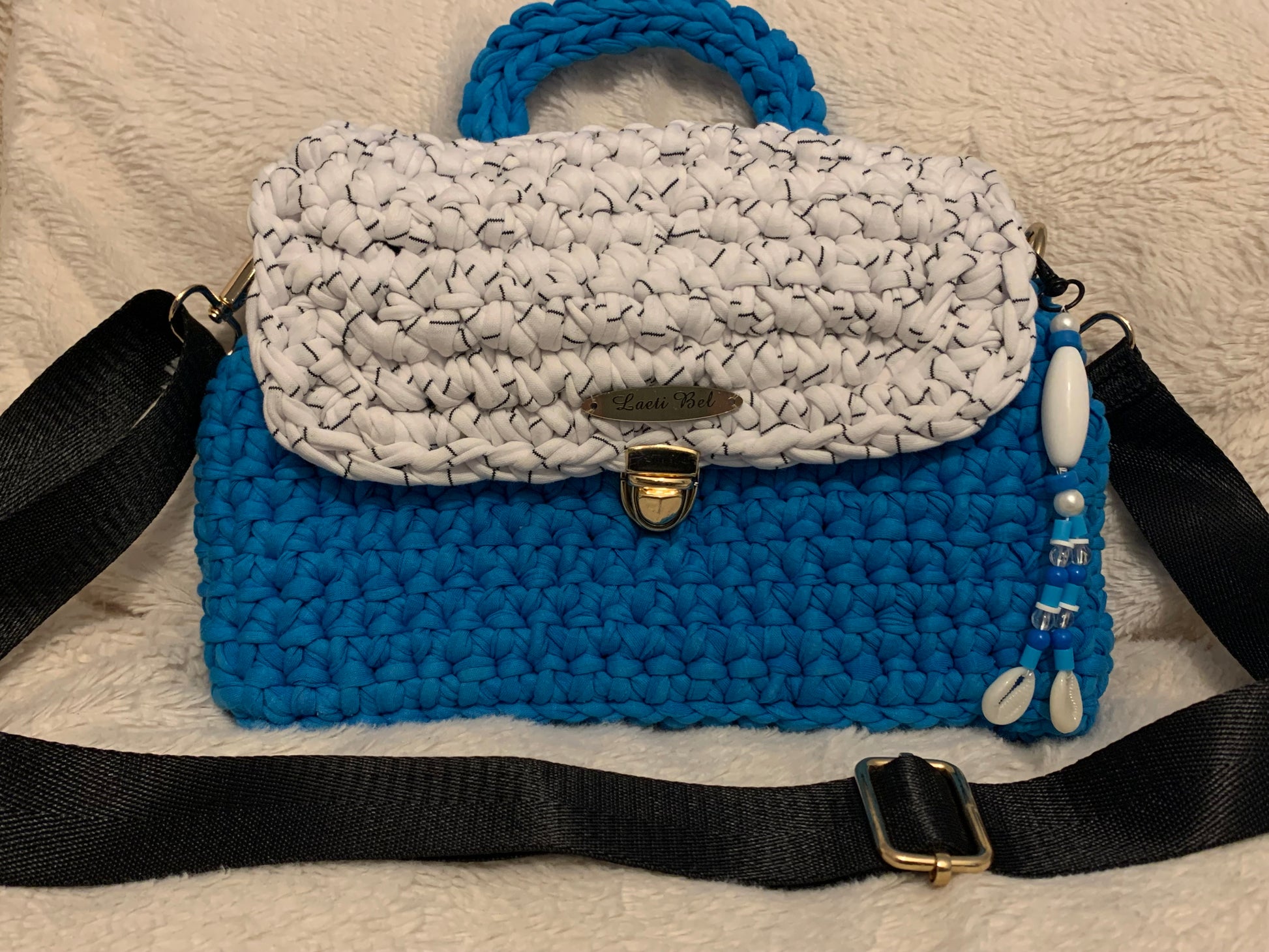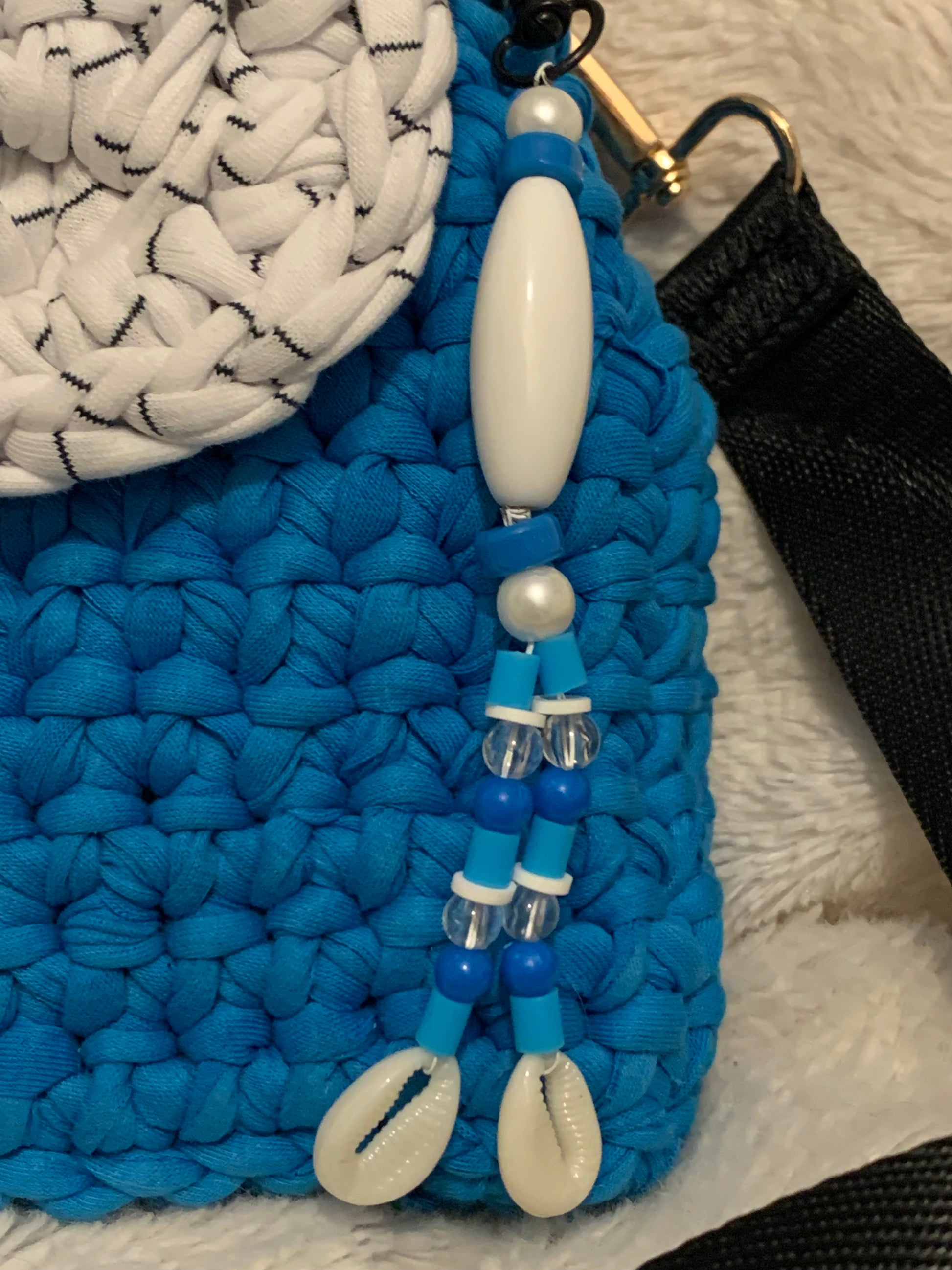 Le modèle Alba s’inspire des couleurs de la mer pour un style frais et estival. Sa base en crochet bleu vif contraste élégamment avec son rabat blanc texturé, rappelant l’écume des vagues. La bandoulière noire réglable ajoute une touche moderne et pratique, tandis que le pendentif décoratif en perles bleues et coquillage évoque un charme bohème marin.