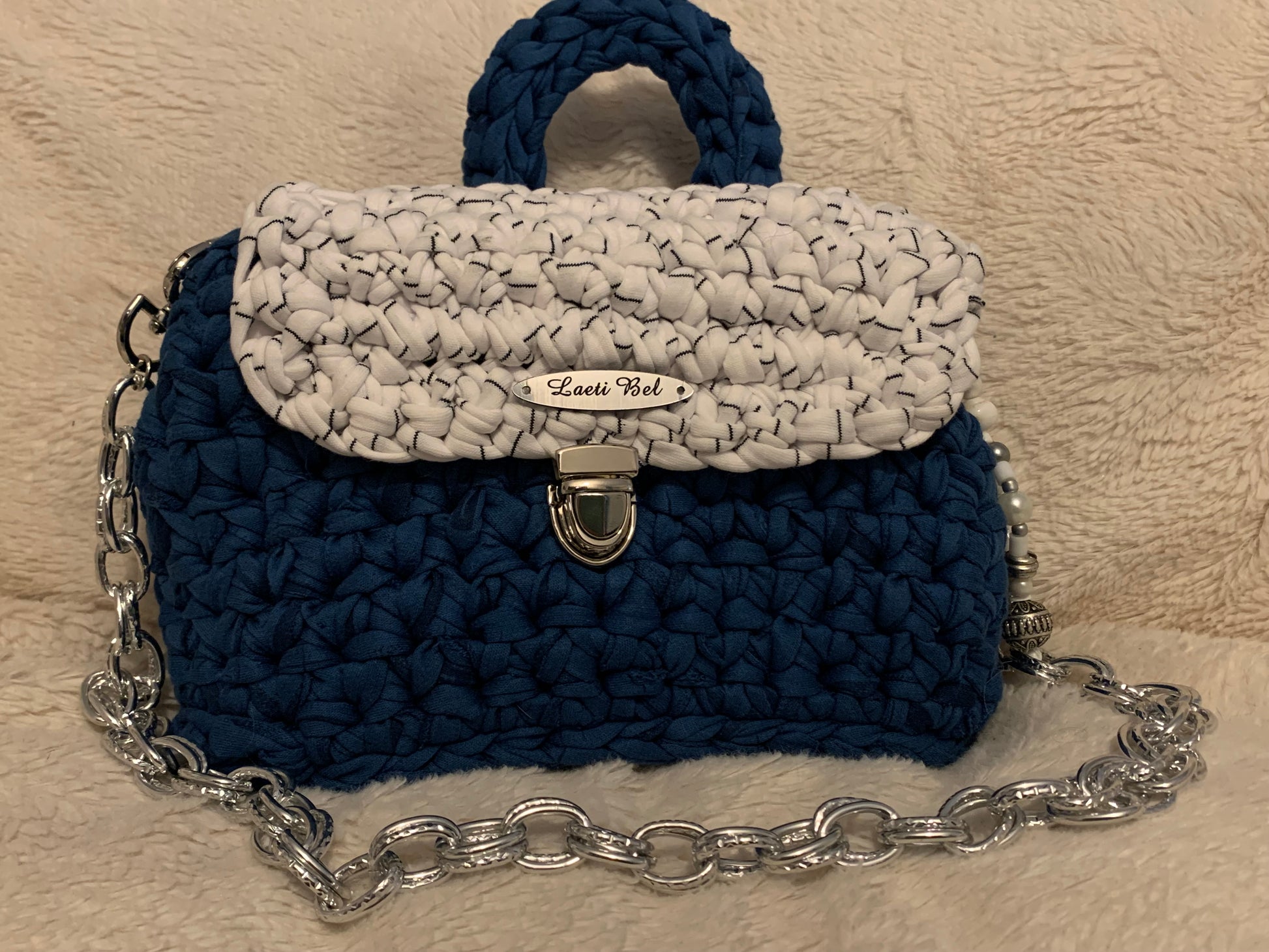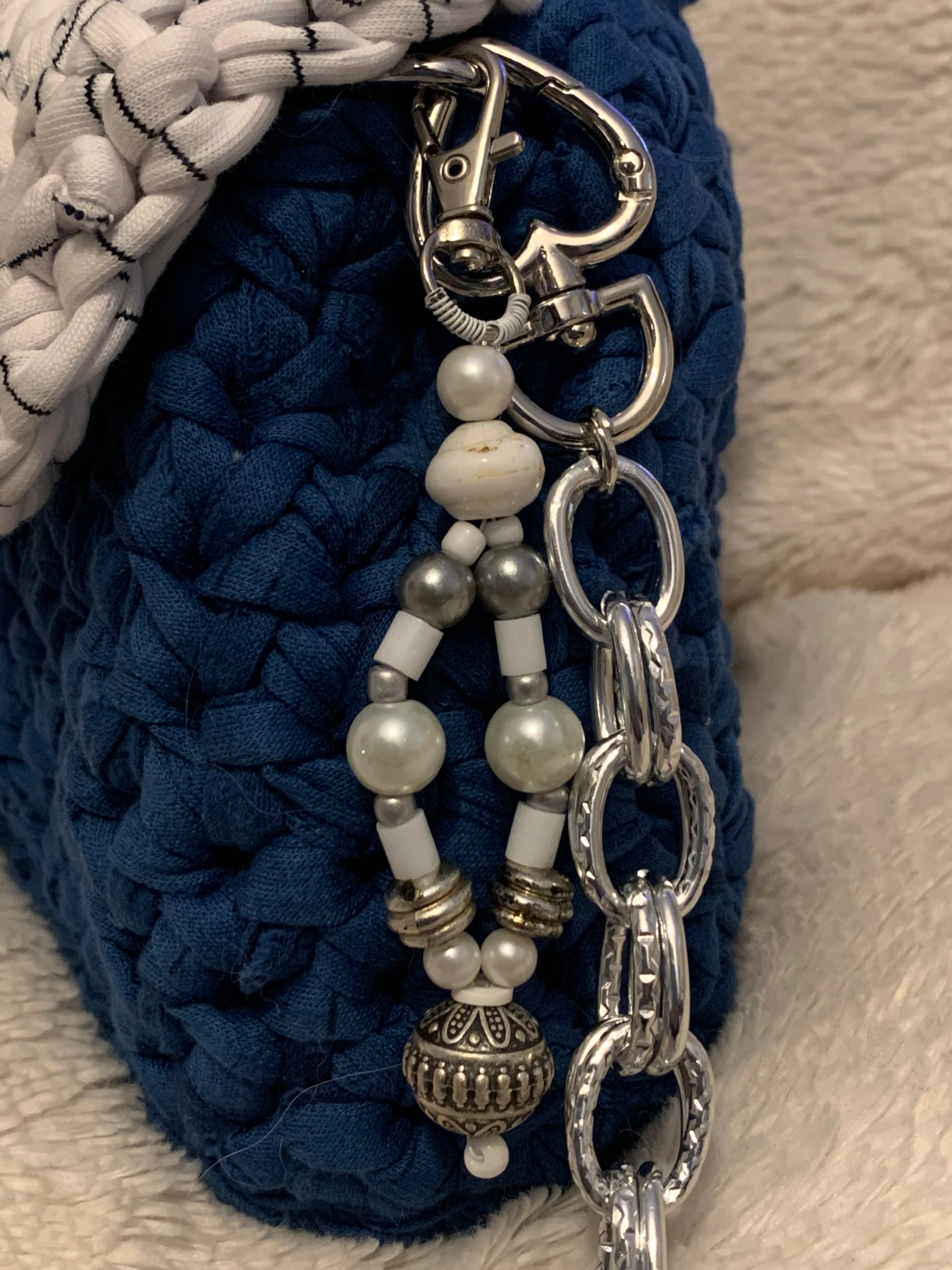 Le modèle Alba joue la carte de l’élégance bicolore avec ce mariage raffiné de bleu nuit profond et de blanc lumineux. Son rabat clair en crochet met en valeur une base sombre et chic, idéale pour un style intemporel. La chaîne argentée vient renforcer son caractère moderne, tandis que le petit pendentif en perles blanches apporte une touche de délicatesse.