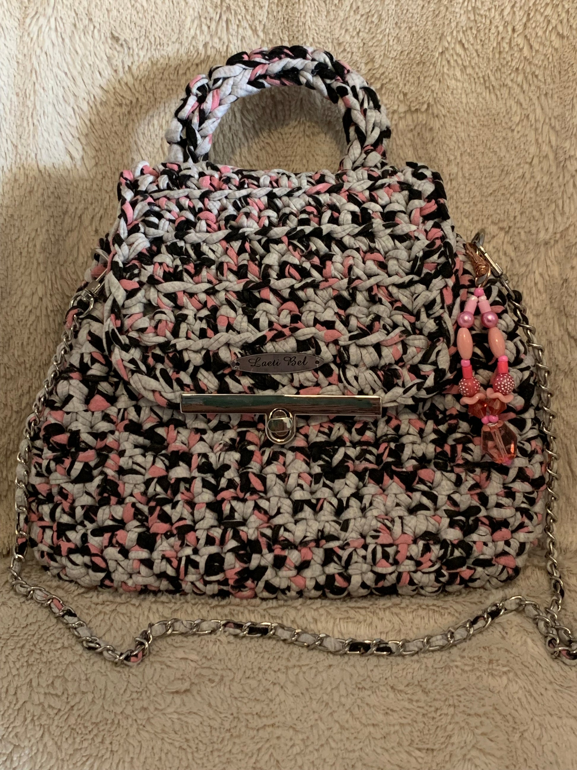 Anse : Poignée crochetée + bandoulière en chaîne argentée.