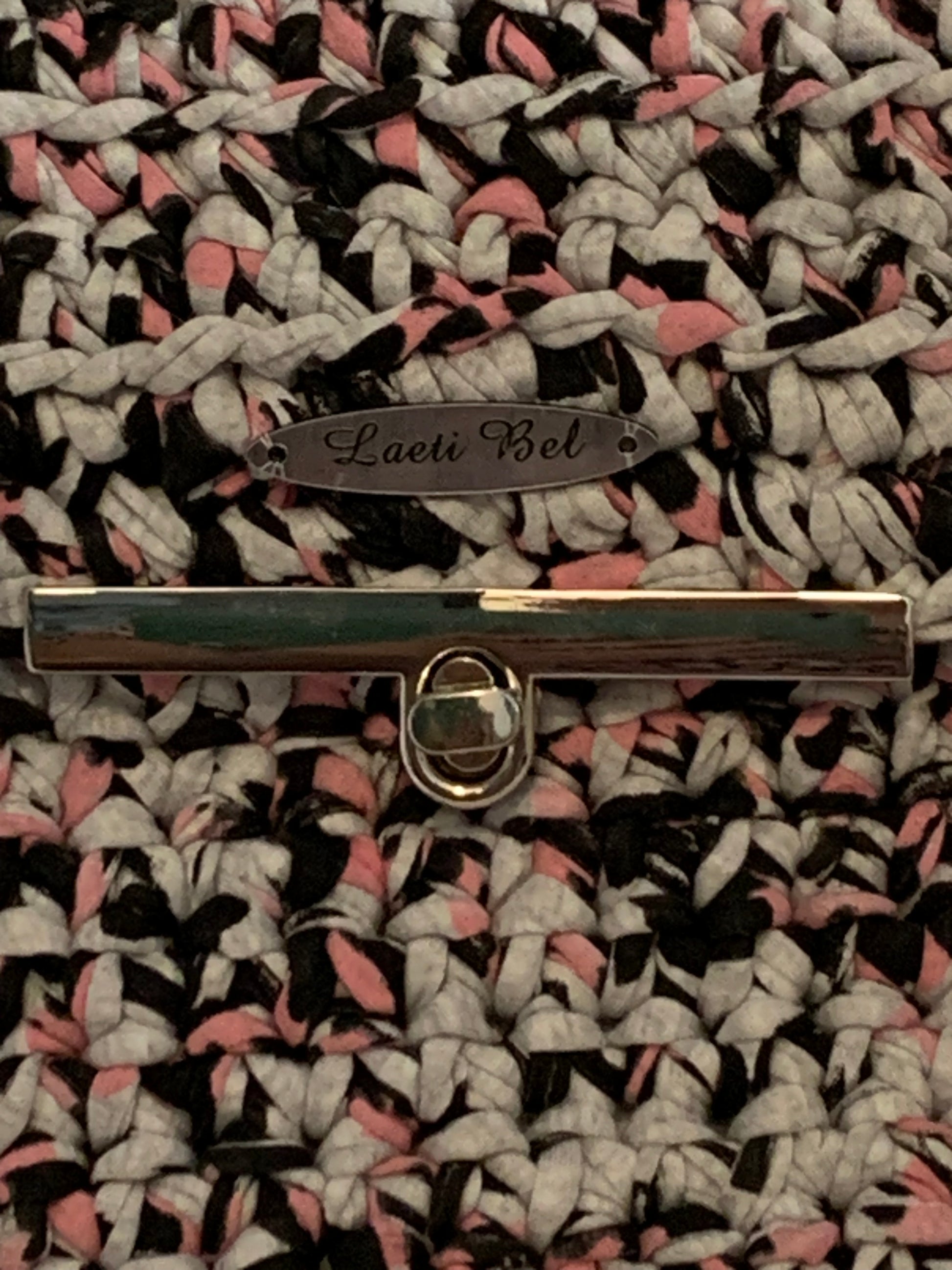 Couleurs : Base tissée noir, blanc et rose pastel.