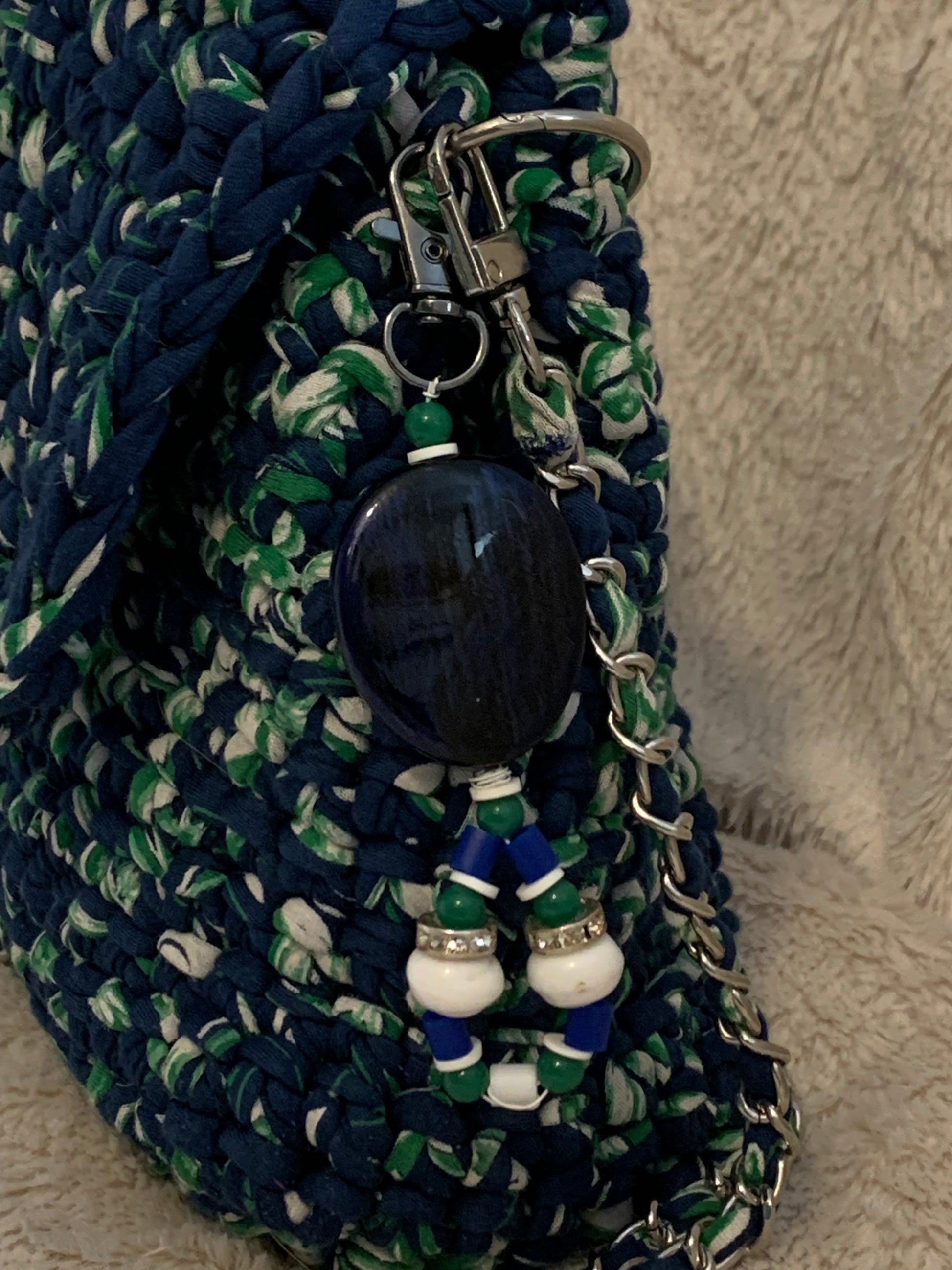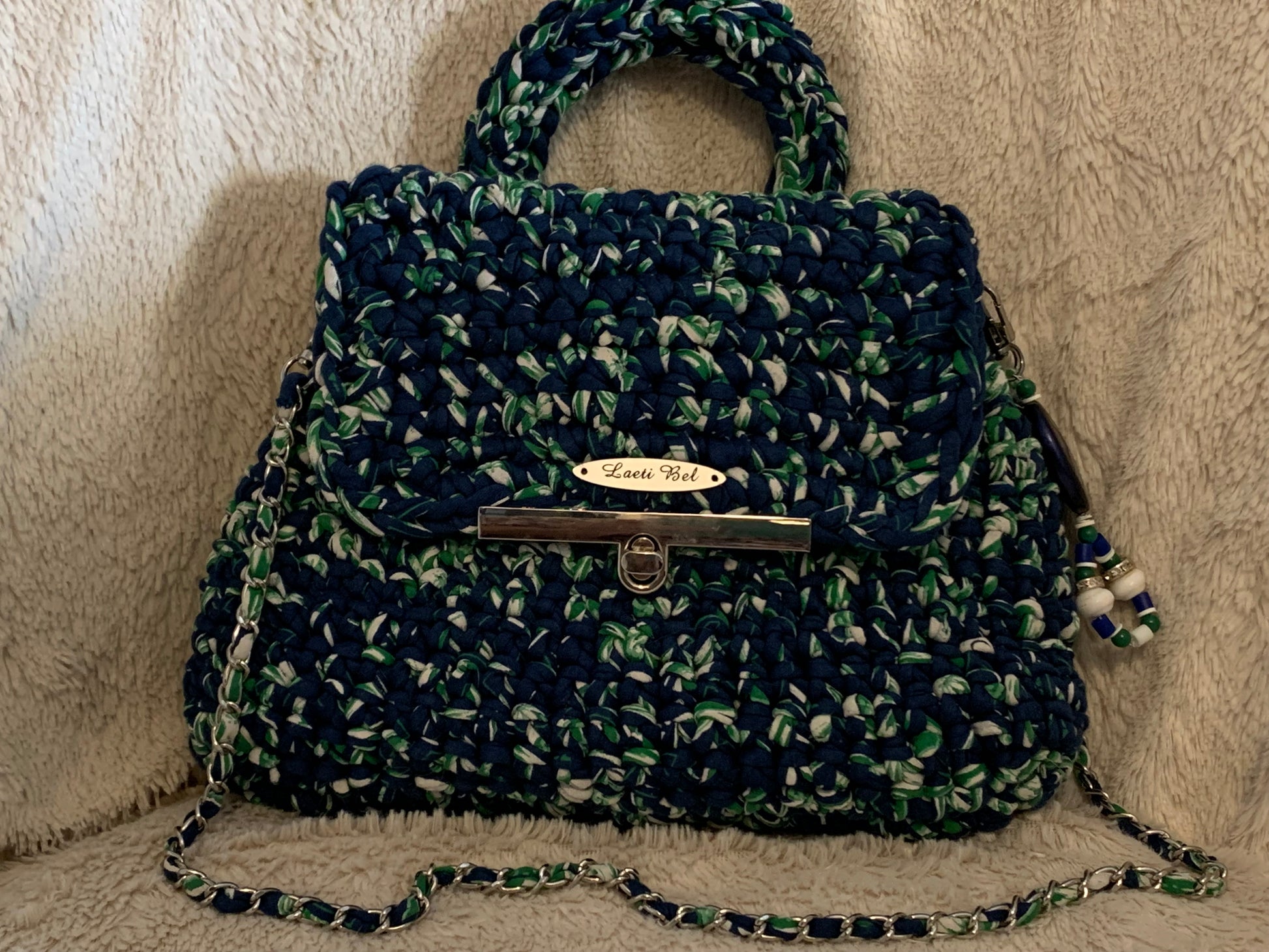 Le modèle Alba se réinvente dans une combinaison intense et raffinée : un tissage en nuances de bleu nuit, vert émeraude et touches claires qui rappellent la profondeur des forêts et des océans. Son style unique marie élégance et authenticité, idéal pour celles qui aiment les accessoires singuliers. La bandoulière en chaîne argentée tressée de fil et le pendentif perlé apportent une finition chic et artisanale.