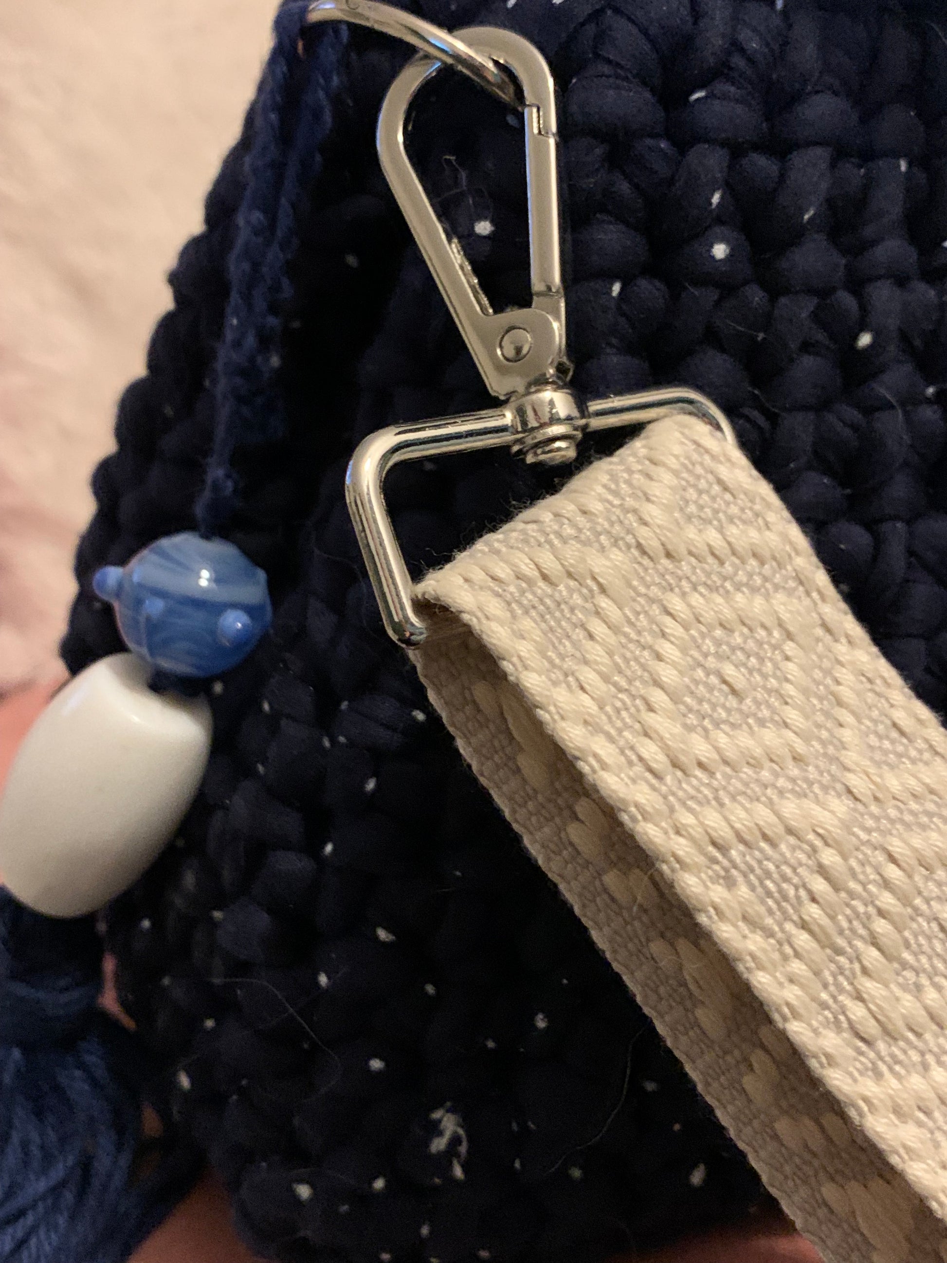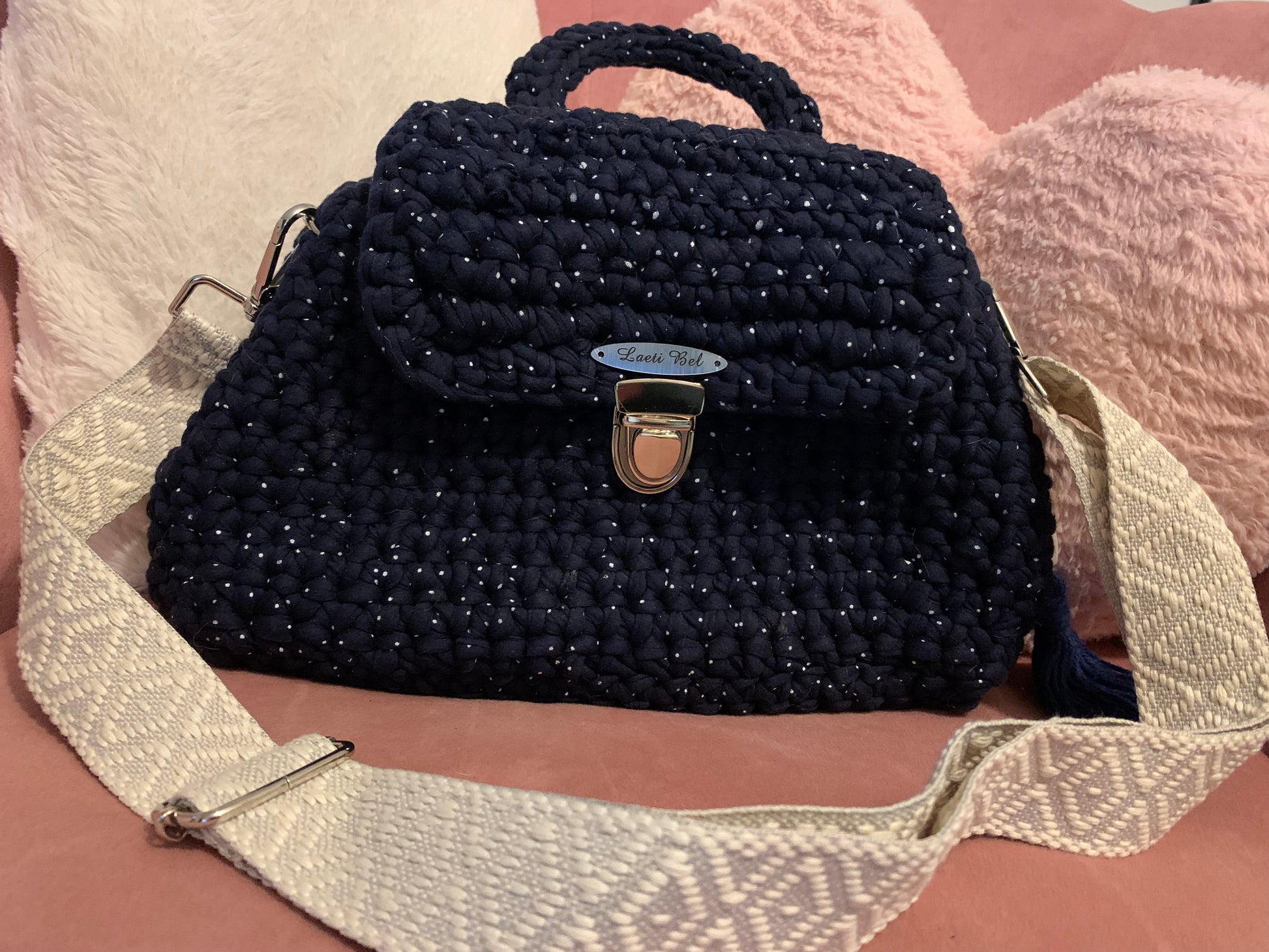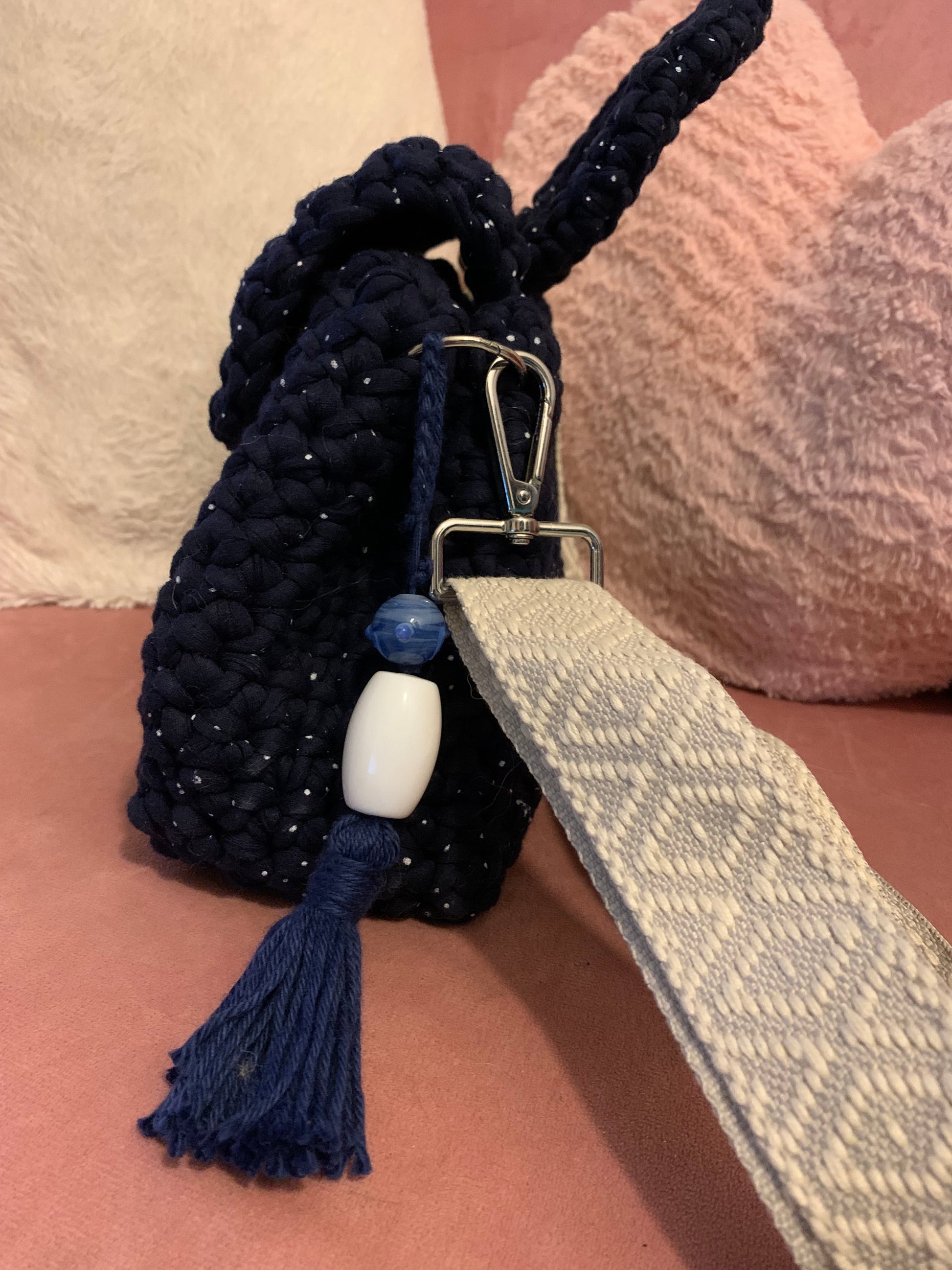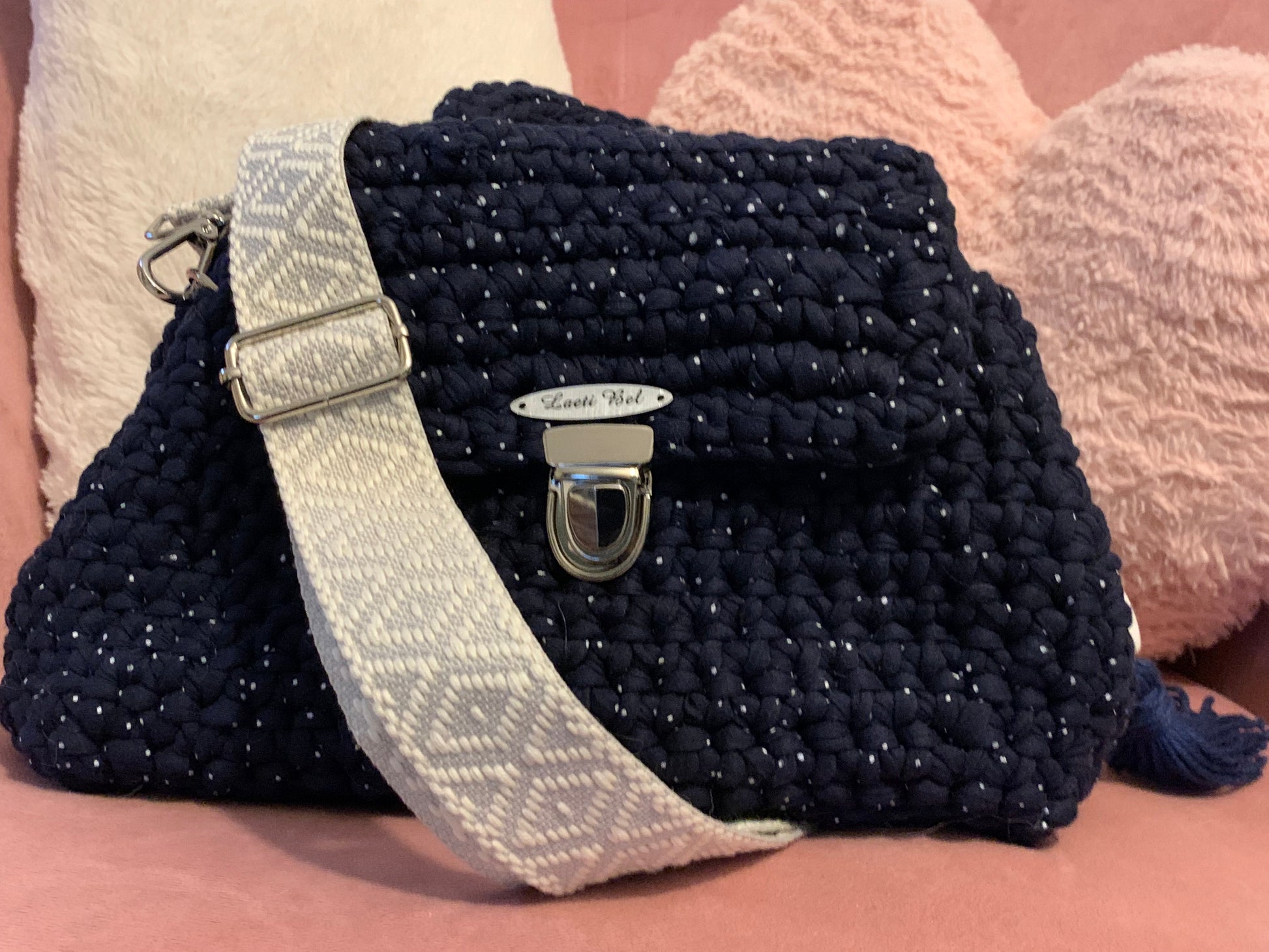 Le sac Alba en crochet bleu marine se distingue par ses fils subtilement pailletés et sa bandoulière tissée grise à motifs. Son fermoir argenté assure élégance et sécurité, tandis que sa conception artisanale garantit un modèle unique et raffiné.