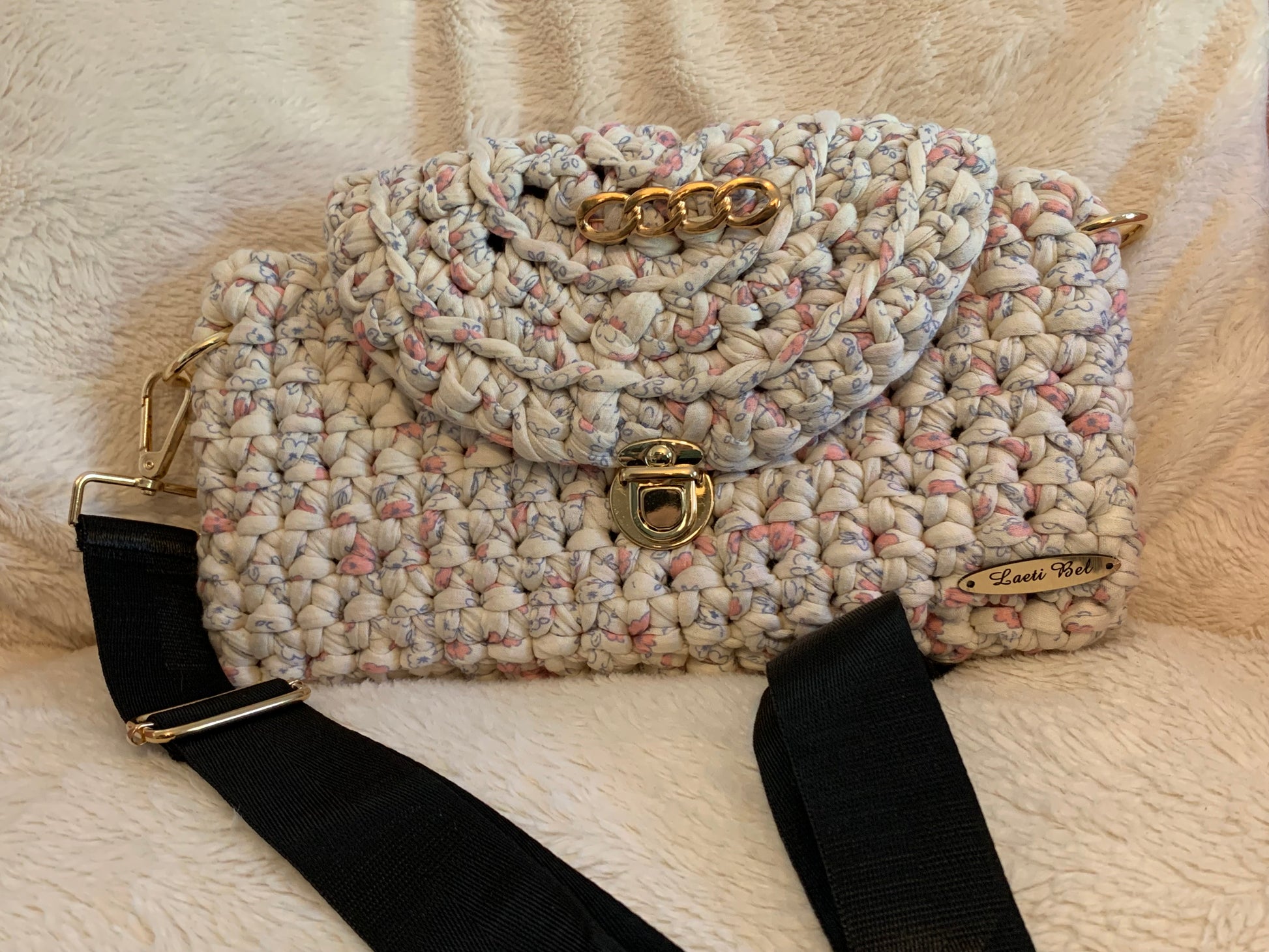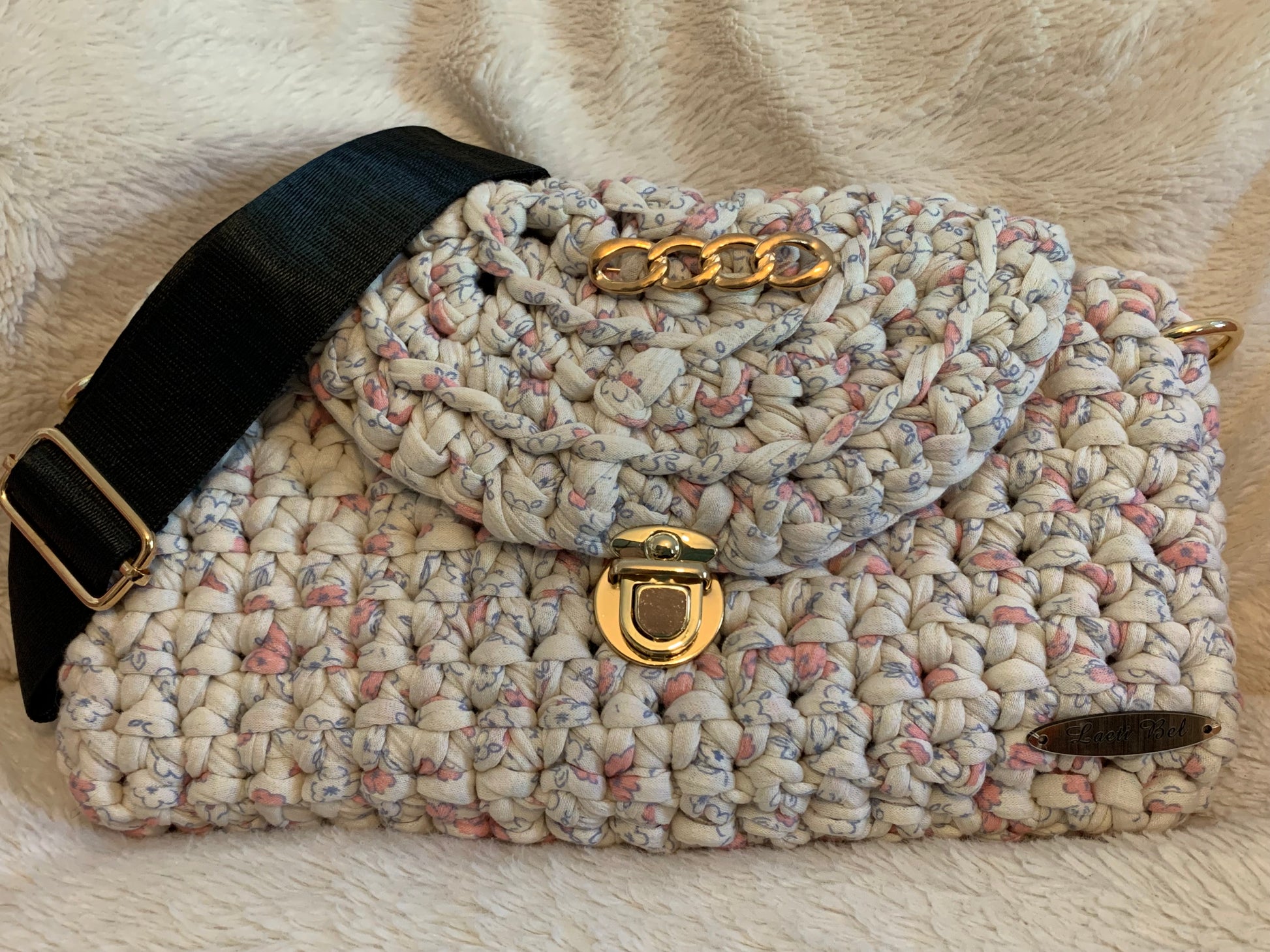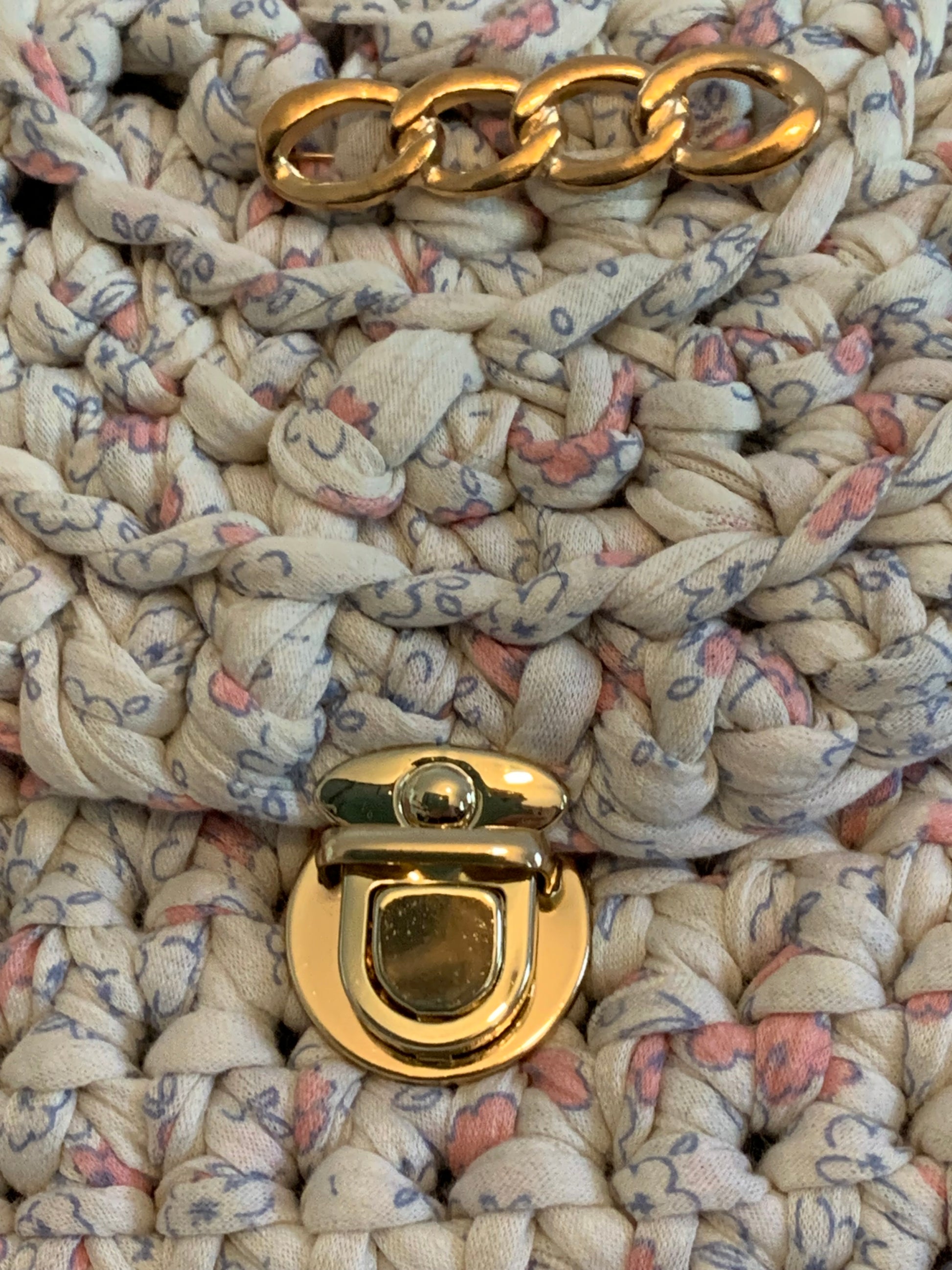 Laissez-vous séduire par le charme artisanal du sac à main Alice, réalisé à la main en crochet épais couleur crème, subtilement parsemé de motifs fleuris rosés et bleus. Sa bandoulière noire réglable et son fermoir doré ajoutent une note chic et sophistiquée à ce modèle unique.