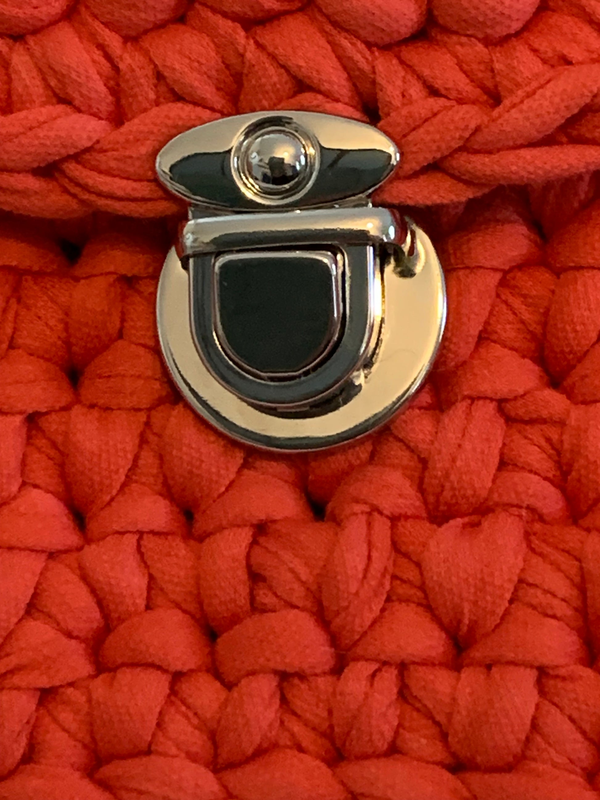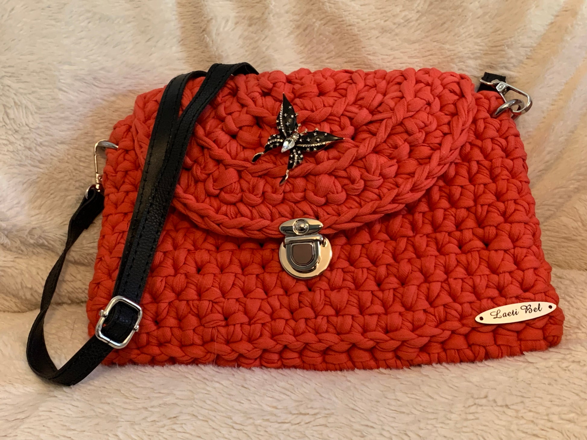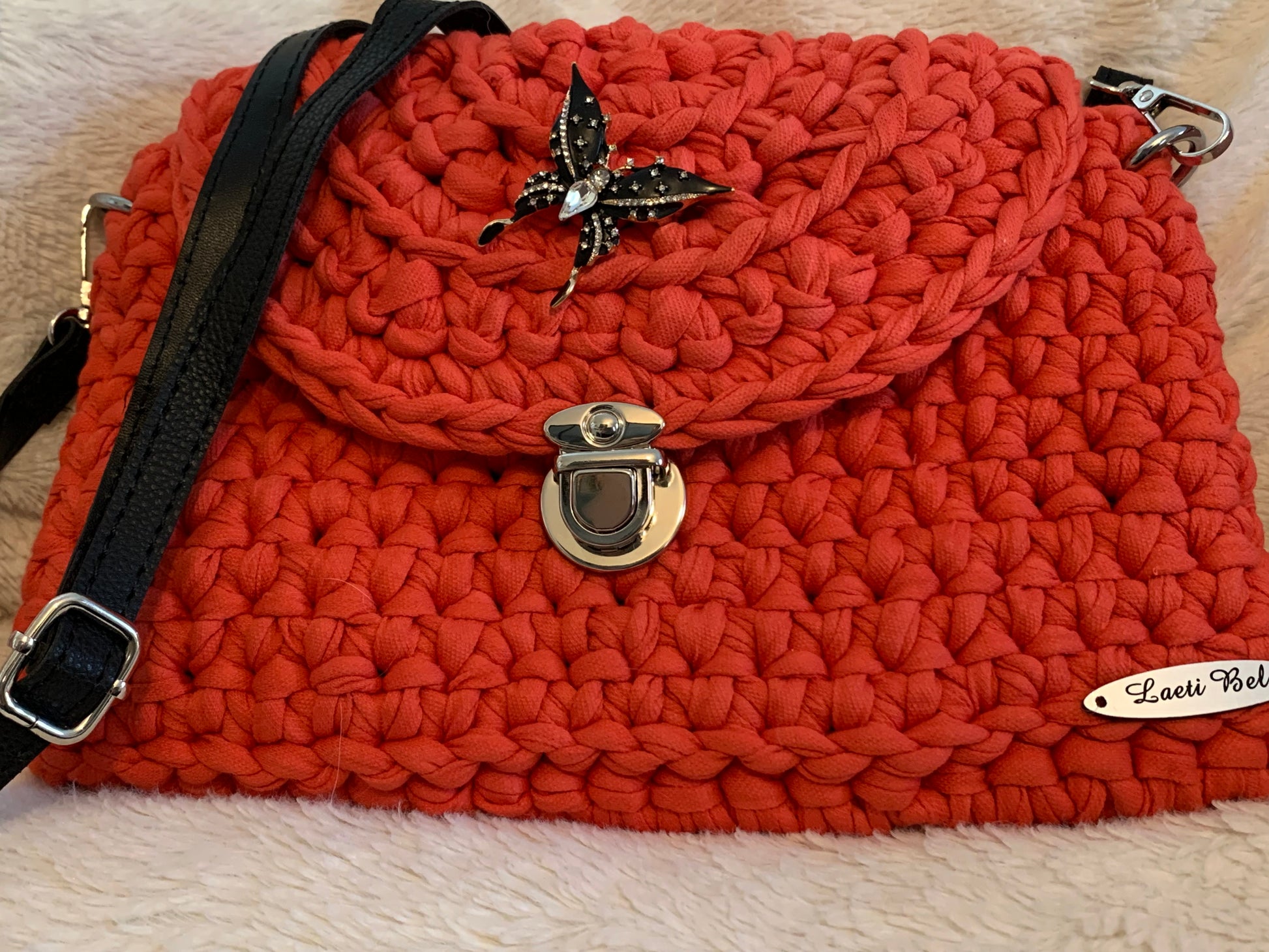 Affirmez votre style avec le sac à main Alice, confectionné à la main en crochet épais de couleur rouge vif. Sa texture robuste et élégante est sublimée par un pendentif papillon argenté orné de strass, pour des femmes uniques qui aiment allier caractère et délicatesse.