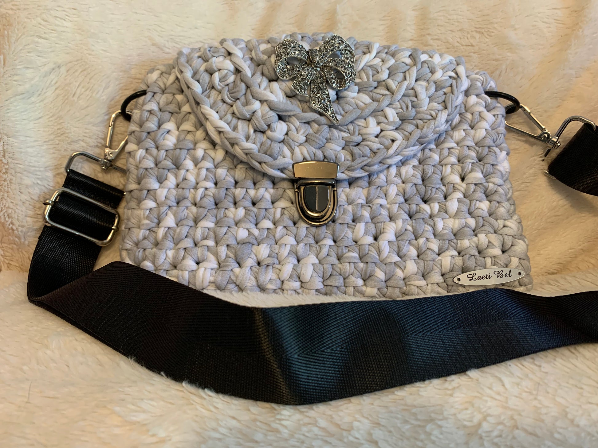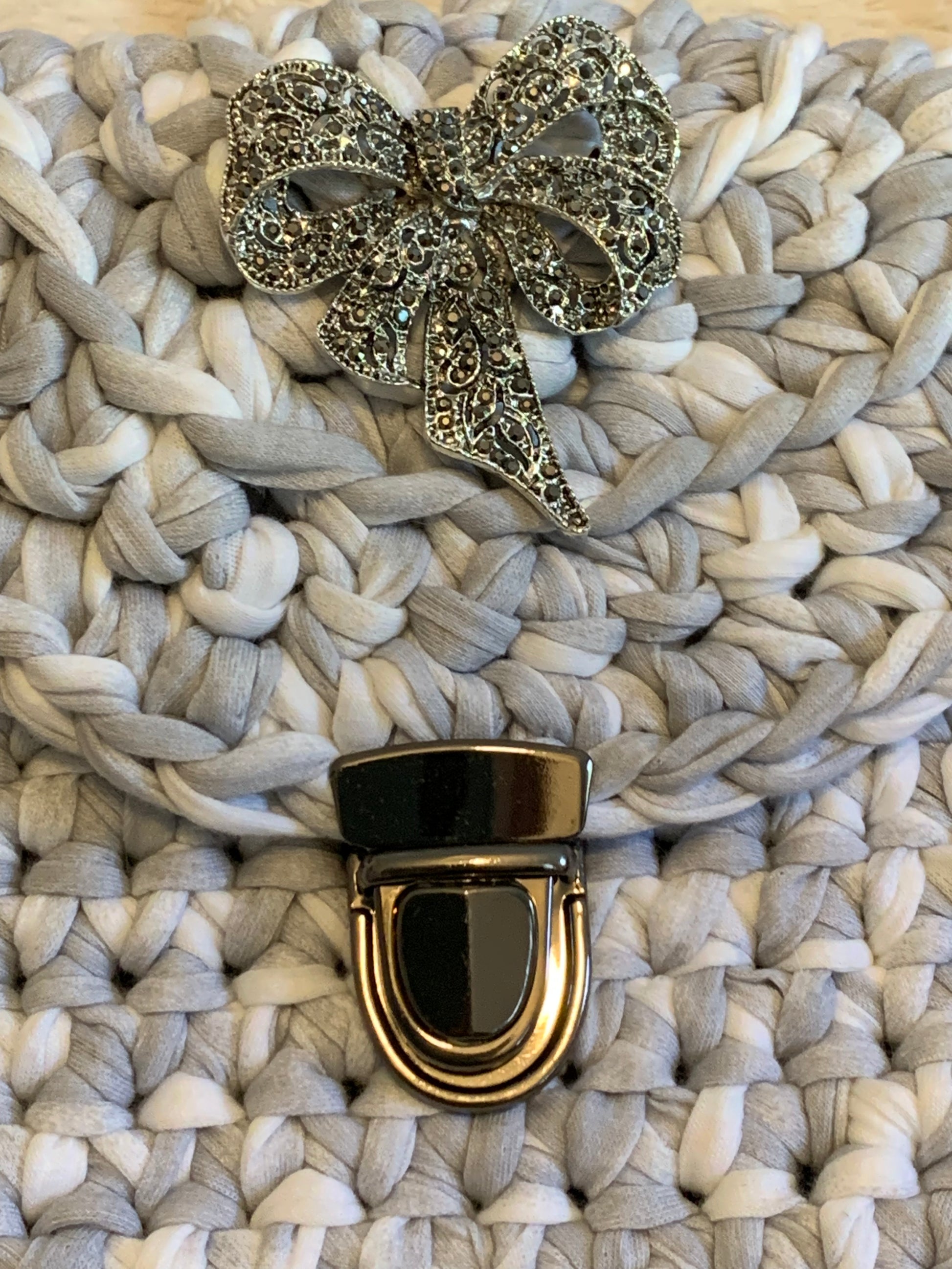 Le sac Alice, en crochet gris clair, allie sobriété et raffinement. Son rabat orné d’un bijou en forme de nœud argenté et son fermoir métallique doré lui donnent un style chic et intemporel. Sa bandoulière noire large et réglable assure un confort optimal au quotidien.
