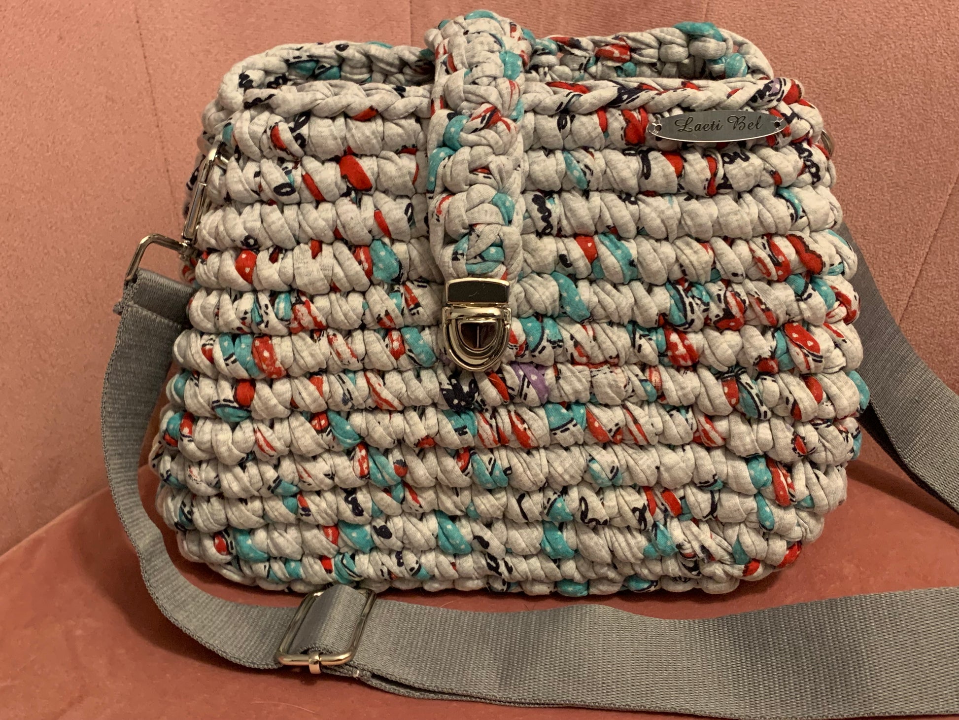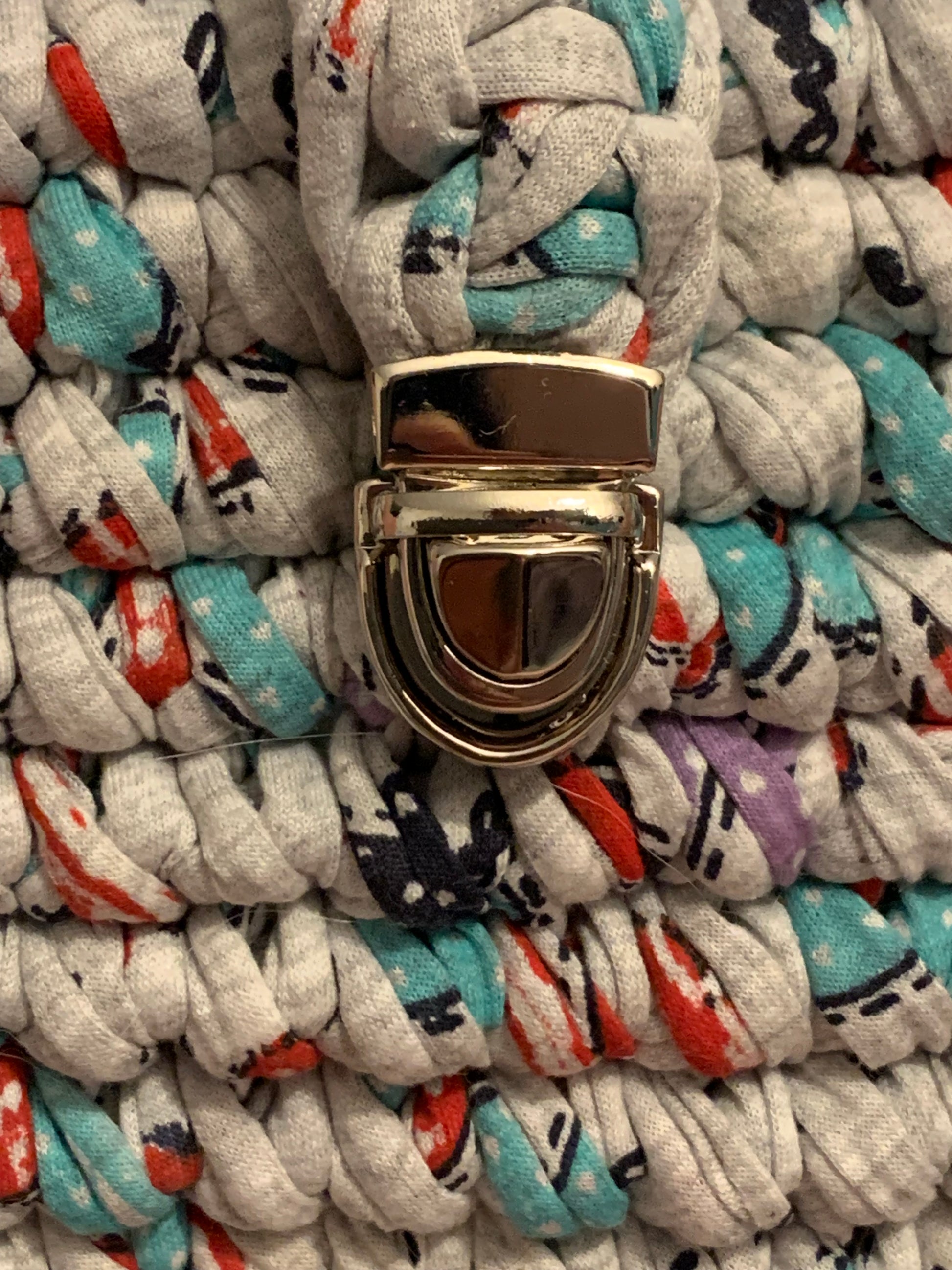 Le modèle Clara s’habille d’un crochet multicolore original et pétillant. Son fond gris est relevé de touches rouges et turquoise, créant un effet graphique moderne et dynamique. La fermeture métallique dorée apporte une touche chic, tandis que la large bandoulière grise garantit confort et praticité.