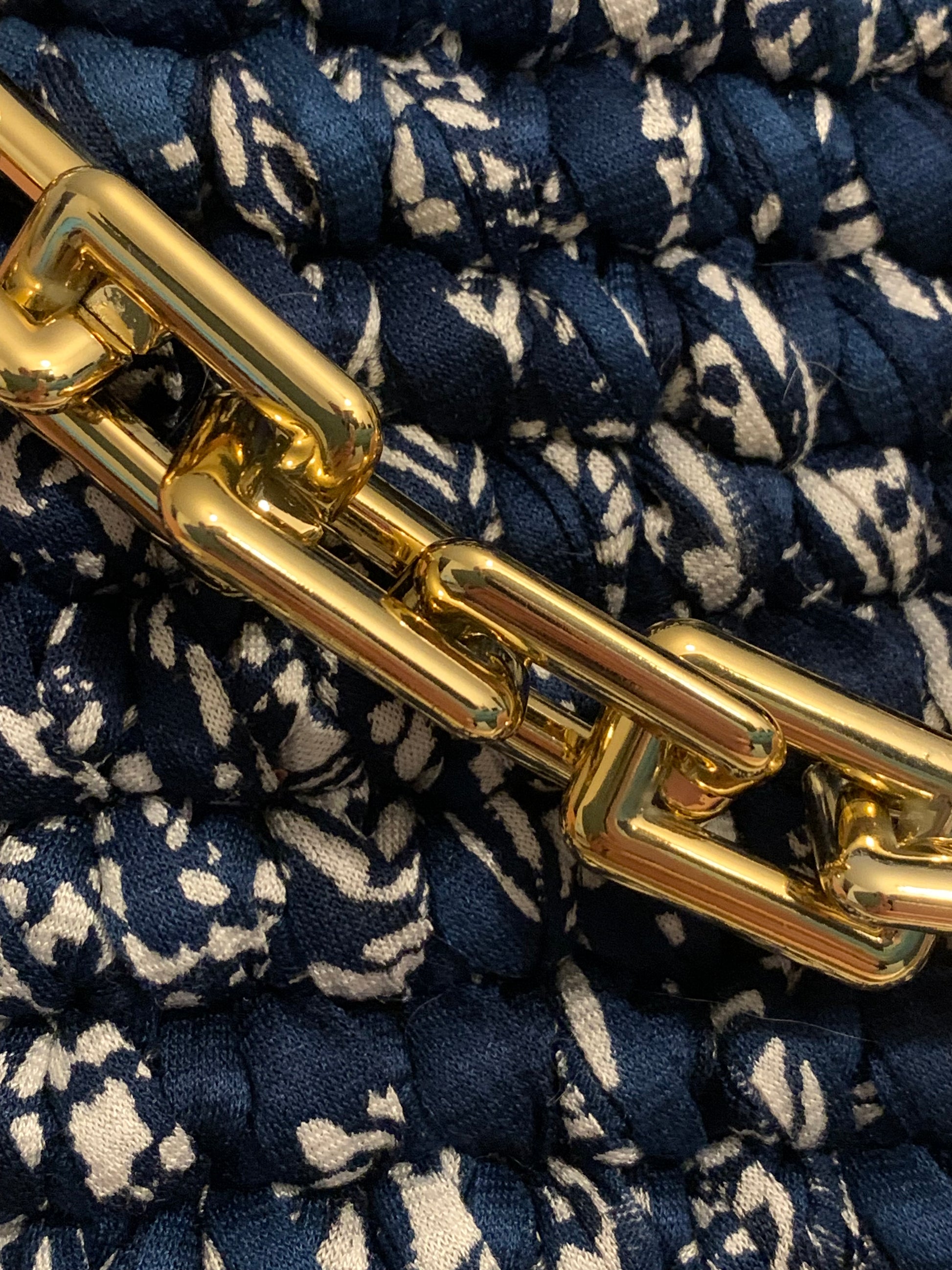 Il est sublimé par une chaîne dorée scintillante, qui lui apporte une touche de luxe et d’élégance.