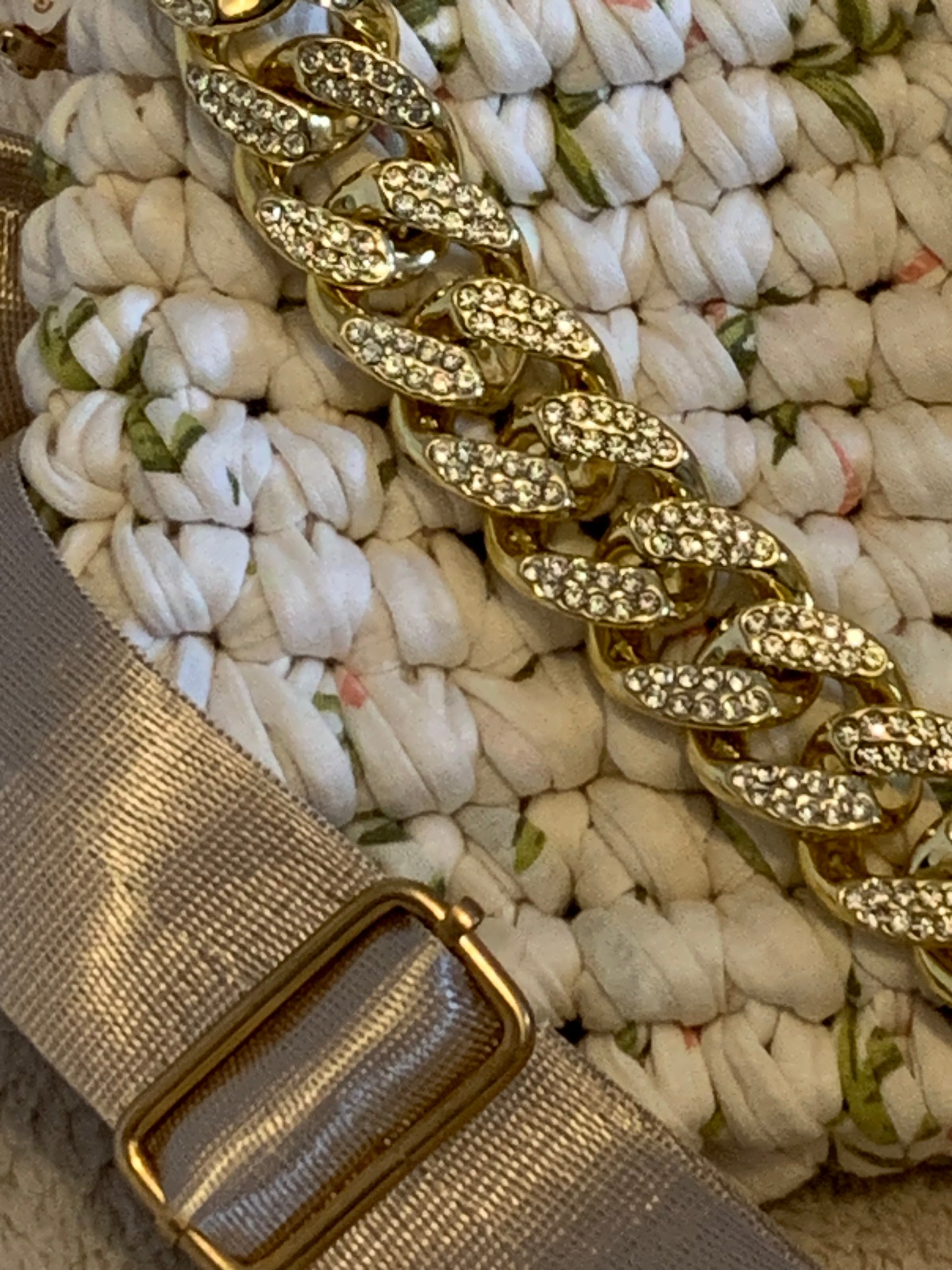 Détails : Chaîne dorée brillante incrustée de strass.