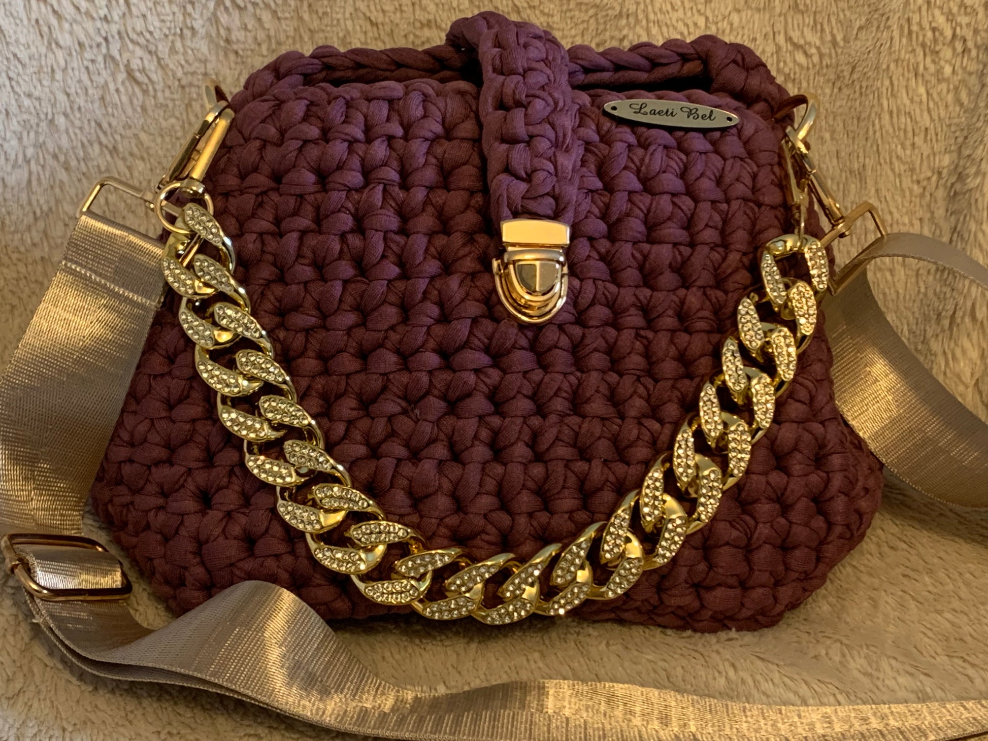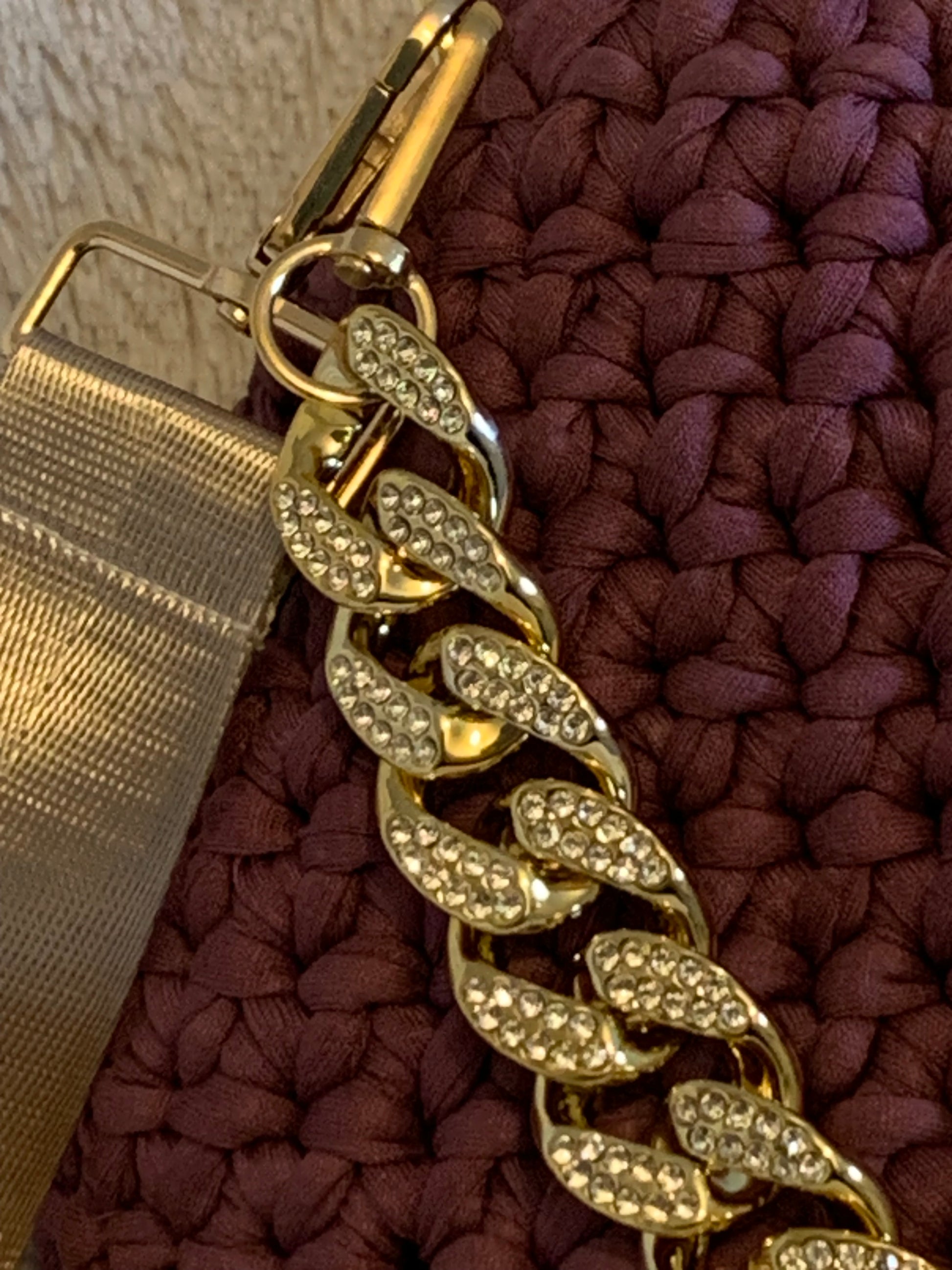 Le Clara bordeaux est un sac en crochet fait main, alliant élégance intemporelle et détails luxueux. Sa couleur profonde et chaleureuse s’associe parfaitement à sa chaîne dorée ornée de strass, pour un rendu chic et sophistiqué.