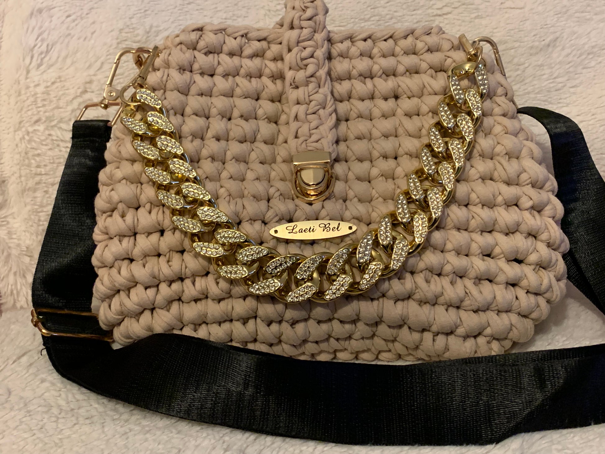 Le sac Clara en beige est l’allié parfait des femmes en quête de raffinement et de modernité. Son crochet artisanal se marie à une anse luxueuse en chaîne dorée sertie de strass, apportant éclat et sophistication. Sa large bandoulière noire, pratique et confortable, permet de le porter au quotidien tout en restant chic.