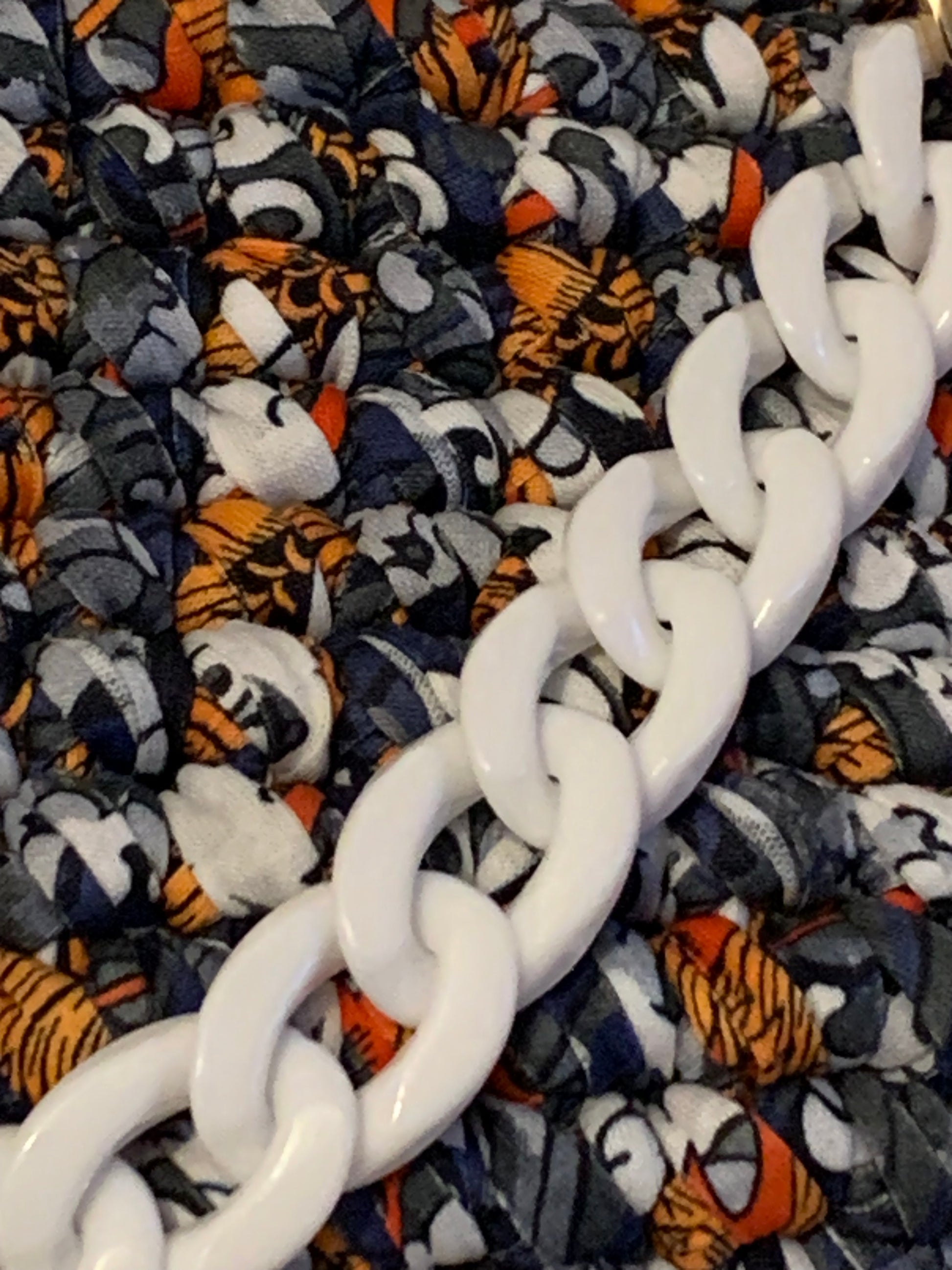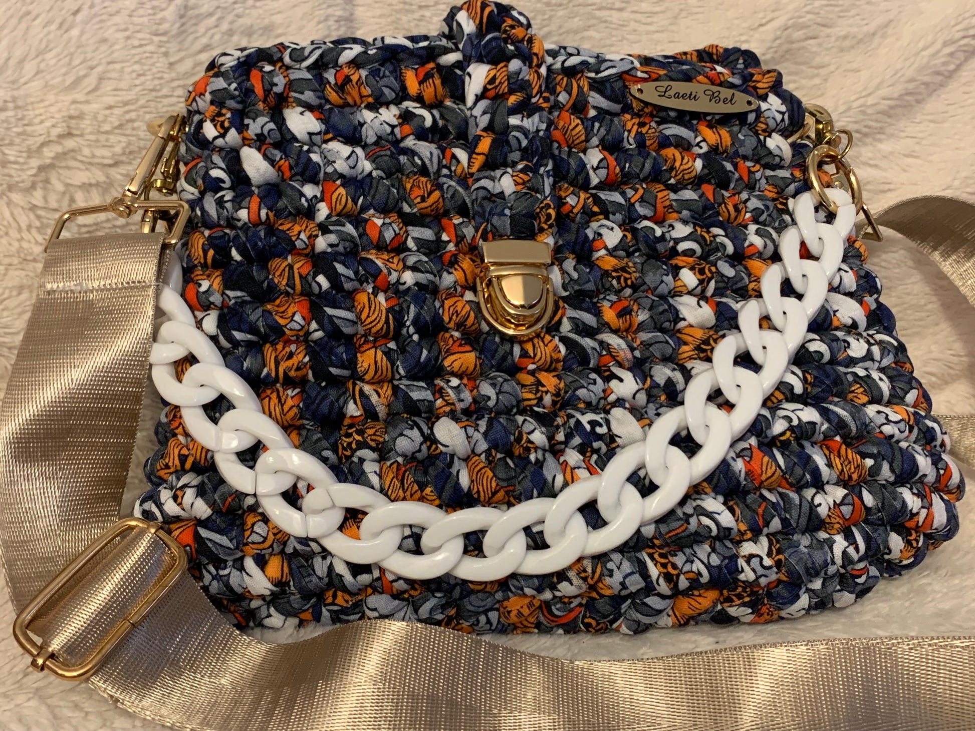 Le sac Clara en tissu crocheté multicolore bleu marine, orange et blanc est une véritable pièce de caractère. Sa texture artisanale et ses motifs originaux lui confèrent une allure vibrante et élégante. La chaîne blanche oversize ajoute une touche moderne et tendance, tandis que la large bandoulière dorée satinée permet un porté confortable et chic.