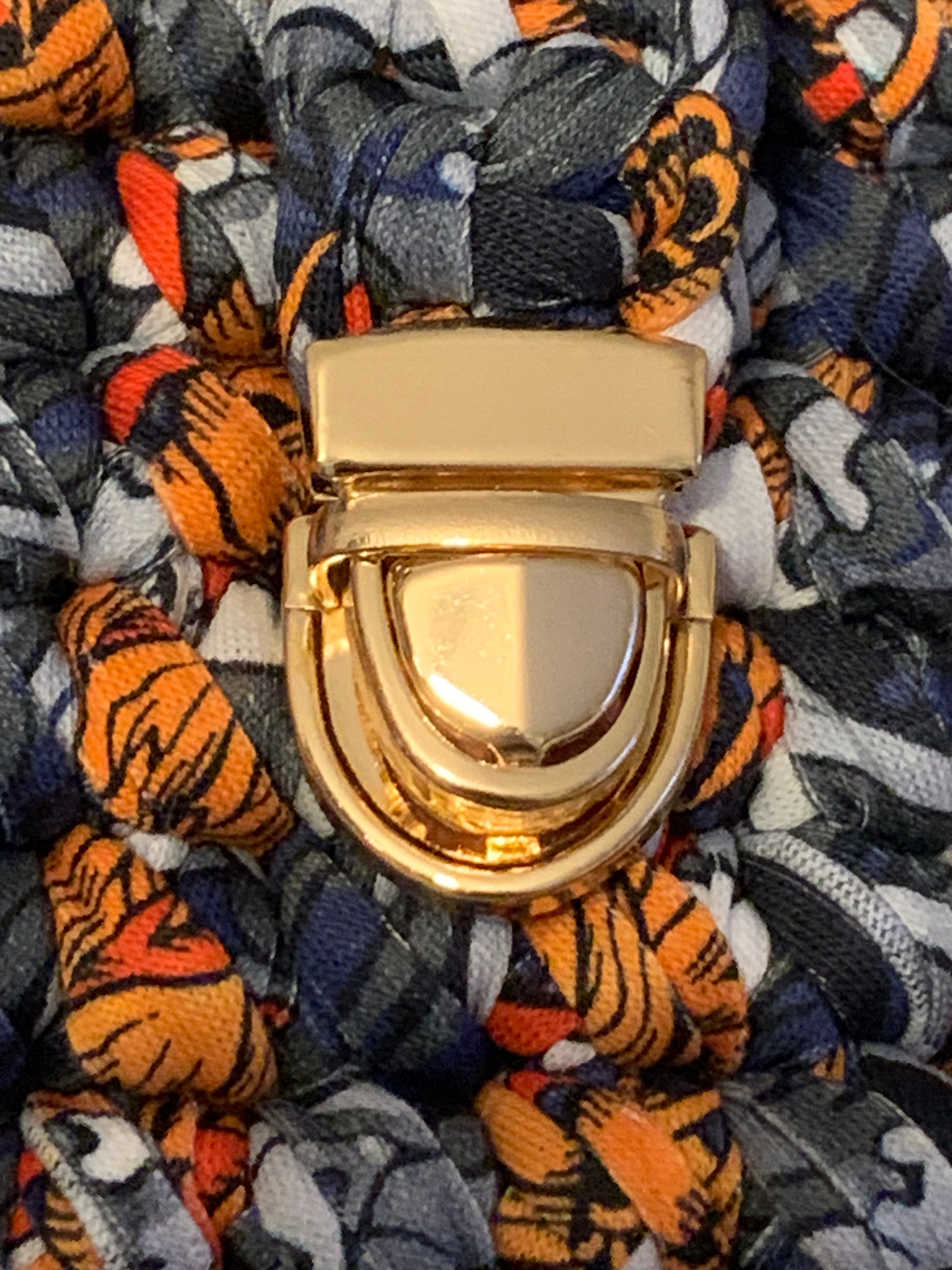 Sac à main Clara – Tissu Imprimé Bleu & Orange avec Chaîne Blanche
