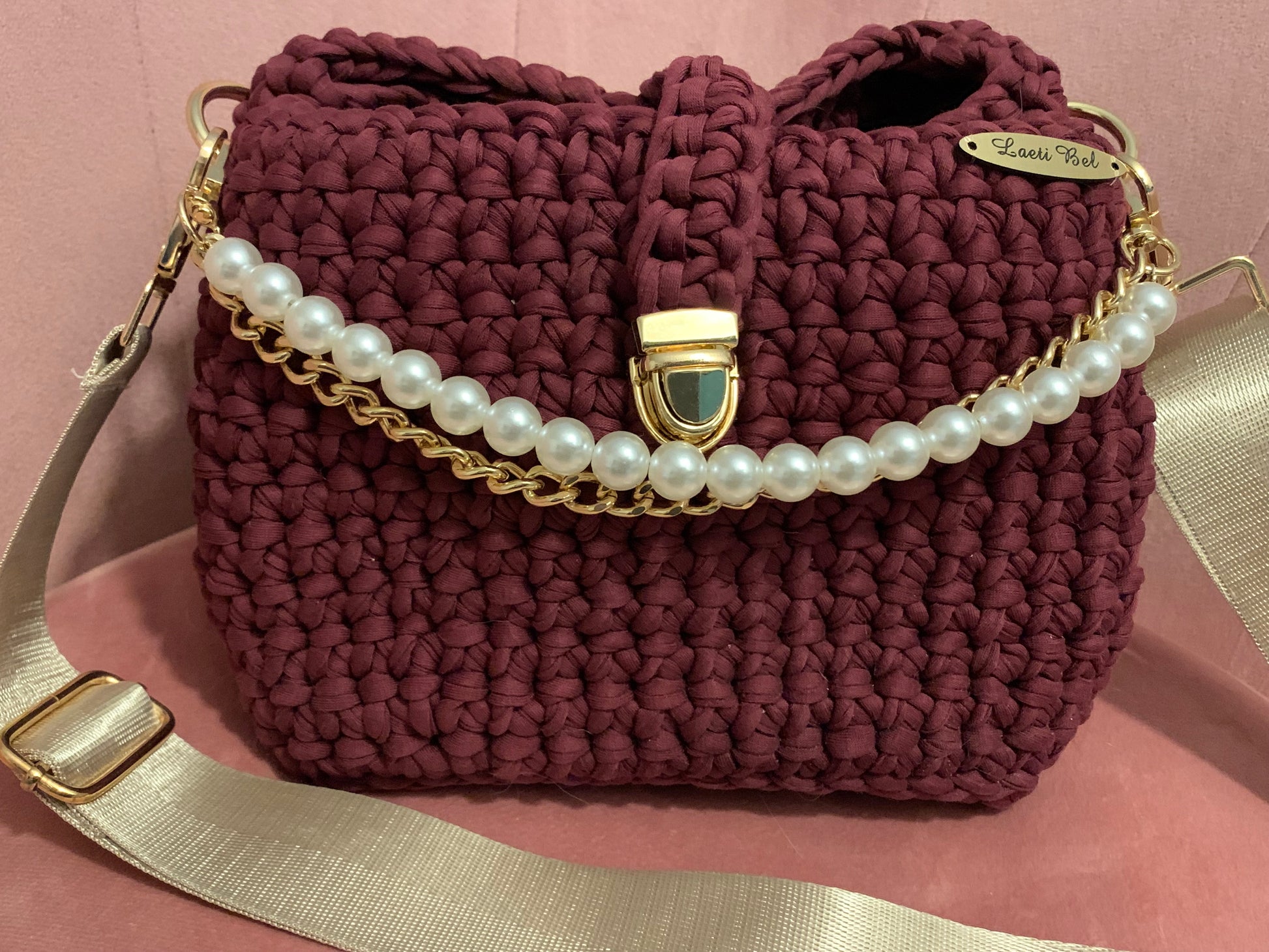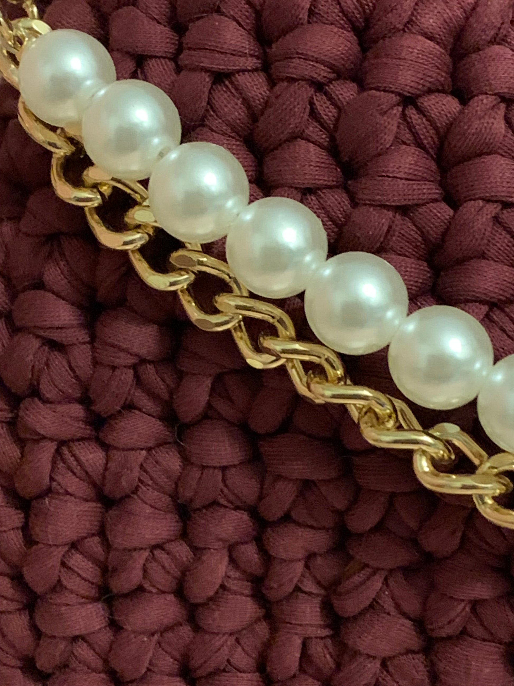 Le modèle Clara incarne l’élégance féminine avec une touche sophistiquée. Crocheté à la main dans un fil bordeaux profond, il séduit par son raffinement et sa modernité. Sa bandoulière dorée se marie parfaitement avec la chaîne décorative ornée de perles blanches, ajoutant un éclat luxueux et intemporel.