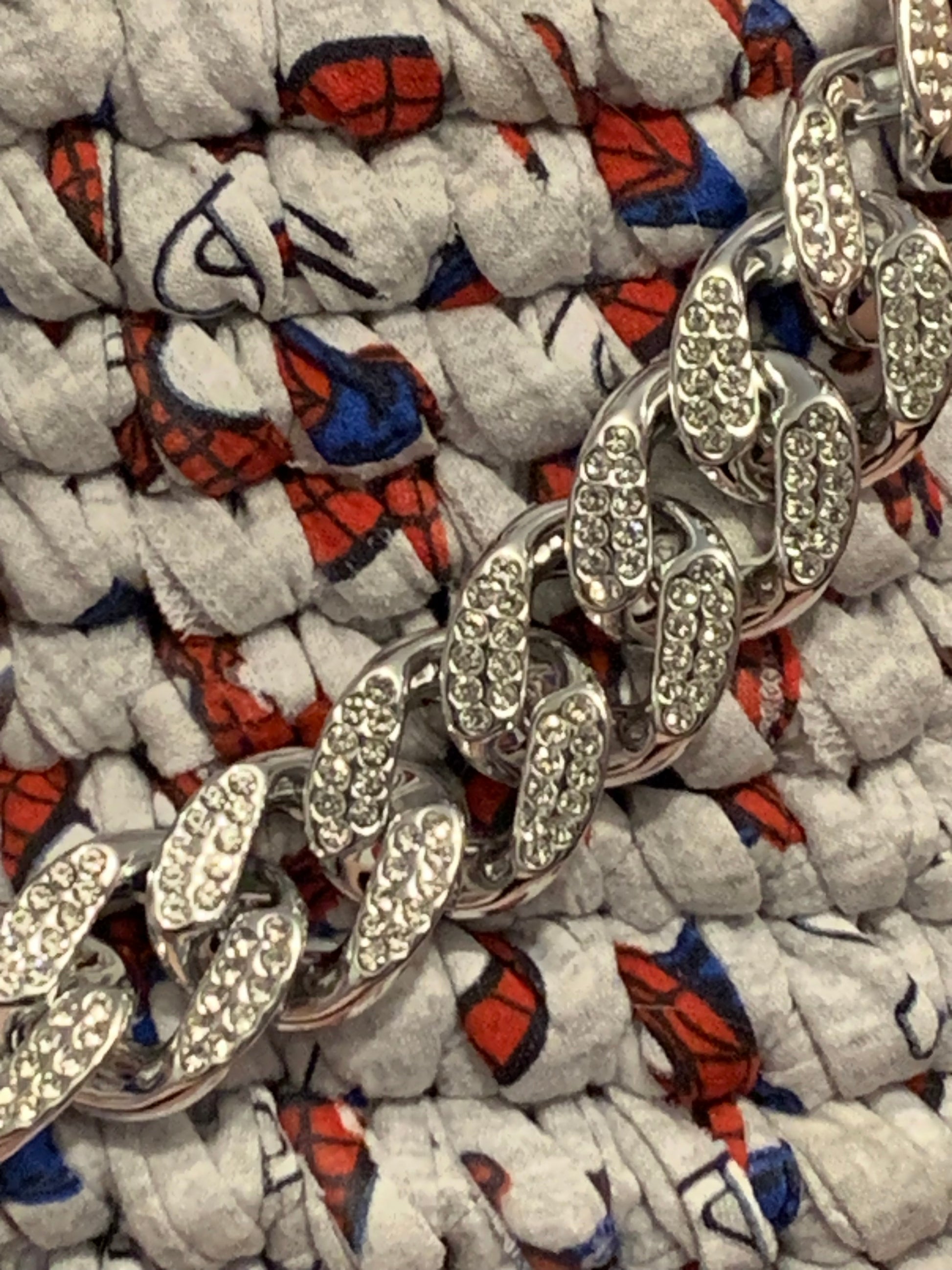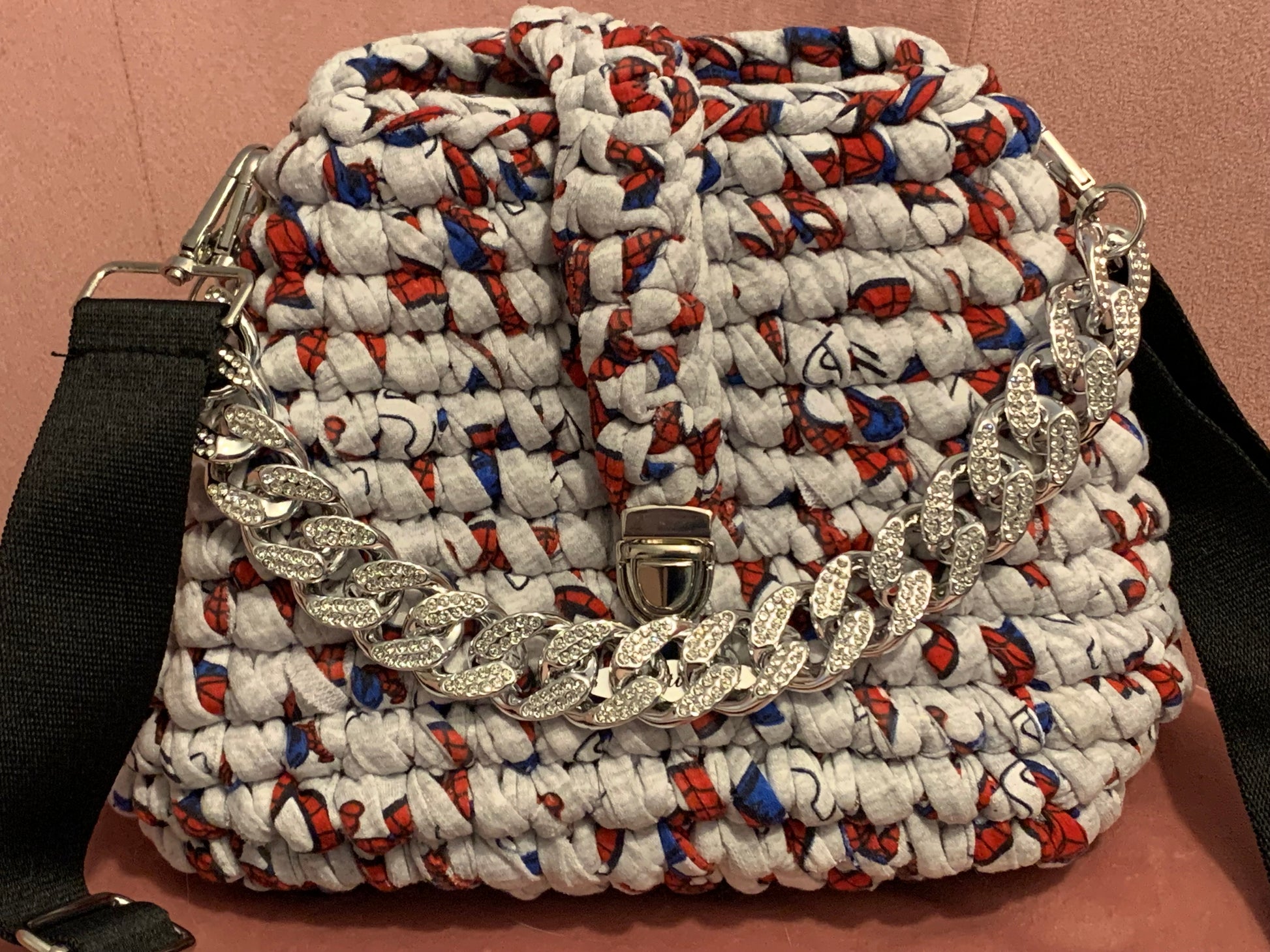 Le modèle Clara se distingue par son audace et son originalité. Confectionné en crochet artisanal à partir d’un fil imprimé blanc, rouge et bleu, il attire tous les regards par son effet graphique et moderne. La large chaîne argentée sertie de strass ajoute une touche glamour, tandis que la bandoulière noire apporte confort et contraste.