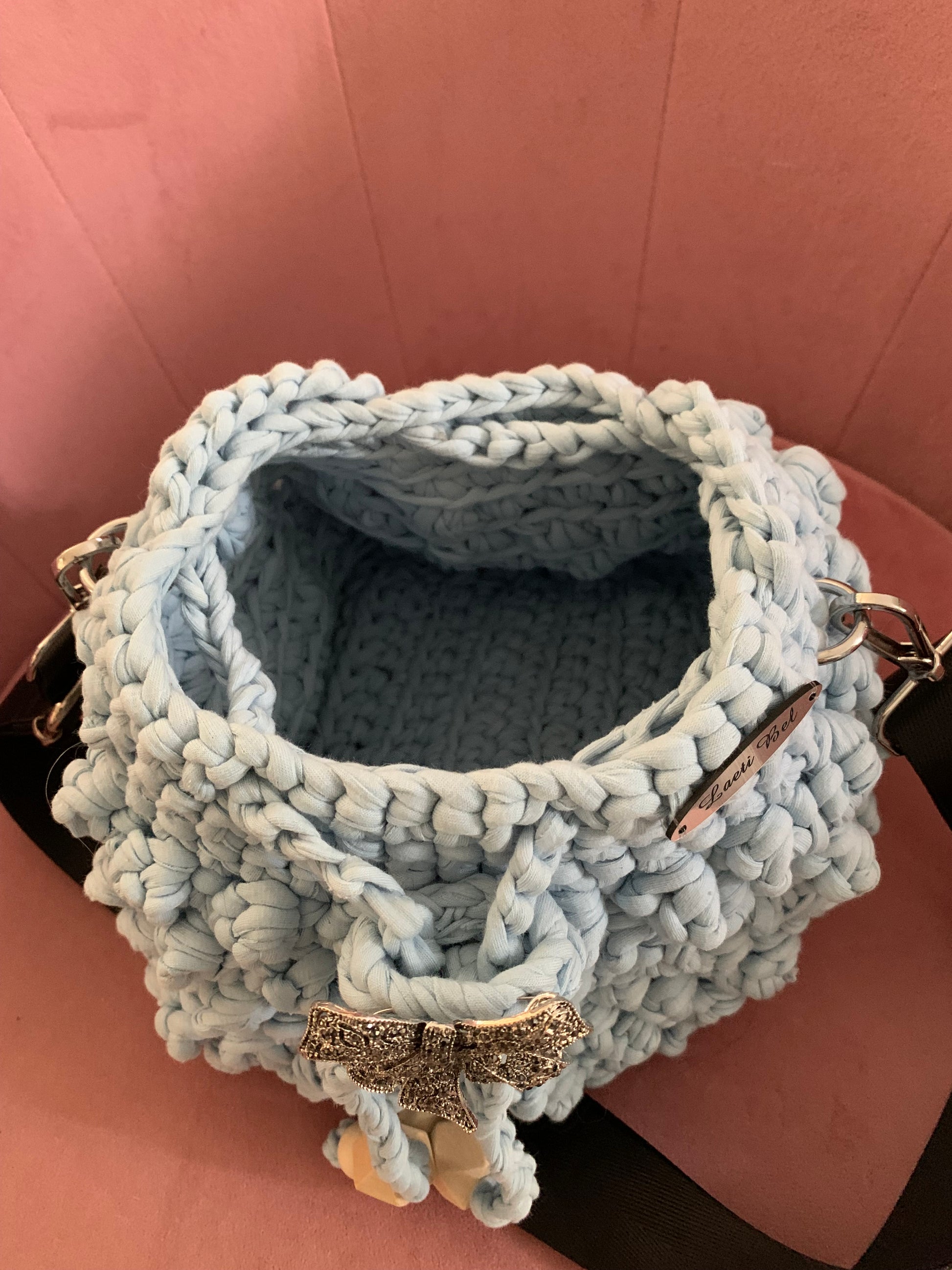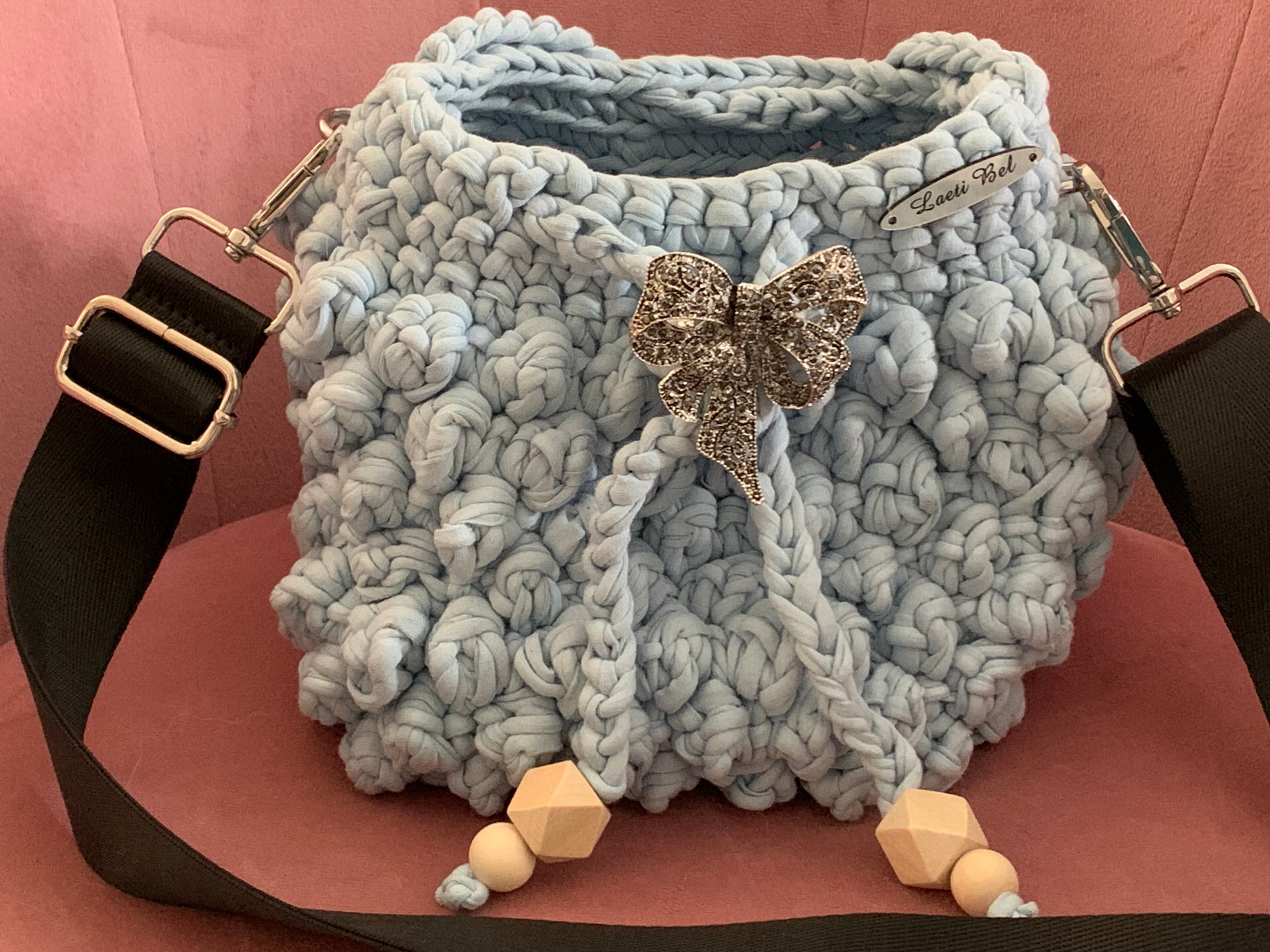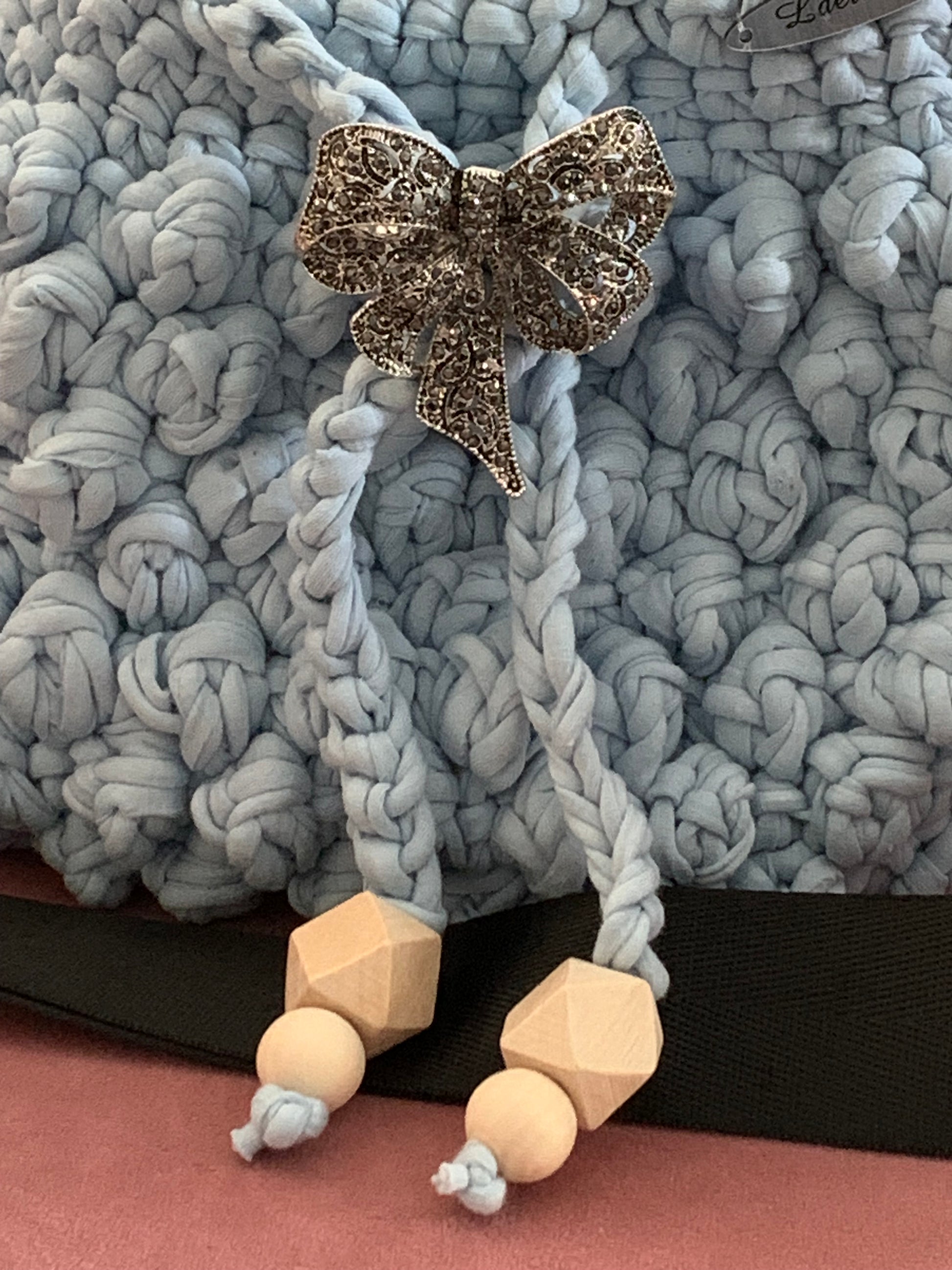 Le sac Cloé bleu pastel est une pièce artisanale crochetée à la main, pensée pour les femmes qui veulent allier douceur et sophistication. Sa teinte ciel poudré lui confère un style délicat et tendance, tandis que le nœud bijou argenté scintillant apporte une touche glamour.