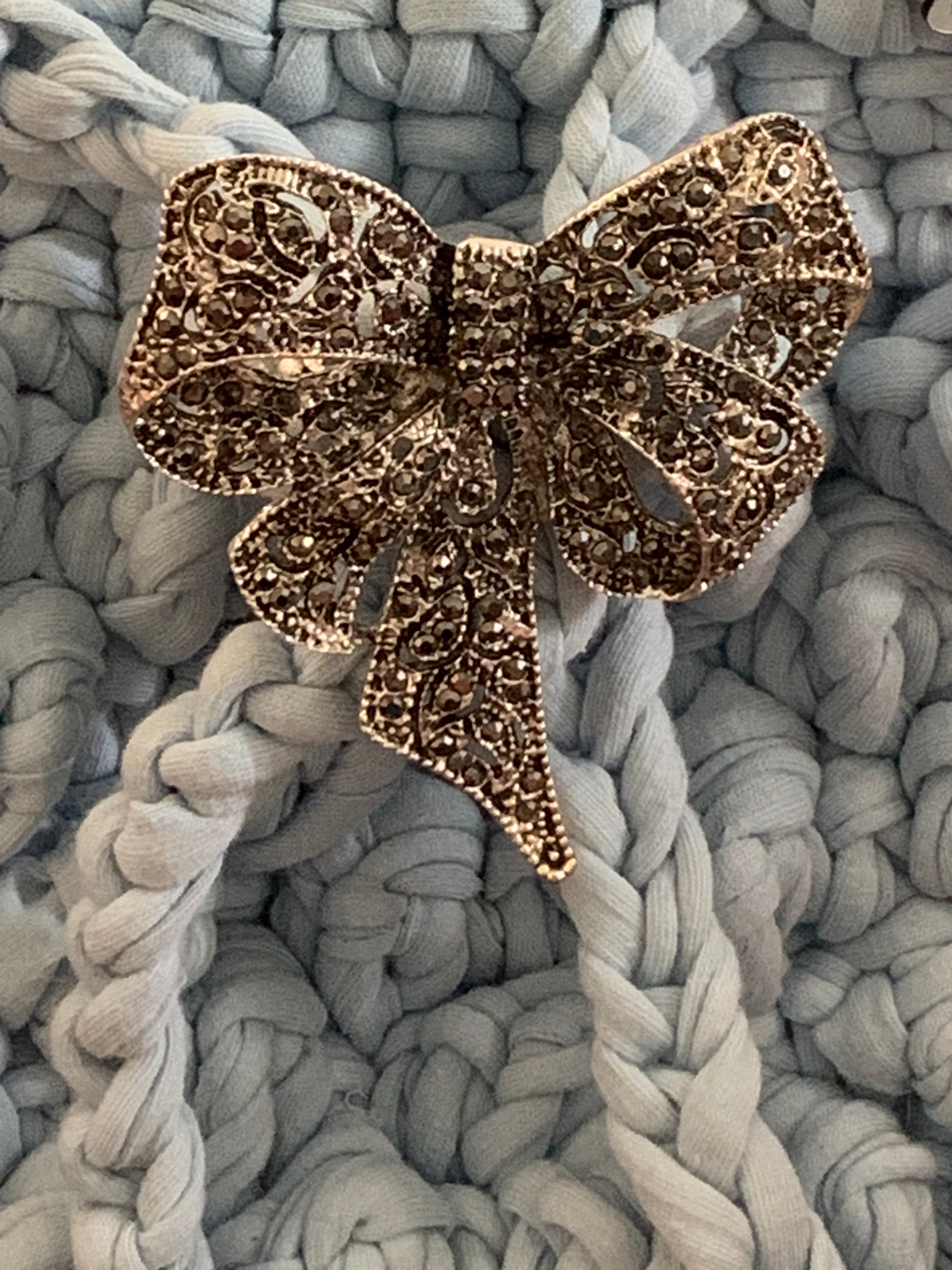 Détails : Broche nœud argentée incrustée de strass + cordons avec perles géométriques.