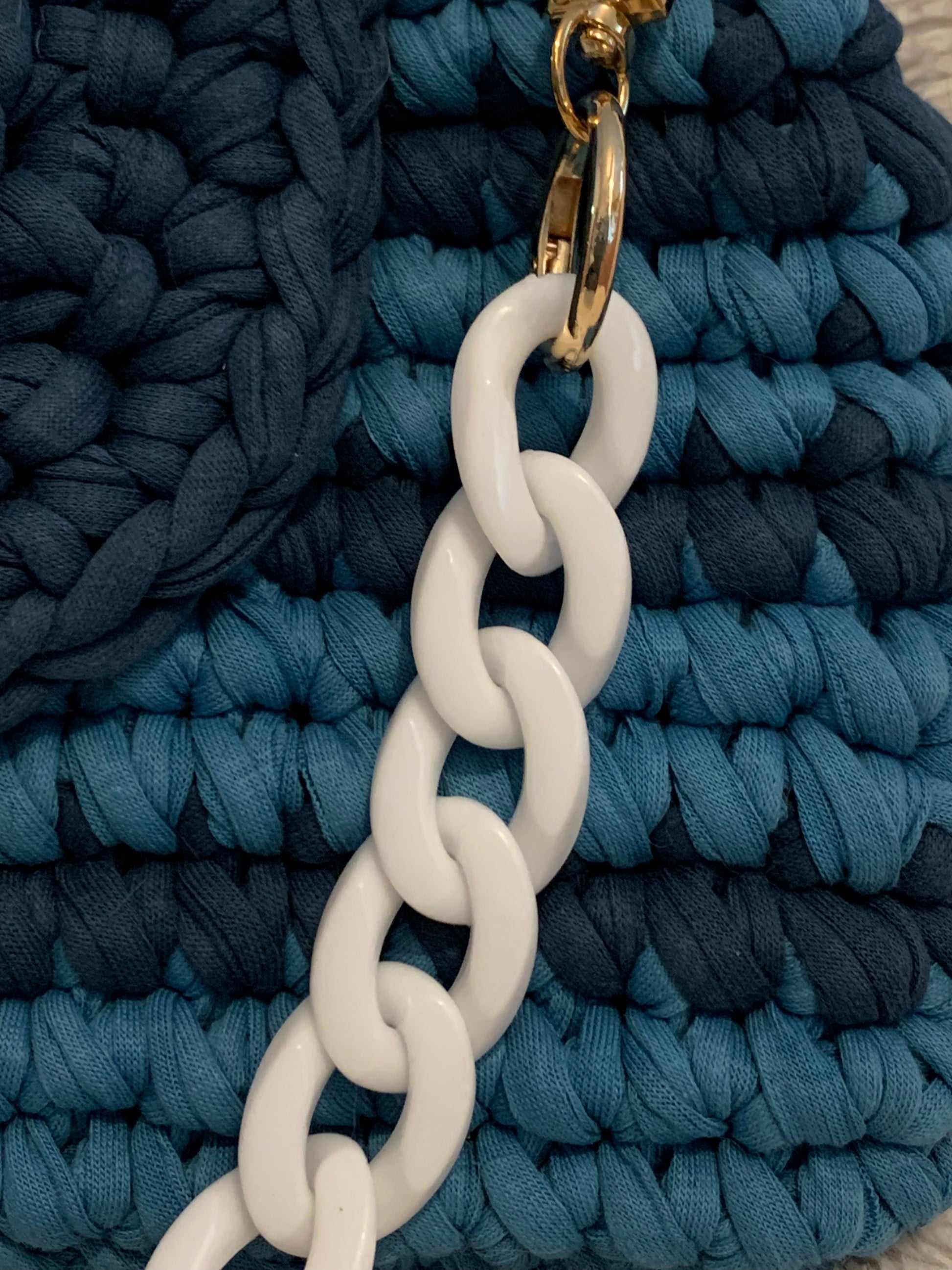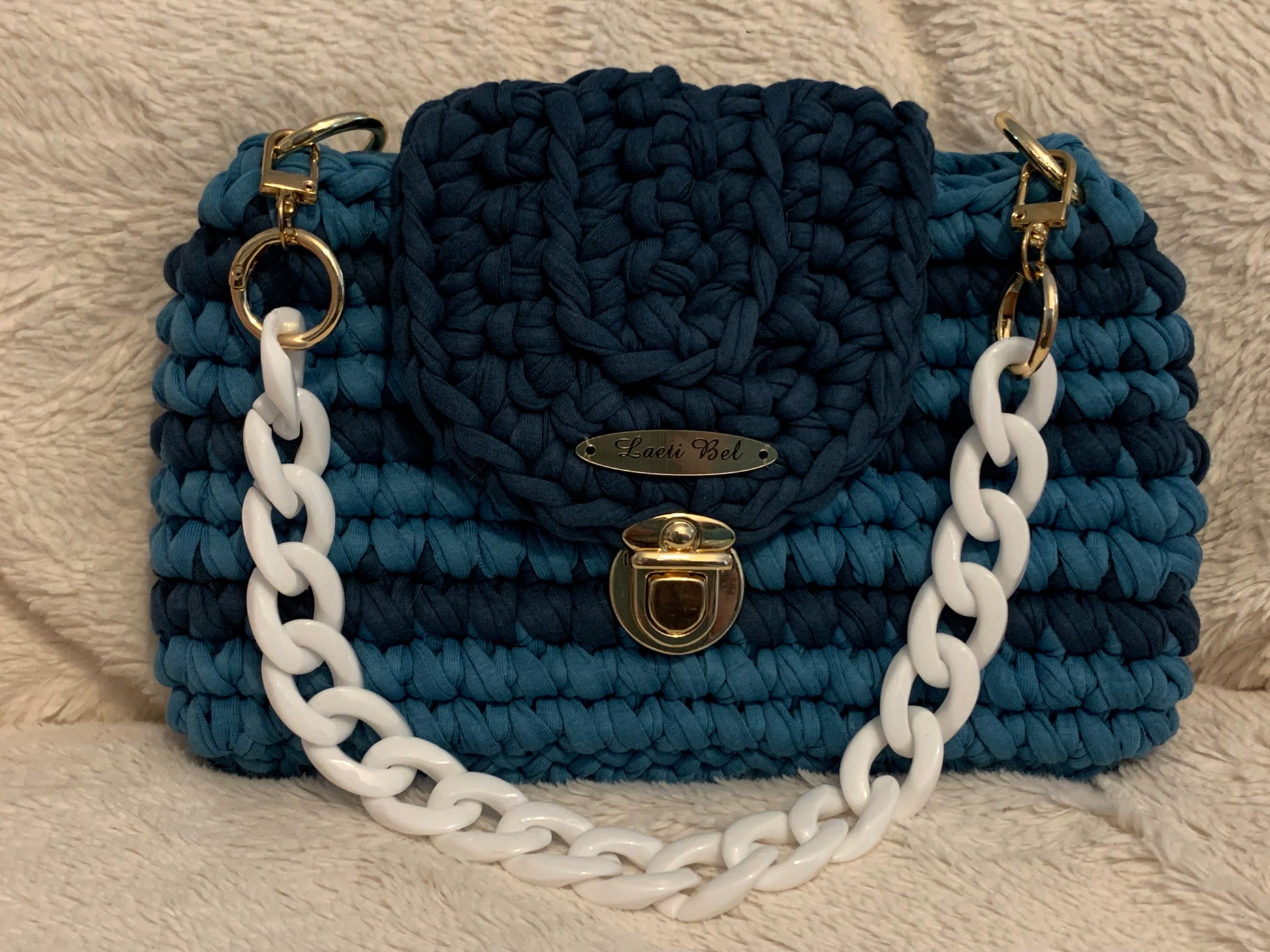 Le sac Emma séduit par son dégradé élégant de bleu nuit et bleu lagune, travaillé au crochet artisanal. Sa poignée en chaîne blanche contrastante apporte une touche moderne et tendance, tandis que son fermoir doré et la plaque Laeti Bel renforcent son raffinement. Compact et unique, il se porte aussi bien en journée qu’en soirée.
