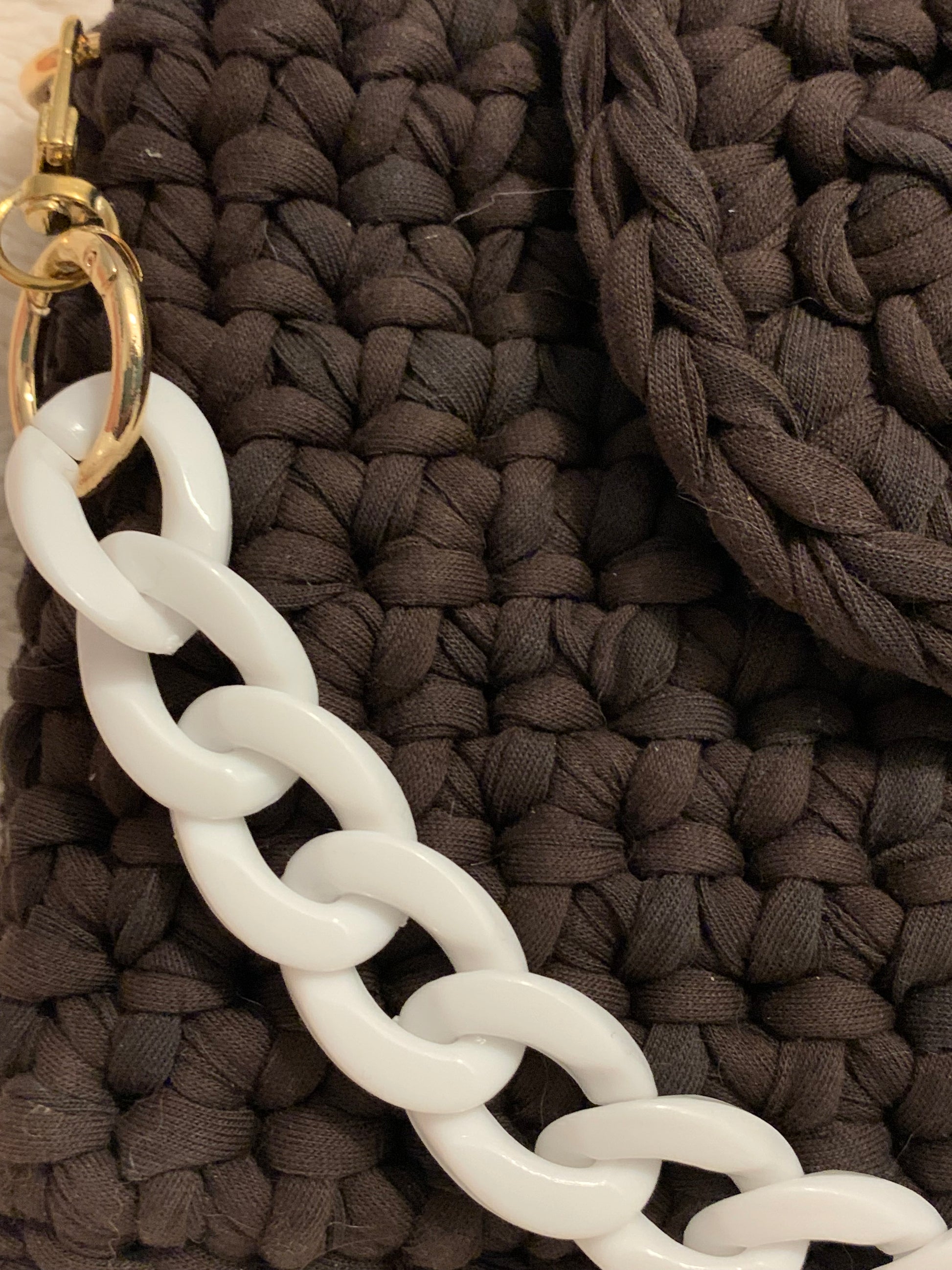 Le modèle Emma se dévoile dans une version sobre et sophistiquée. Entièrement crocheté à la main en fil marron chocolat intense, il incarne à la fois authenticité et élégance. La chaîne en résine blanche apporte une touche de modernité et de contraste lumineux, tandis que la fermeture dorée ajoute une finition raffinée.