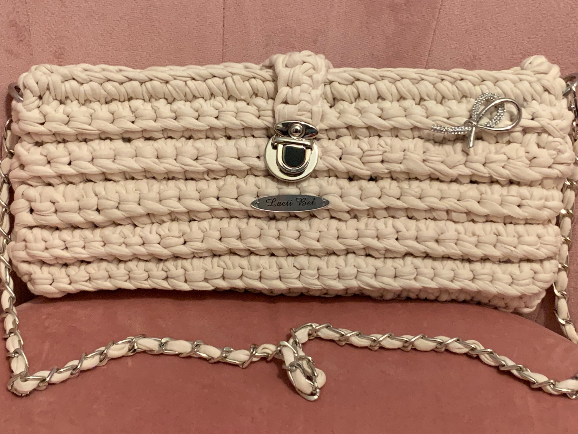Le modèle Eva incarne l’élégance intemporelle avec sa silhouette en crochet artisanal beige. Sa forme rectangulaire allongée lui confère un charme raffiné et moderne, idéal pour accompagner une tenue de soirée ou un look chic au quotidien. La chaîne entrelacée de fil blanc ajoute une finition délicate et féminine, tandis que le bijou décoratif en forme de nœud apporte une touche subtile d’originalité.
