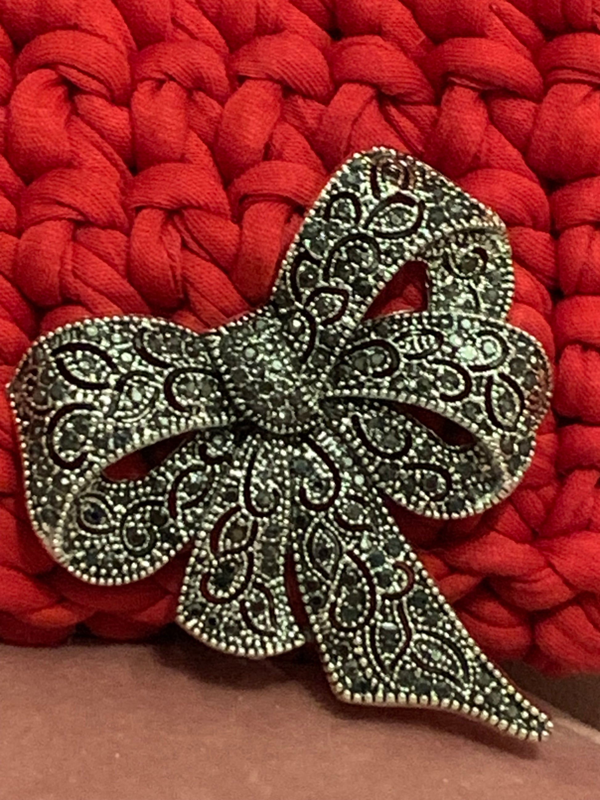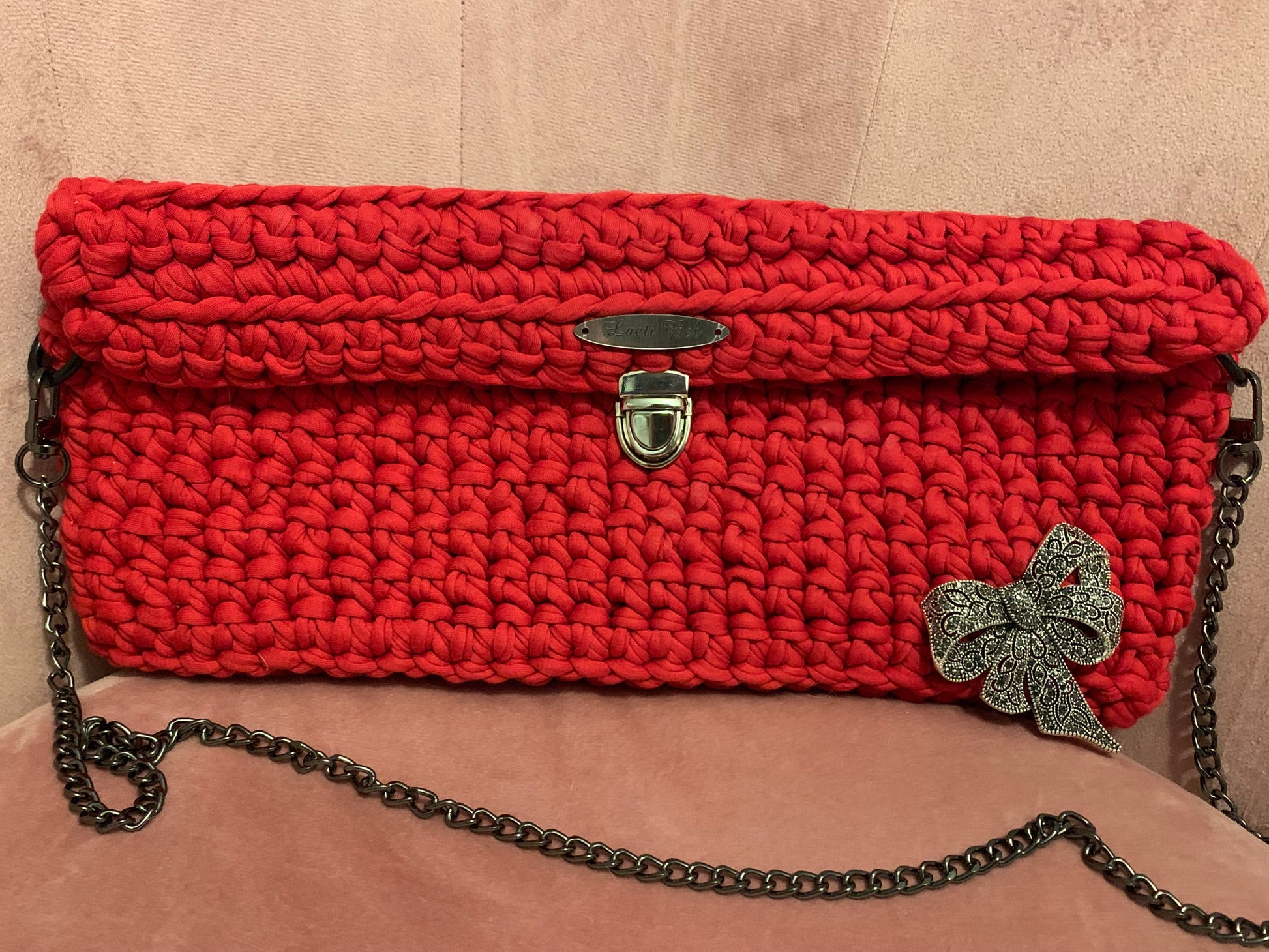 Le modèle Julia se décline dans une version audacieuse et élégante avec son crochet rouge vif, véritable symbole de féminité et de confiance. Sa forme rectangulaire et allongée en fait un accessoire idéal pour les soirées et événements habillés. La chaîne métallique sombre renforce son caractère chic et moderne, tandis que le bijou en forme de nœud argenté apporte une note glamour et raffinée.