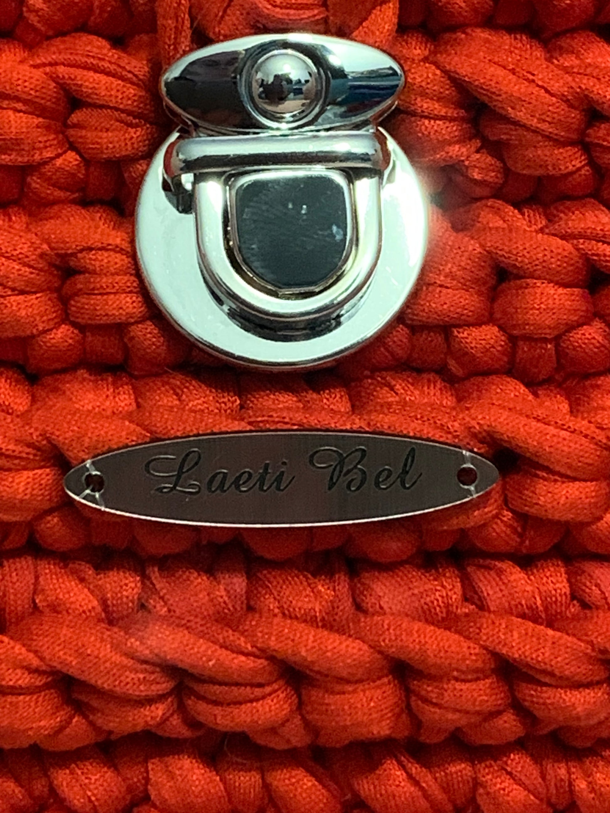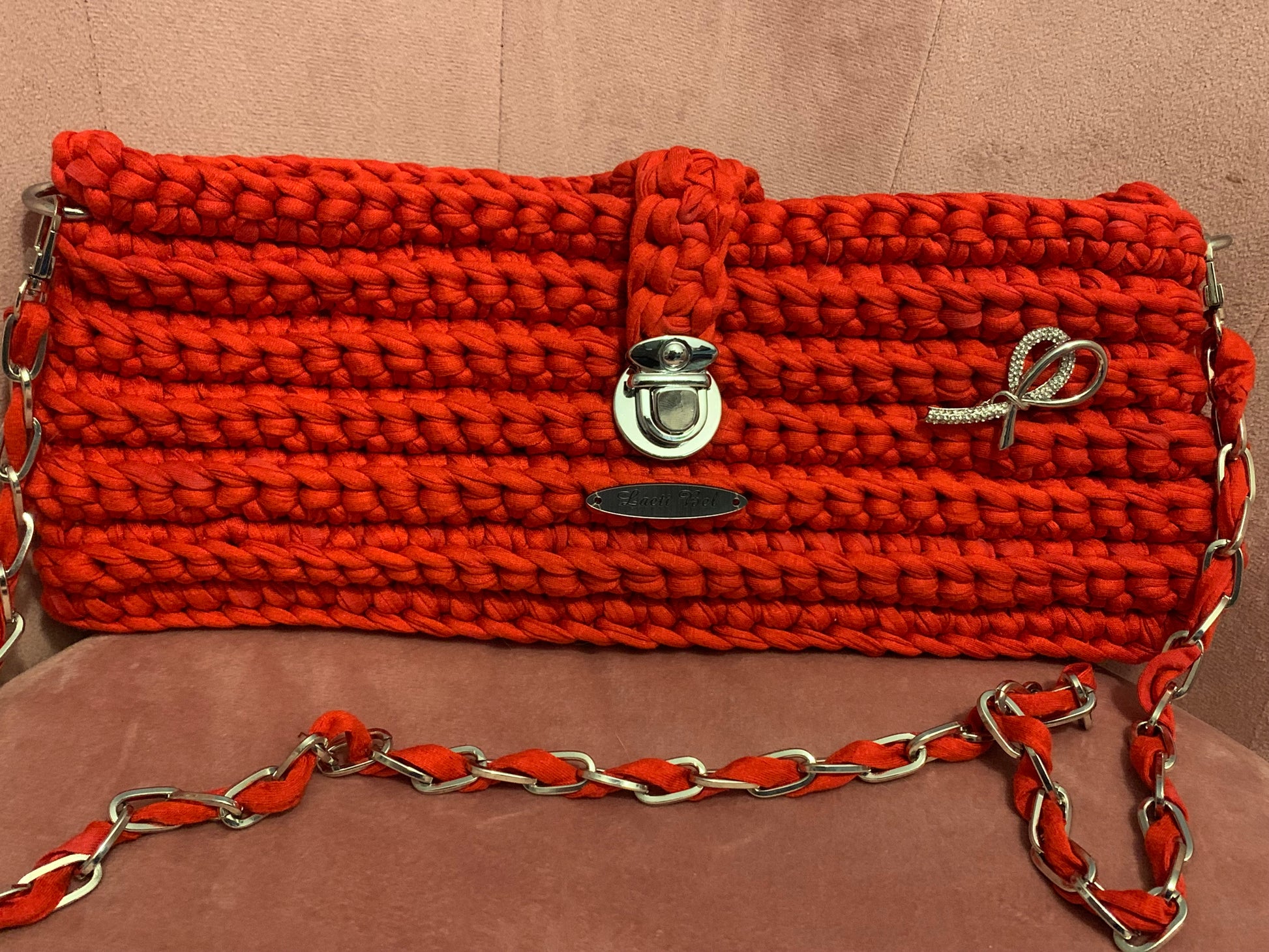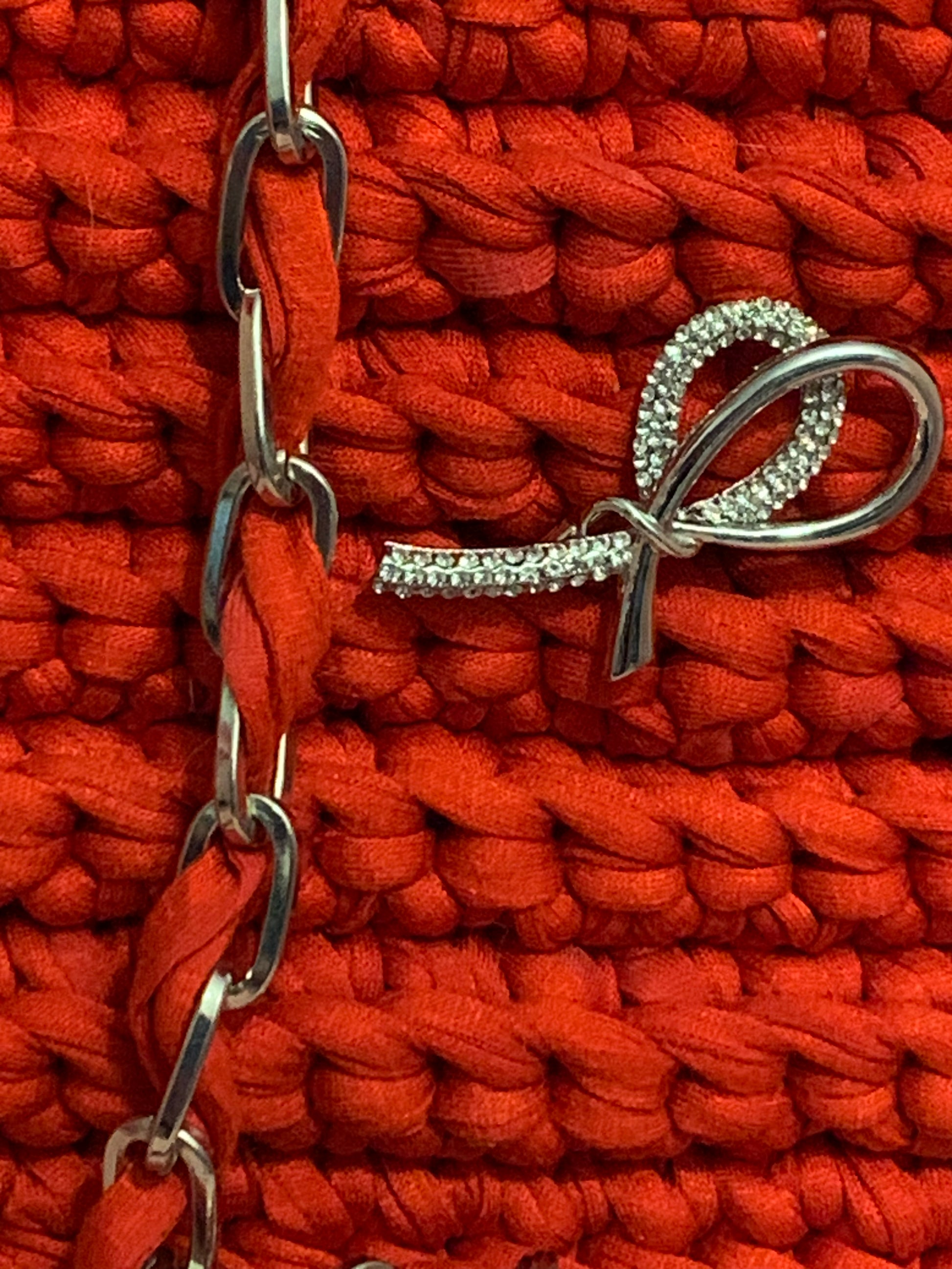 Le modèle Eva s’habille d’un rouge éclatant et intense, symbole de passion et d’élégance. Sa silhouette allongée en crochet artisanal met en valeur une finition soignée, complétée par une chaîne tissée de fil rouge pour un effet raffiné et tendance. Le bijou décoratif en forme de nœud strassé apporte une touche féminine et glamour, idéale pour illuminer vos tenues de soirée.