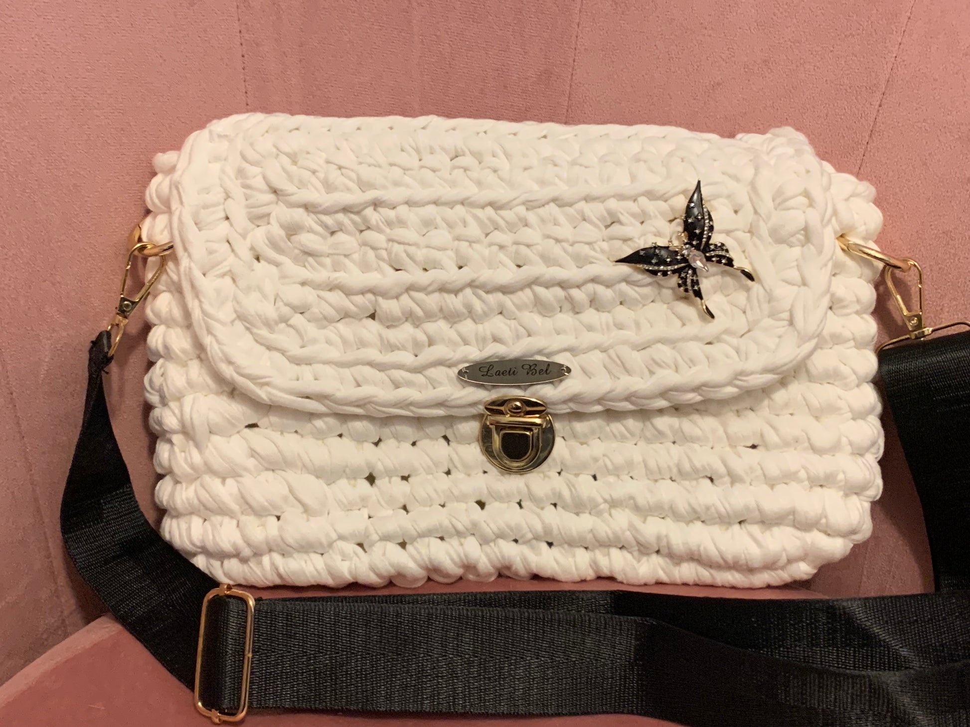 Élégant et intemporel, le sac Julia séduit par son blanc pur et lumineux. Son fermoir doré et son papillon noir serti de strass apportent une touche sophistiquée et raffinée, idéale pour accompagner aussi bien une tenue chic que décontractée.