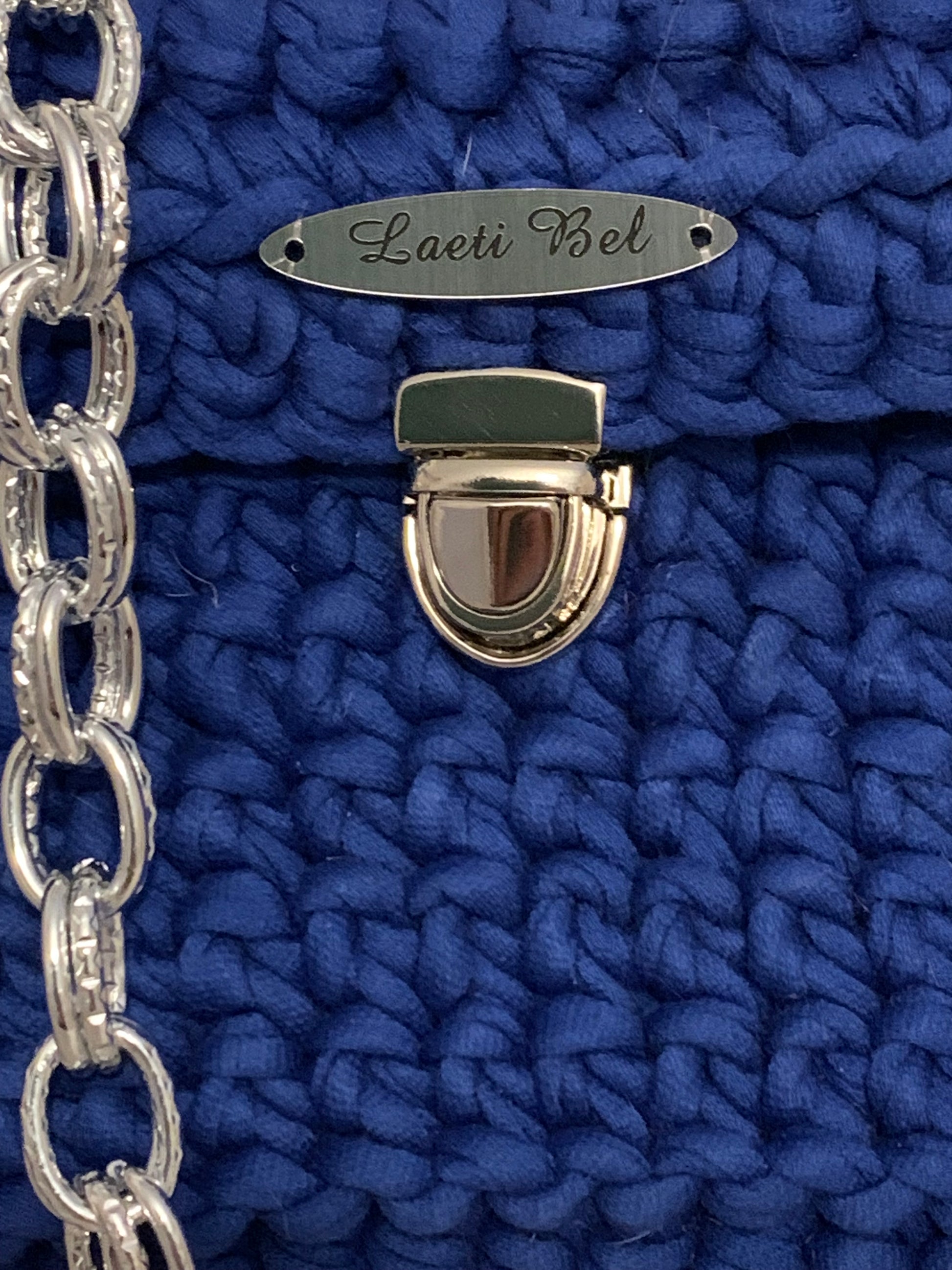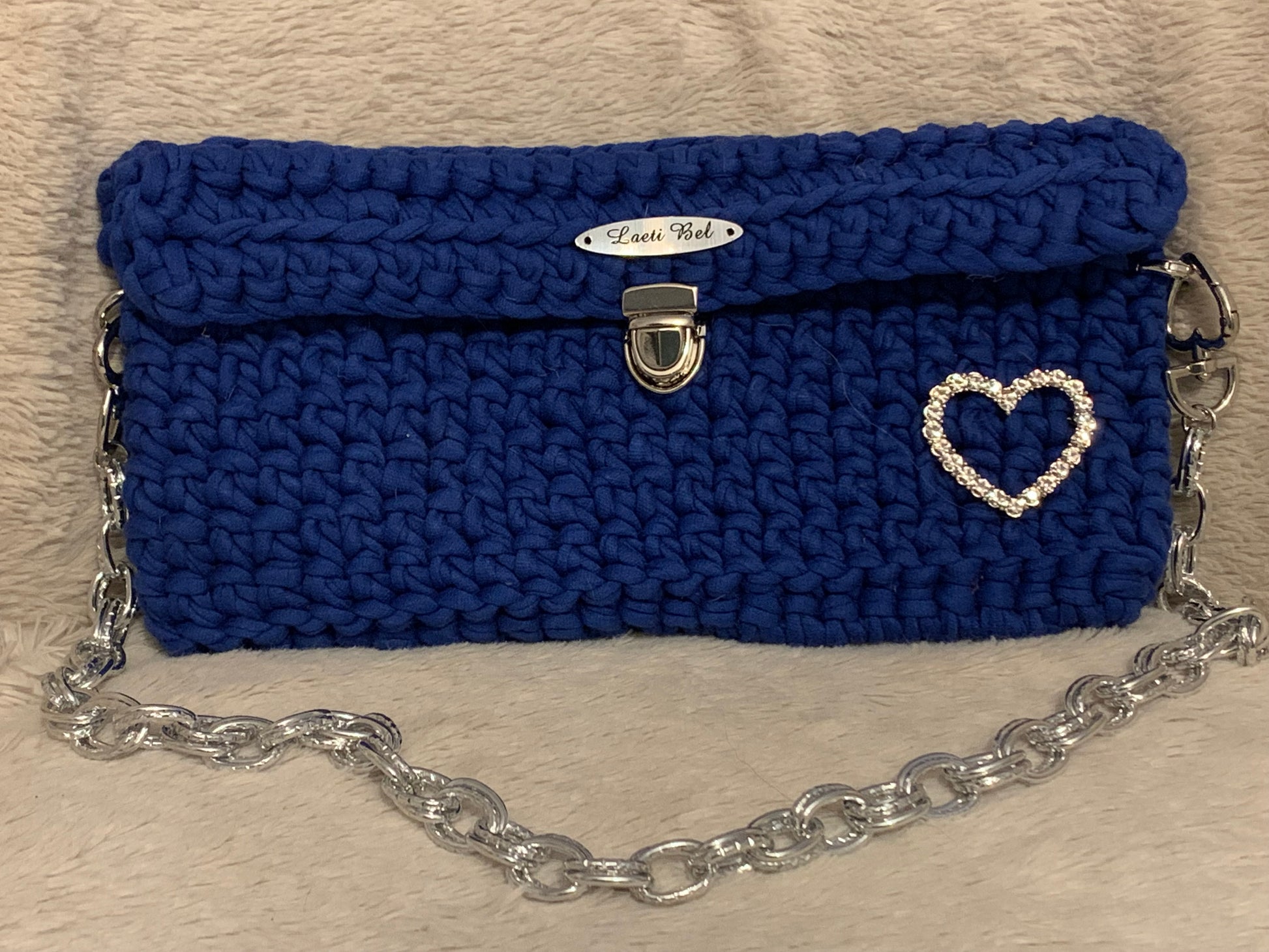 Le sac Julia en crochet bleu royal est un accessoire raffiné qui allie modernité et élégance. Sa teinte profonde attire le regard, tandis que la chaîne en métal argenté et le fermoir assorti renforcent son allure chic. Le bijou en forme de cœur incrusté de strass apporte une touche glamour et précieuse.