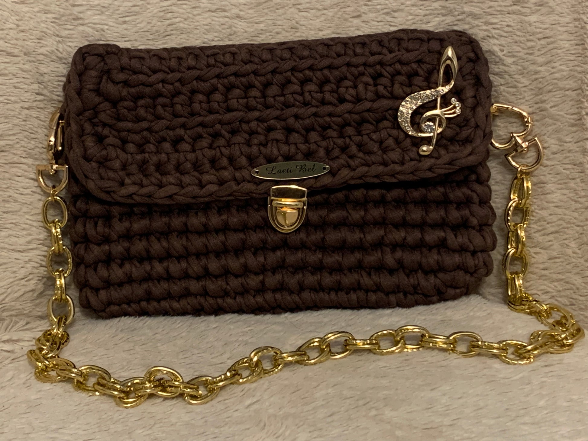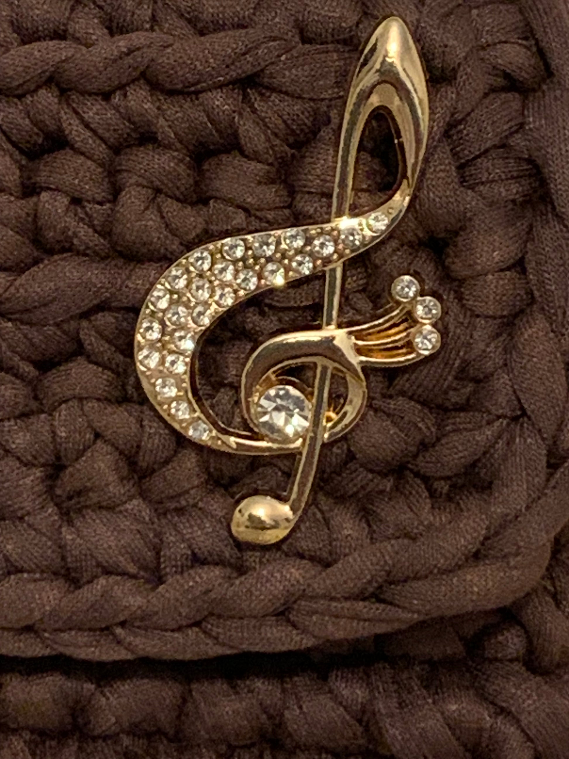 Le sac Julia en crochet marron est un accessoire à la fois sobre et raffiné. Sa teinte profonde et élégante en fait une pièce intemporelle qui se marie avec toutes vos tenues. Sa chaîne dorée et son fermoir assorti ajoutent une touche chic, tandis que le bijou en forme de clé de sol serti de strass lui confère une note artistique et lumineuse.