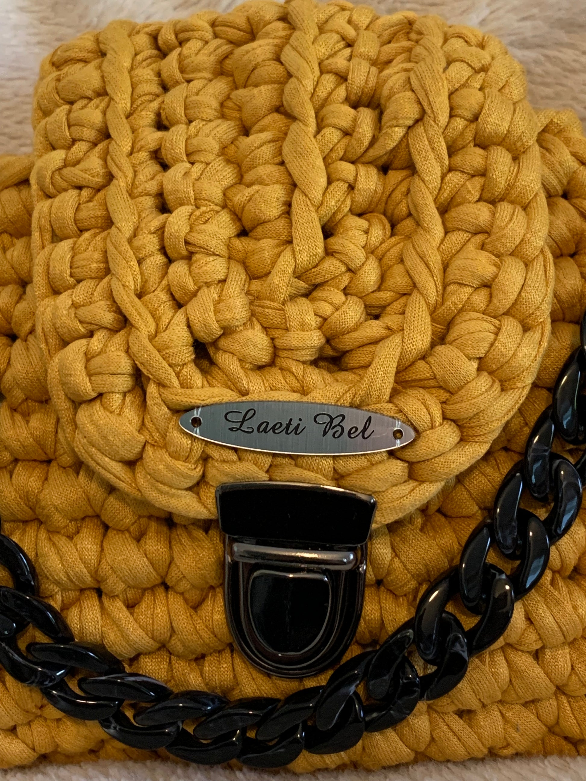 Affirmez votre style avec ce sac à main Léa, confectionné à la main en crochet épais couleur jaune moutarde. Sa texture chaleureuse et robuste apporte un charme unique, tandis que sa chaîne en résine noire et son fermoir métallique noir offrent une touche moderne et sophistiquée.