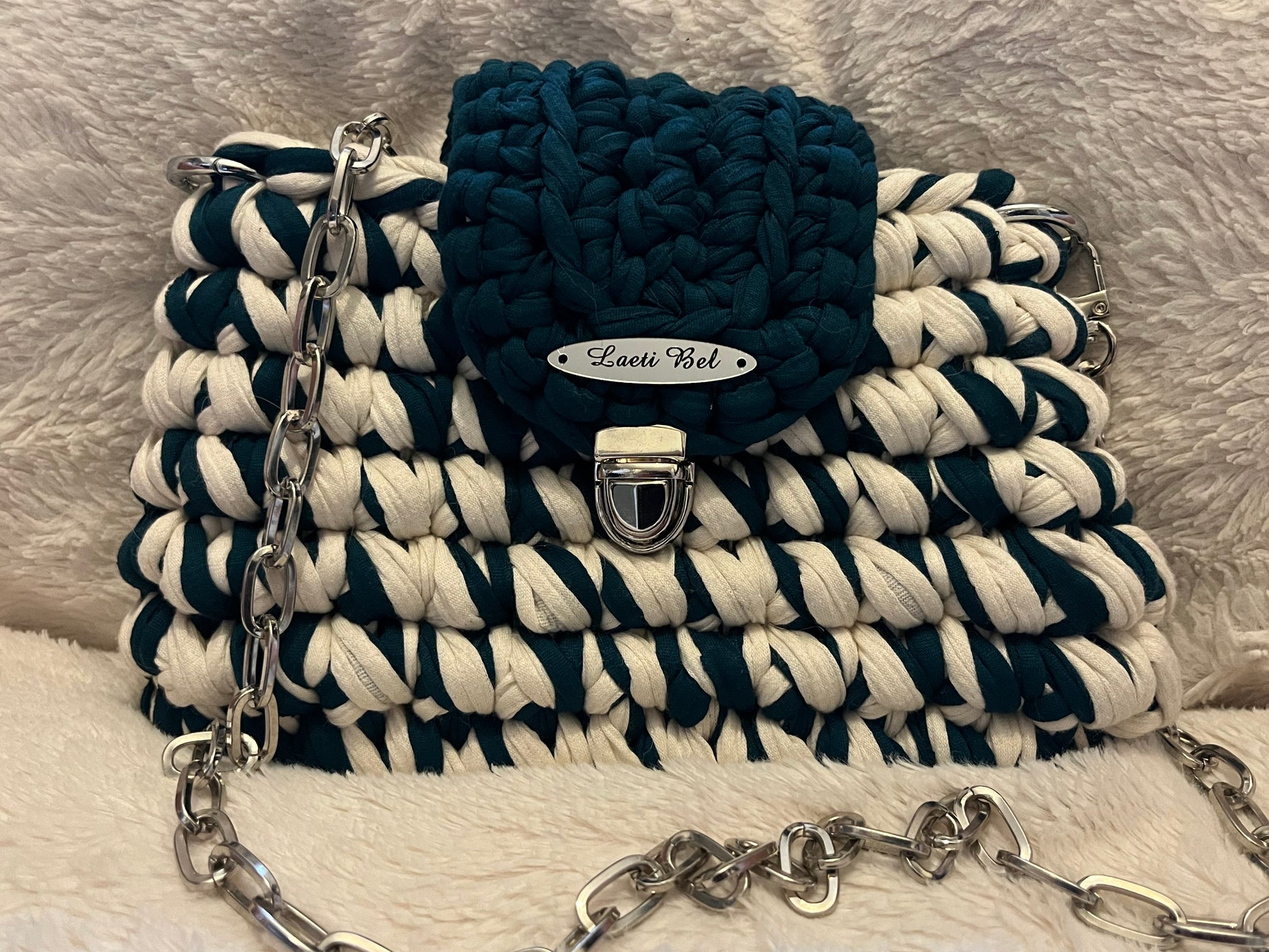 Apportez une touche d’originalité et de fraîcheur à vos tenues avec le sac à main Léa. Ses motifs tressés en vert émeraude et blanc créent un design moderne et lumineux, parfait pour se démarquer. Avec sa chaîne argentée et son rabat contrastant, ce sac artisanal est à la fois chic et unique.