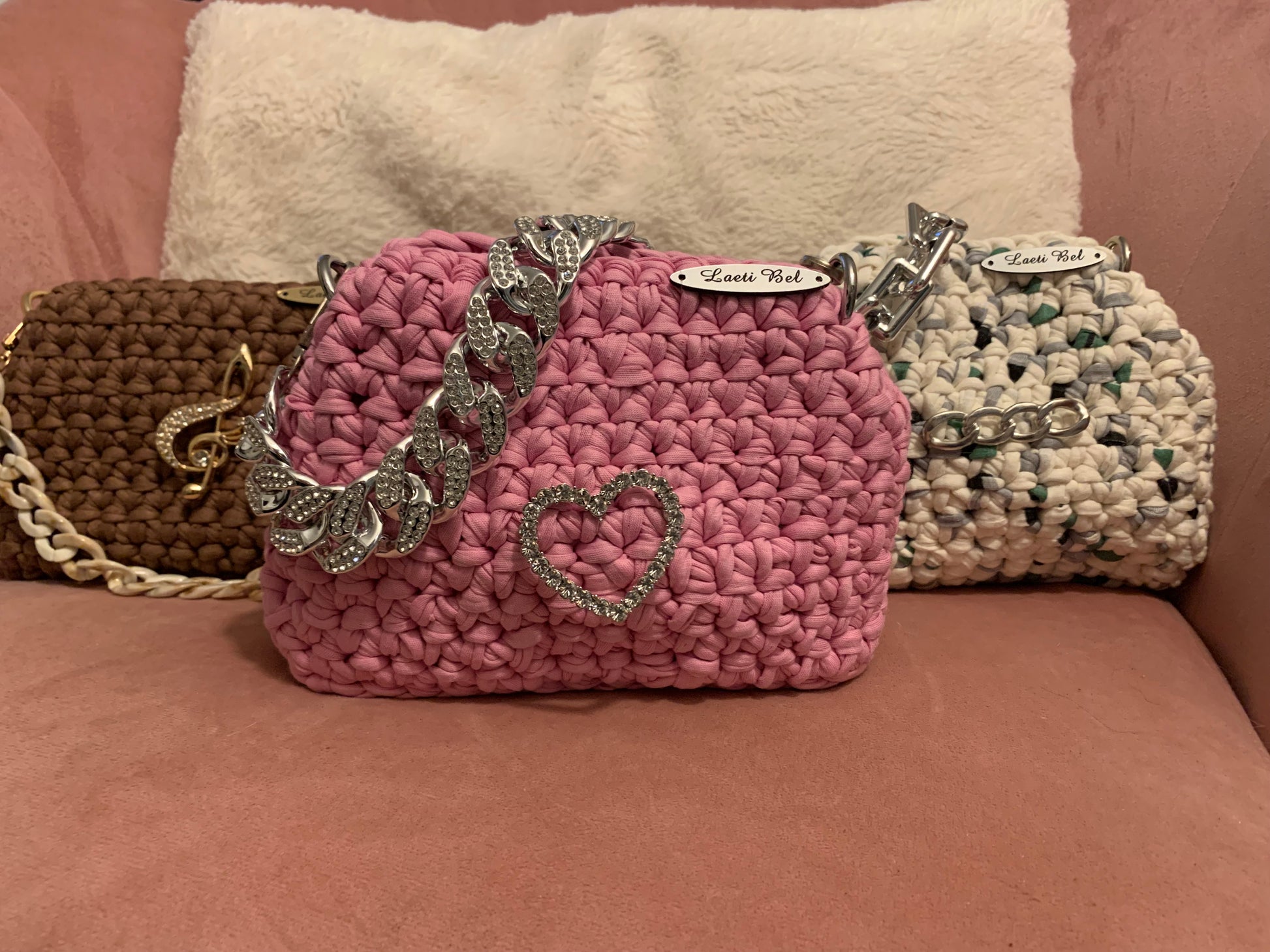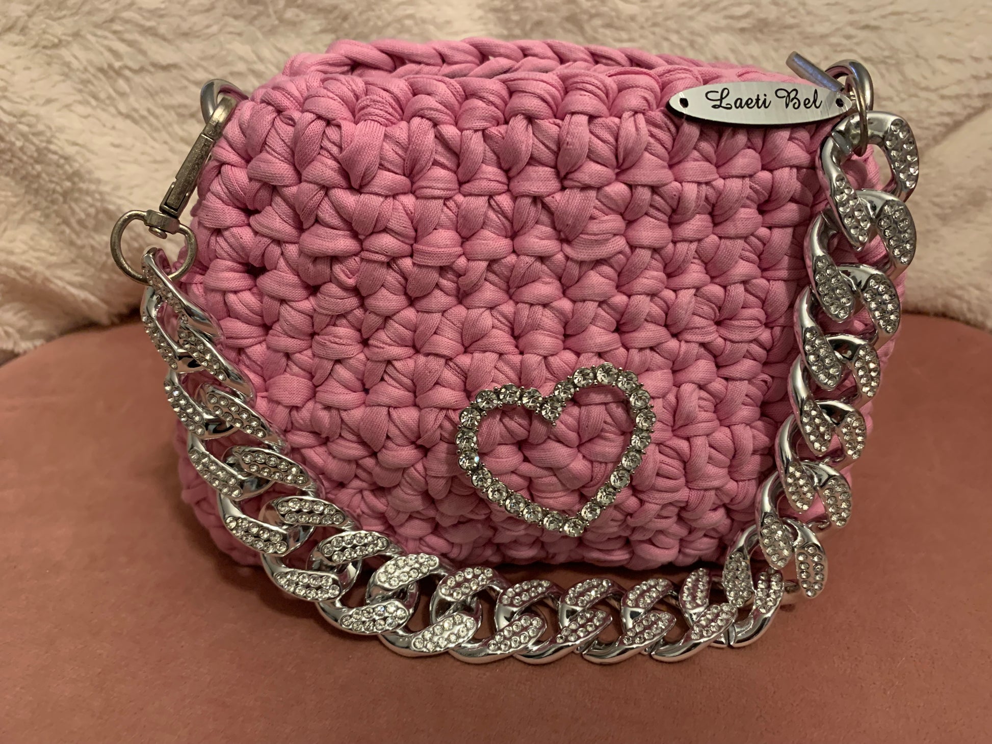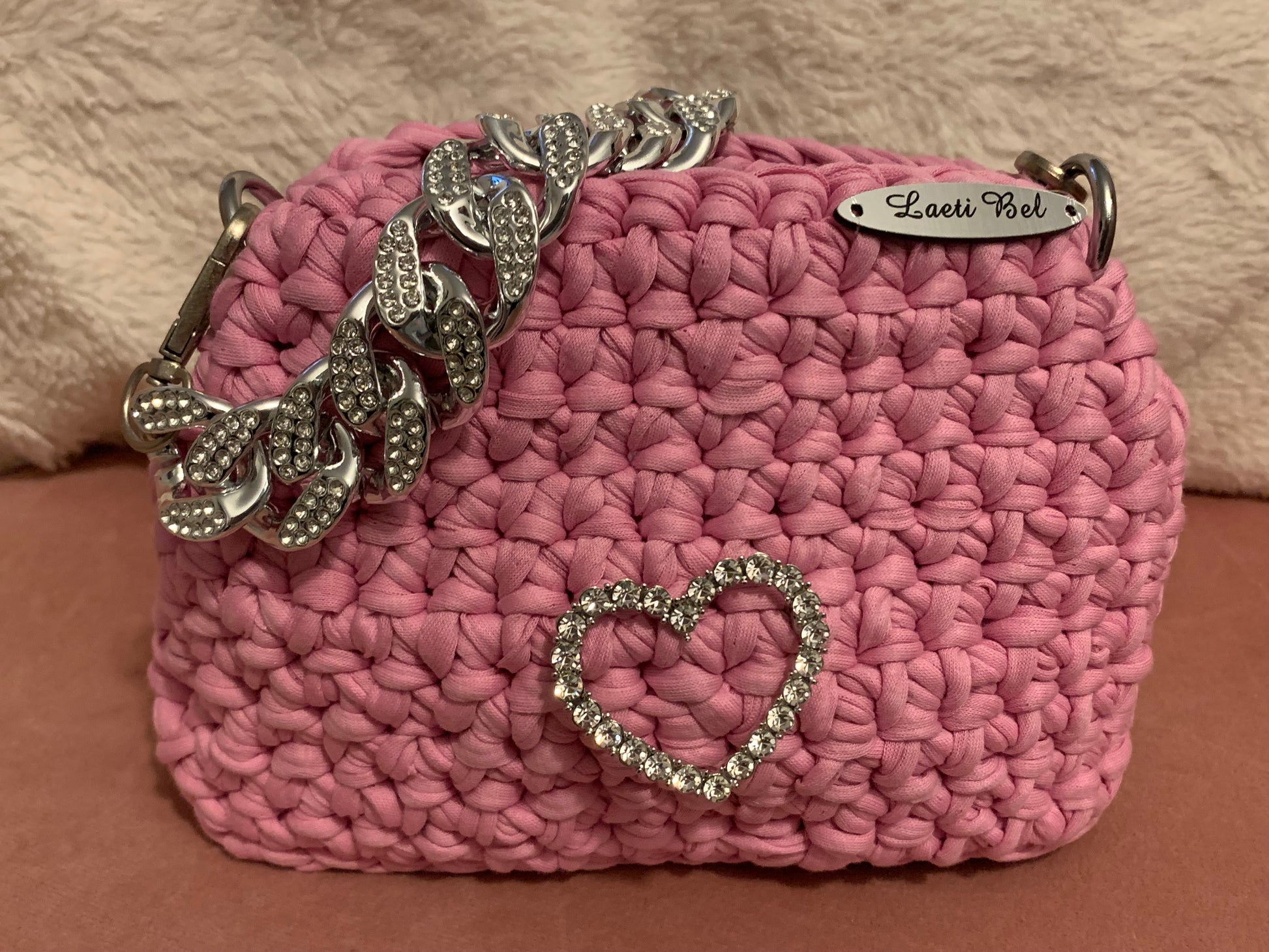 Succombez au charme délicat du sac à main Lisa, entièrement crocheté à la main dans un fil rose tendre qui respire la douceur et l’élégance. Sa chaîne épaisse en métal argenté incrustée de strass scintillants apporte une touche glamour, tandis que la broche en forme de cœur assortie souligne son style romantique et raffiné.