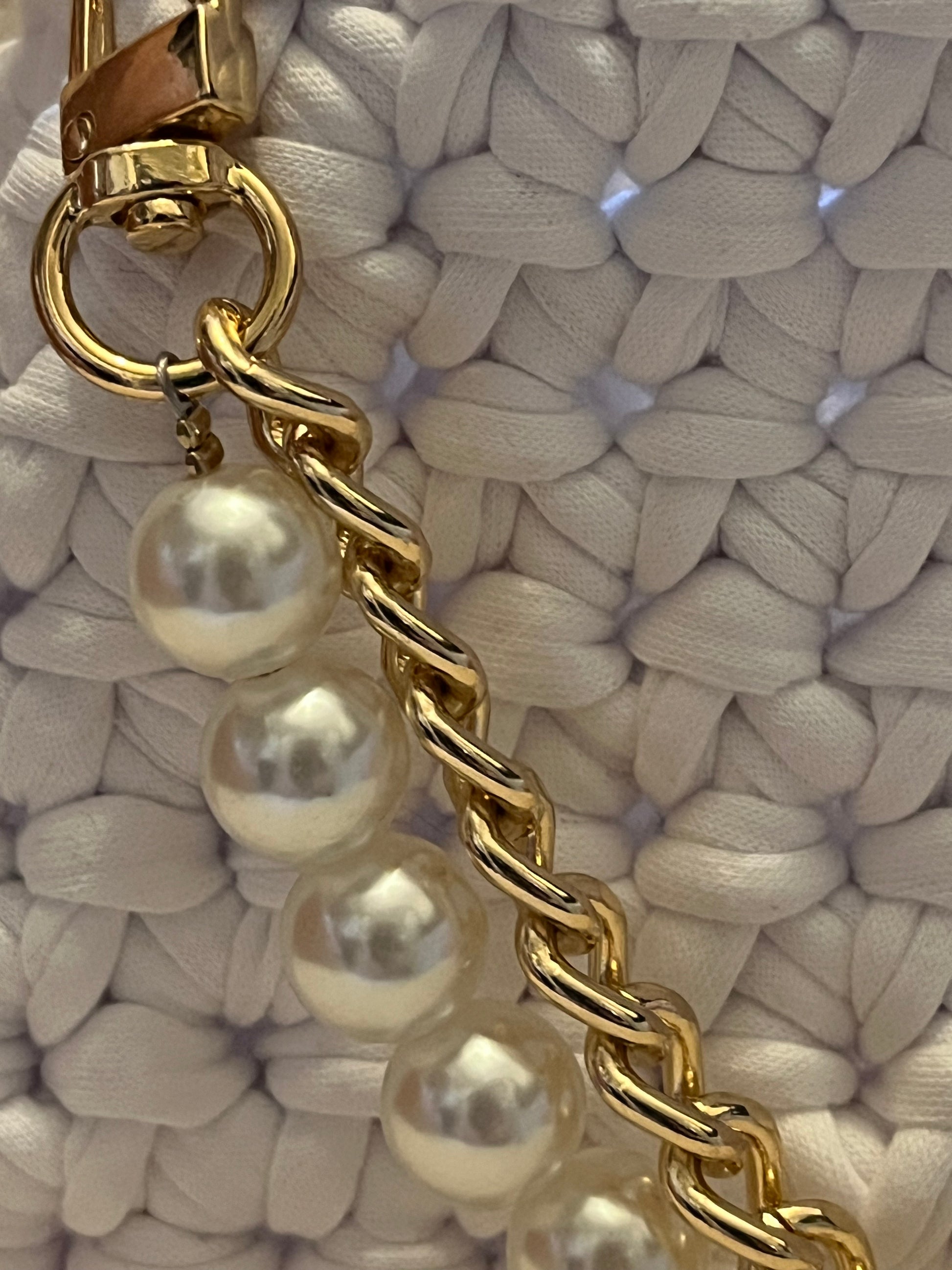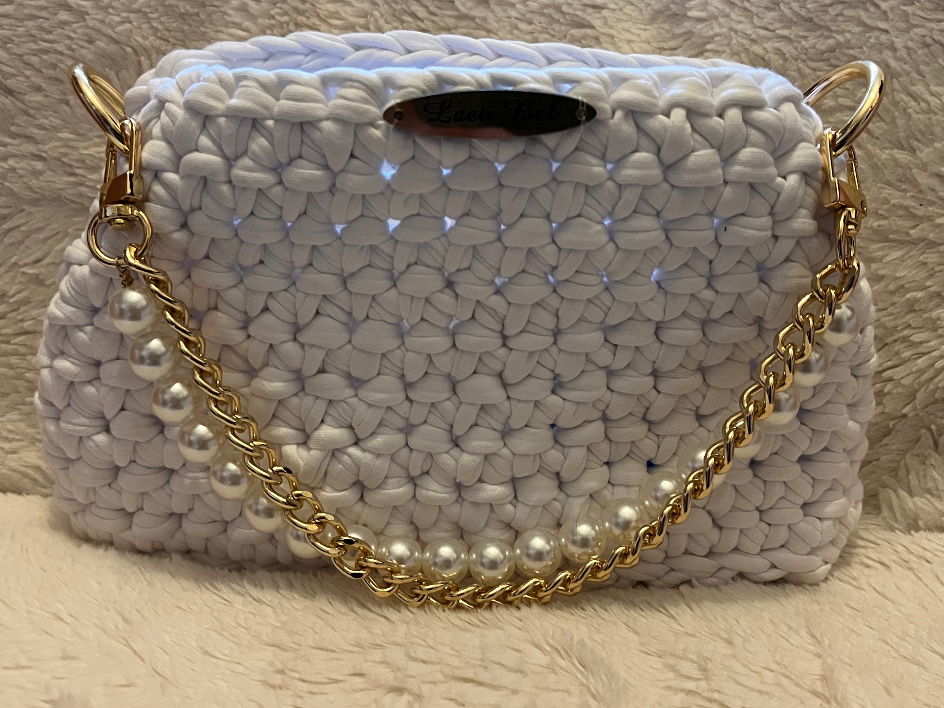 Laissez-vous séduire par le sac Lisa, une pièce unique qui allie douceur et élégance. Entièrement confectionné à la main, il séduit par son blanc immaculé et sa chaîne dorée agrémentée de perles, apportant une touche féminine et raffinée. Un accessoire intemporel qui sublime toutes vos tenues.