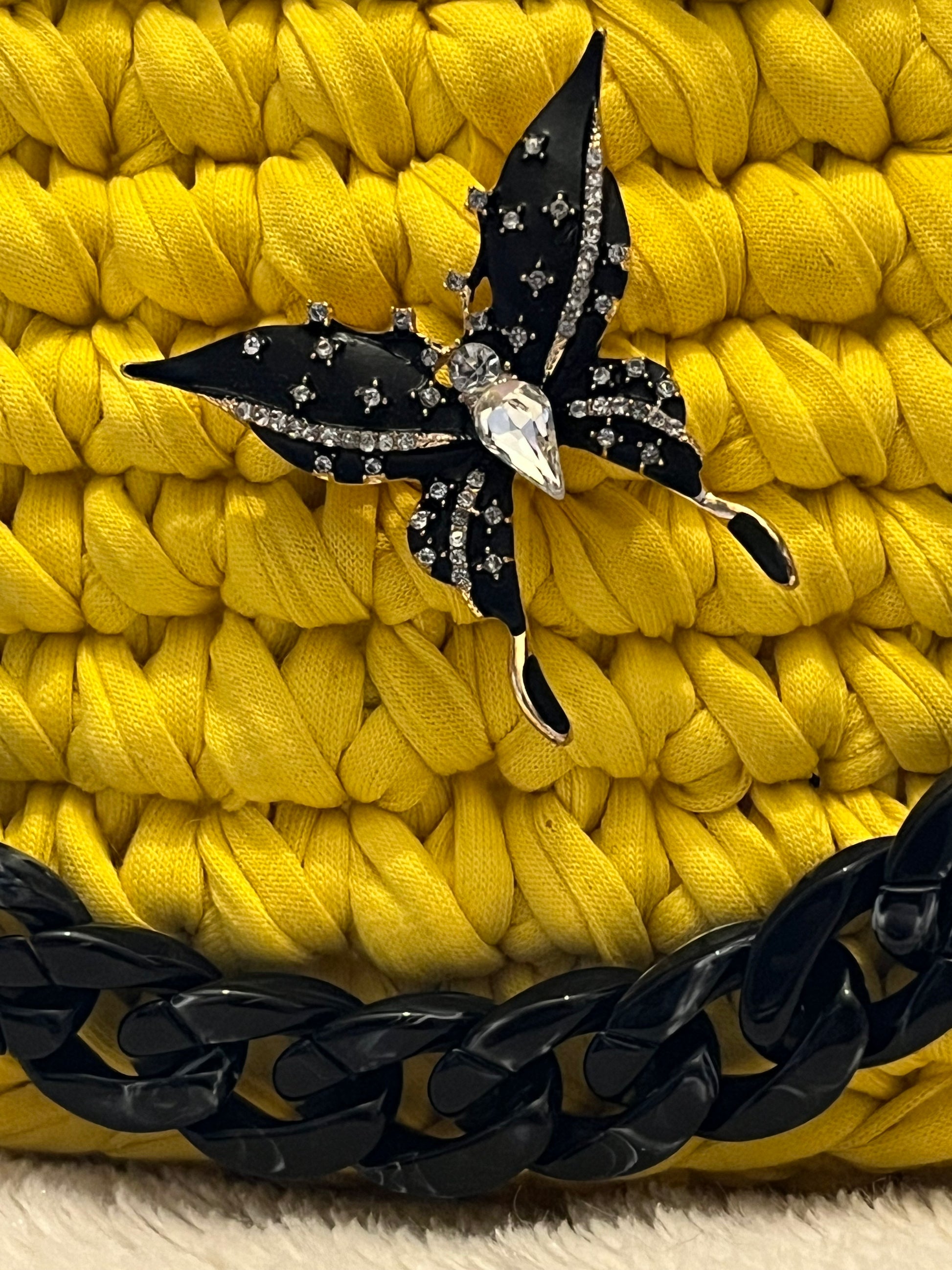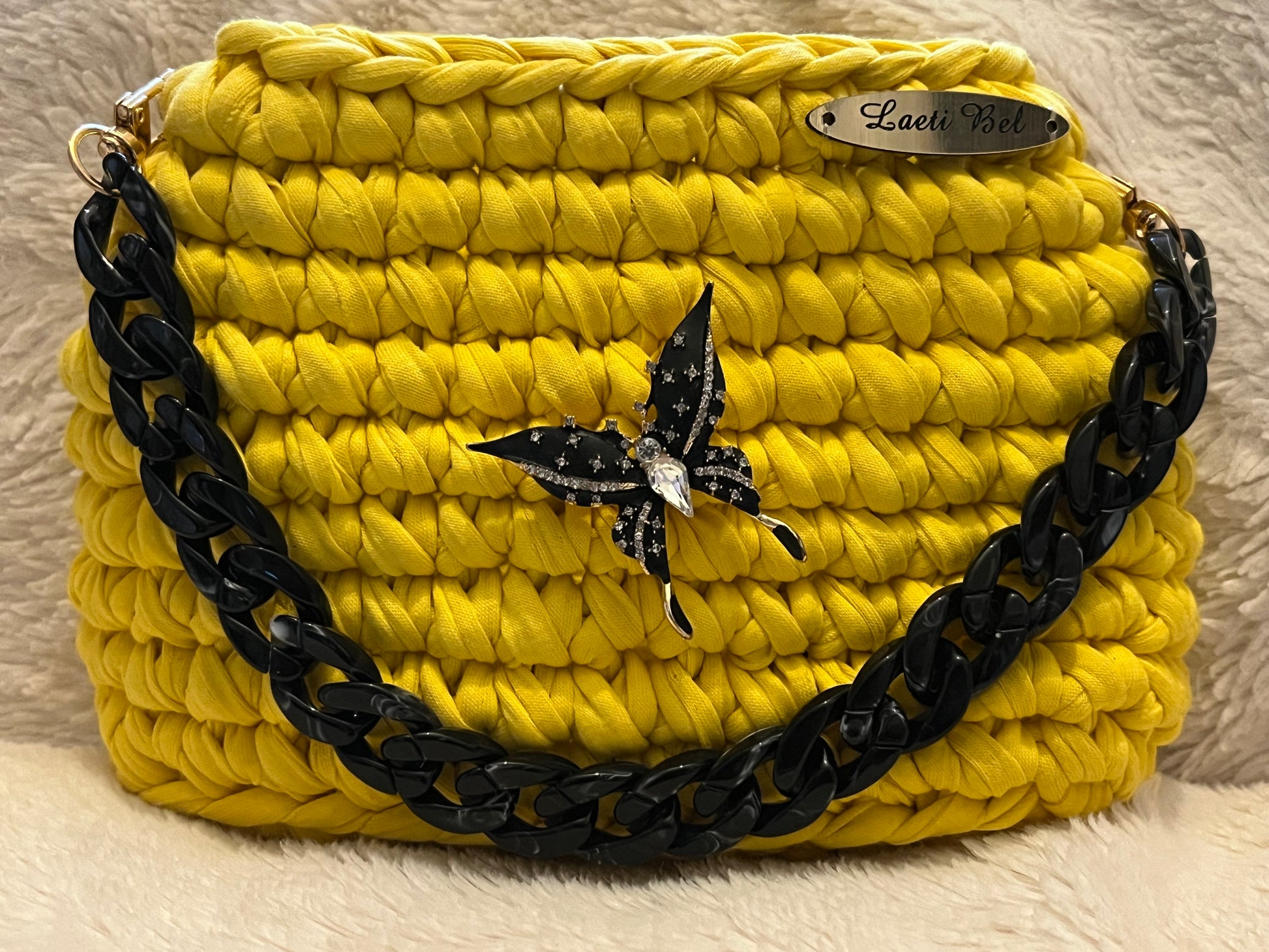 Véritable pièce lumineuse, le sac Lisa se distingue par son crochet jaune éclatant associé à une chaîne noire audacieuse. Orné d’un élégant papillon décoratif, il apporte une touche d’originalité et de raffinement à vos tenues. Idéal pour illuminer vos looks avec caractère et style.