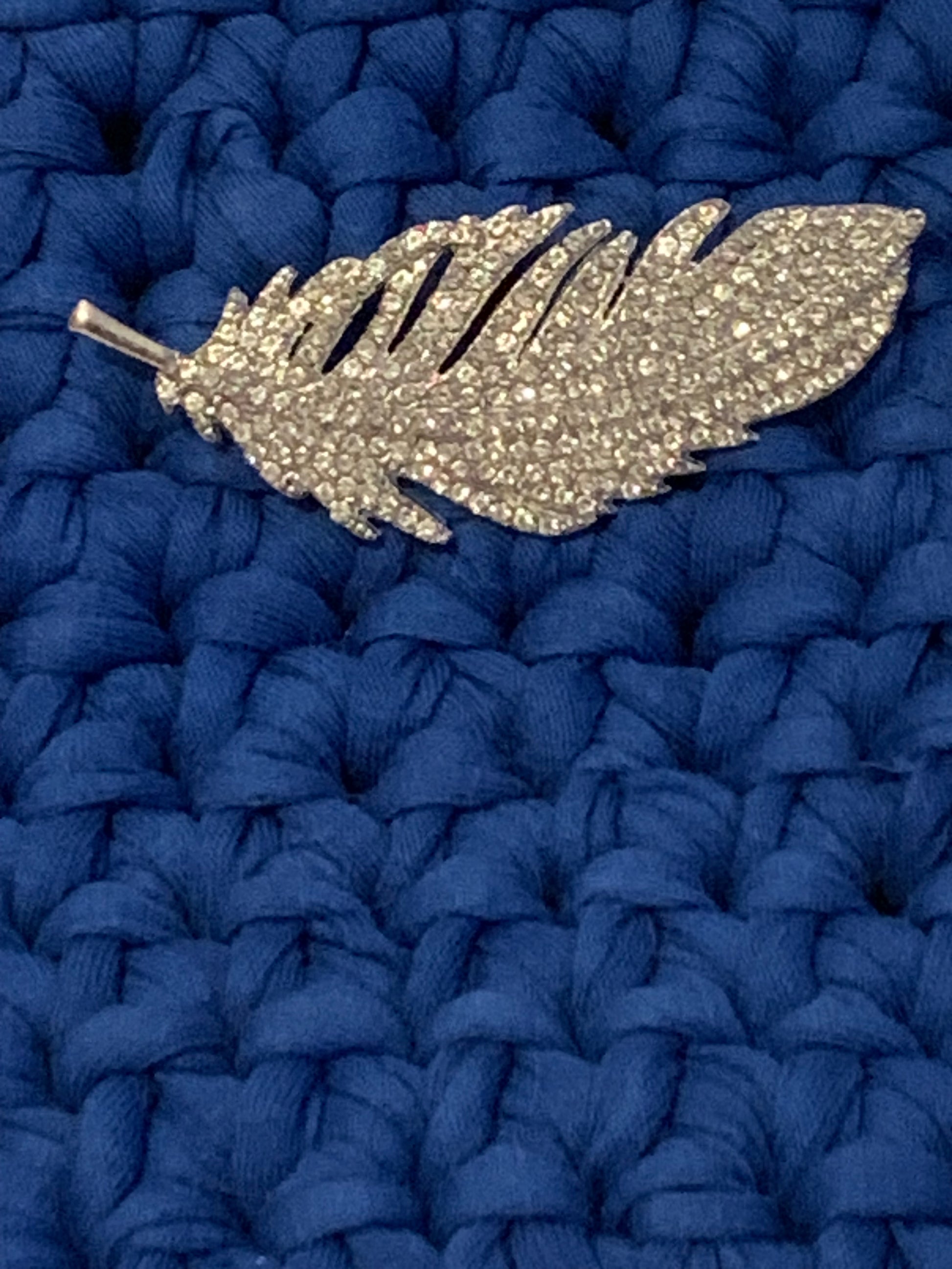 Détail distinctif : Broche plume argentée incrustée de strass.