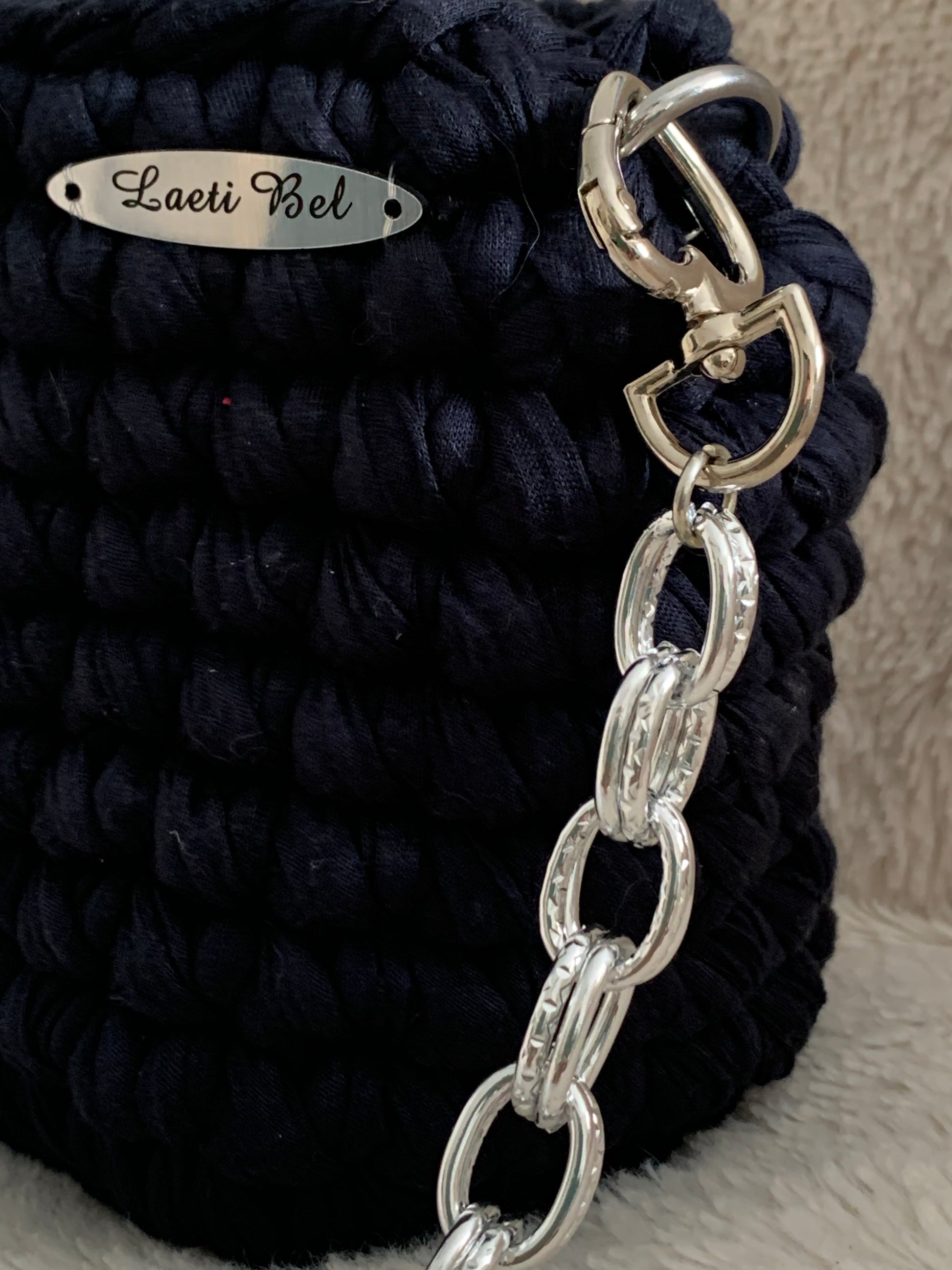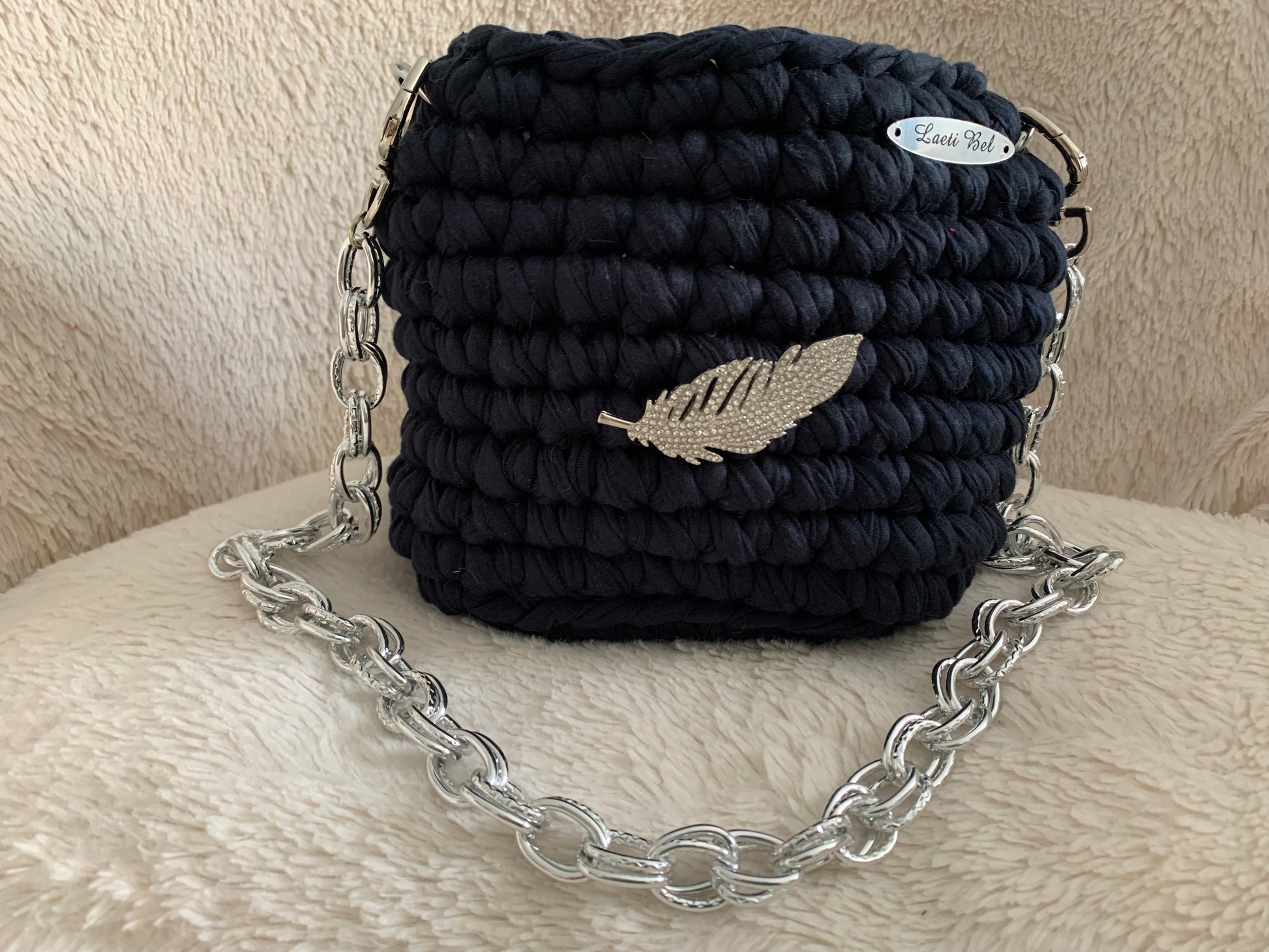 Le sac Lisa en version noir profond se distingue par son élégance intemporelle. Confectionné en crochet artisanal, il est rehaussé d’une chaîne argentée moderne et d’un bijou plume argentée qui apporte une note raffinée et poétique.