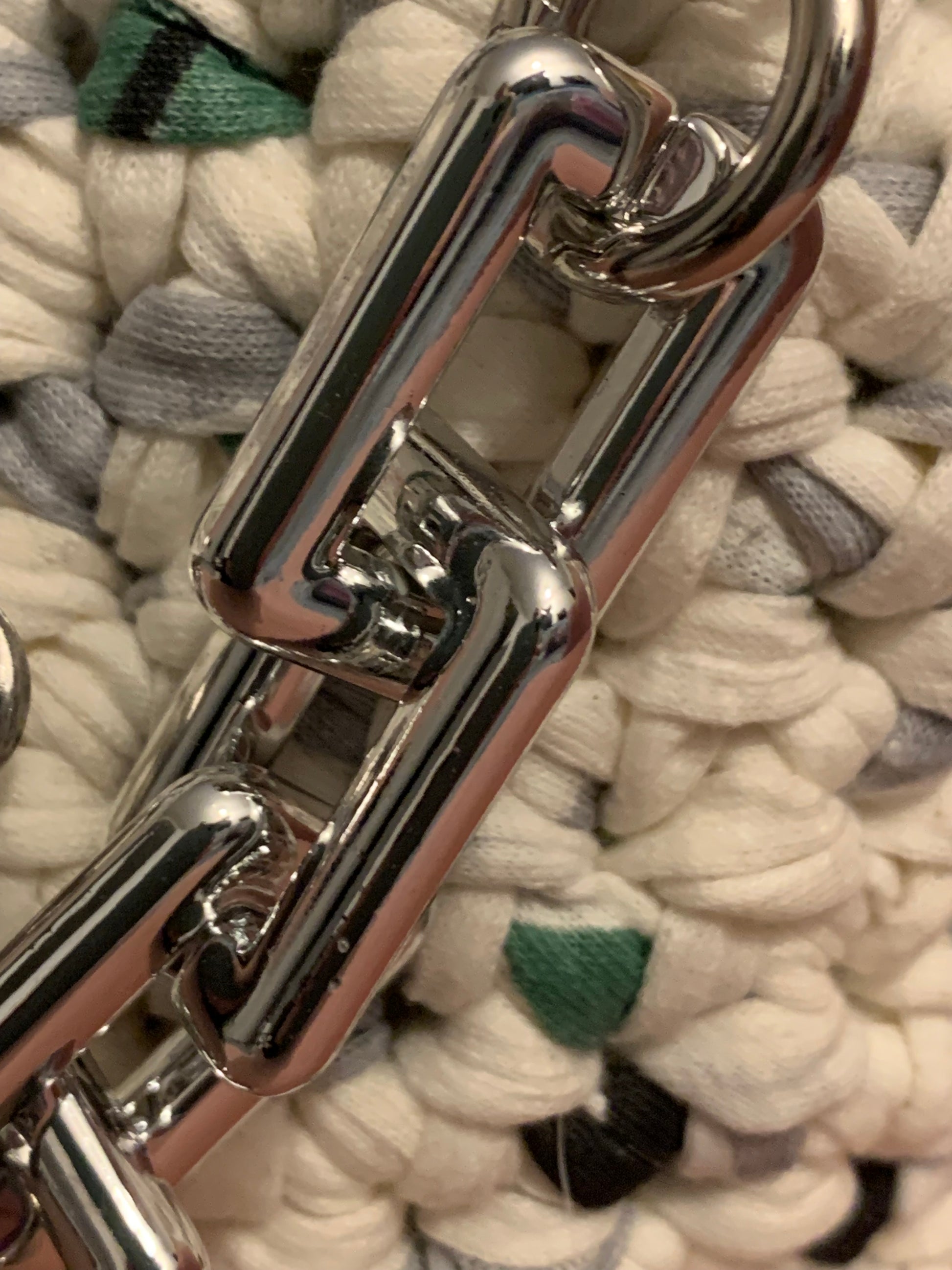 Détail décoratif : Chaîne argentée au maillage géométrique contemporain.