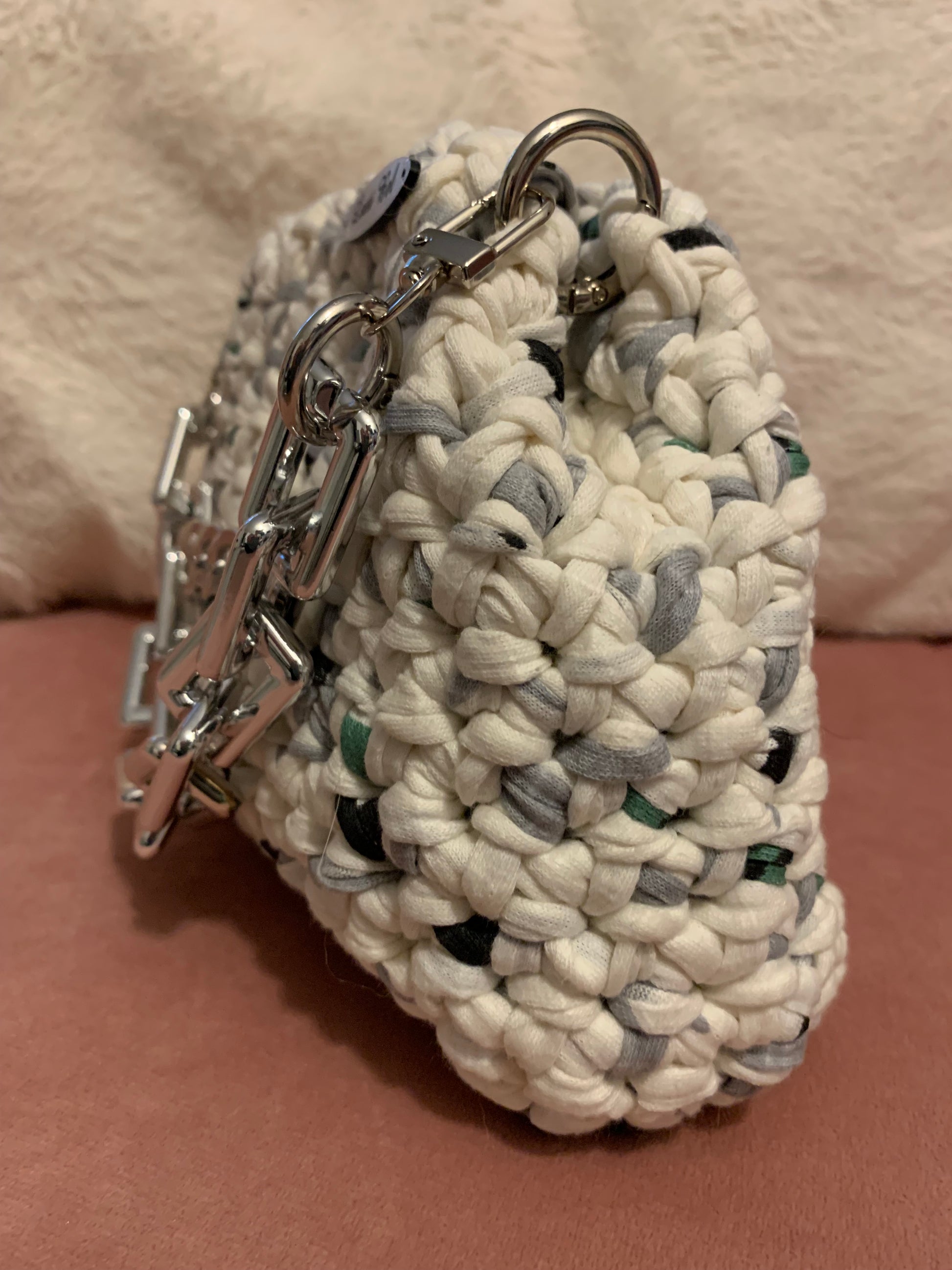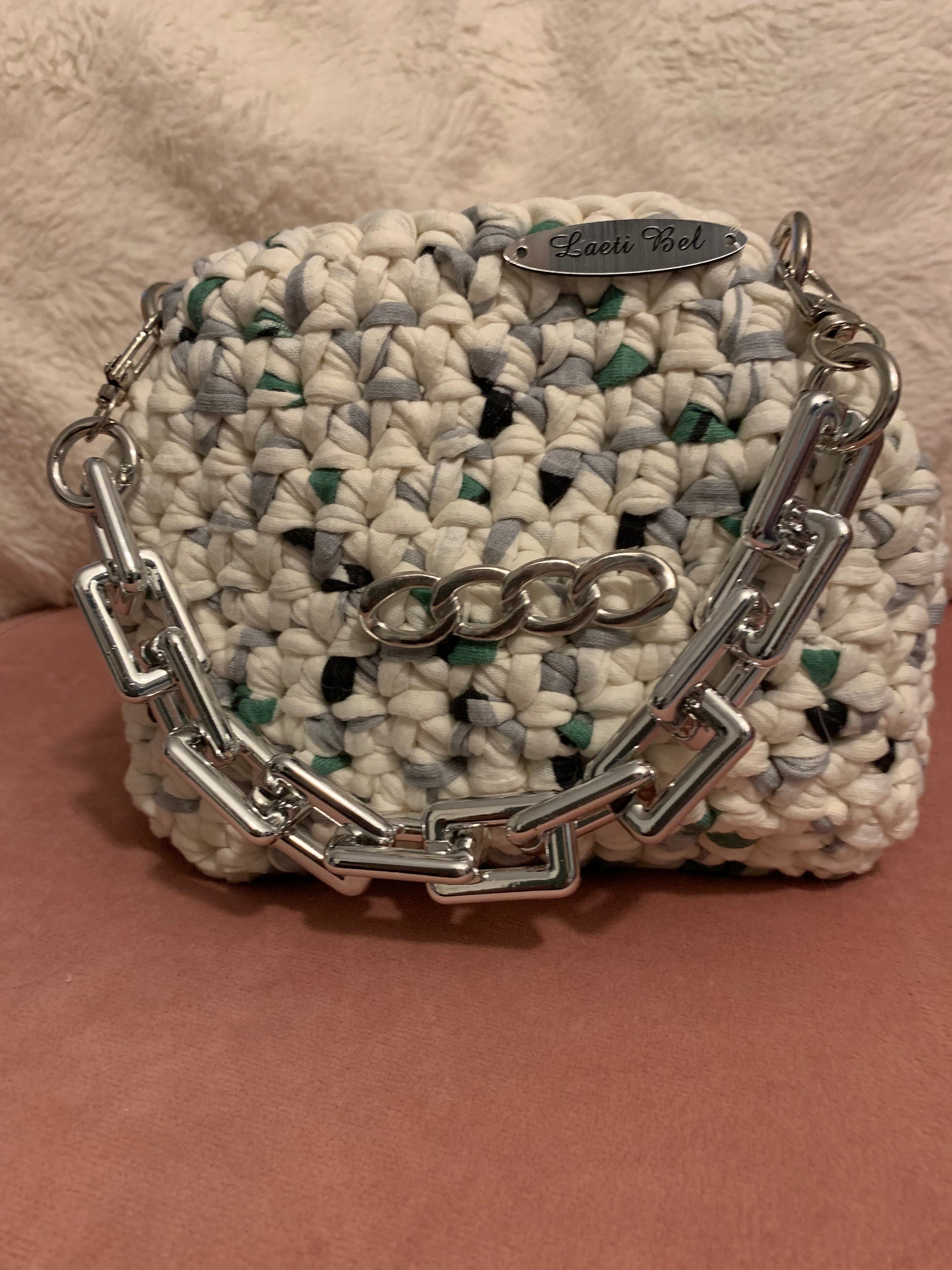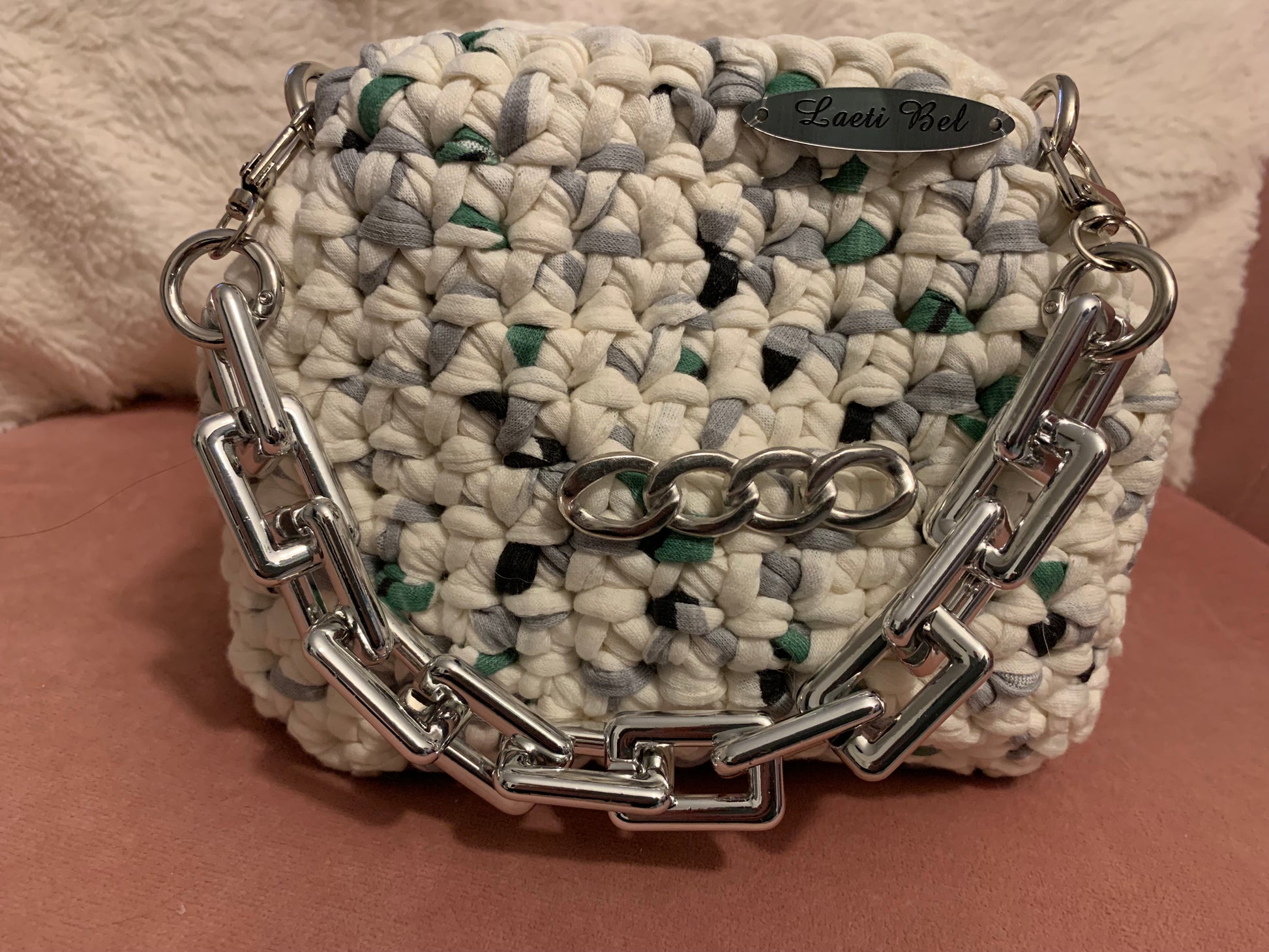 Alliez originalité et élégance avec le sac à main Lisa, crocheté à la main dans un fil crème parsemé de touches vertes et grises pour un effet subtilement tacheté. Sa chaîne épaisse argentée au design géométrique moderne lui confère un style affirmé, idéal pour celles qui aiment se démarquer tout en restant chic.