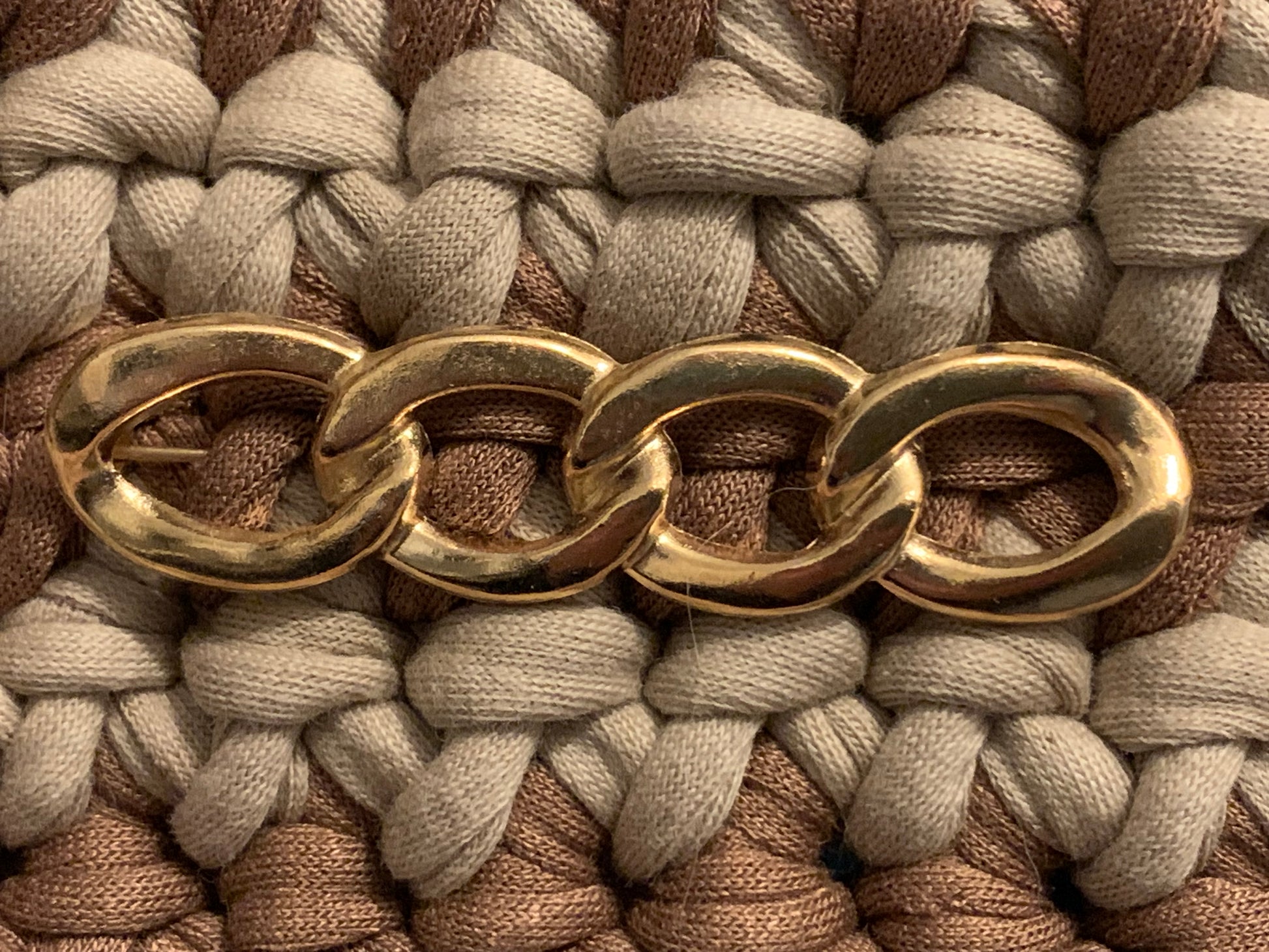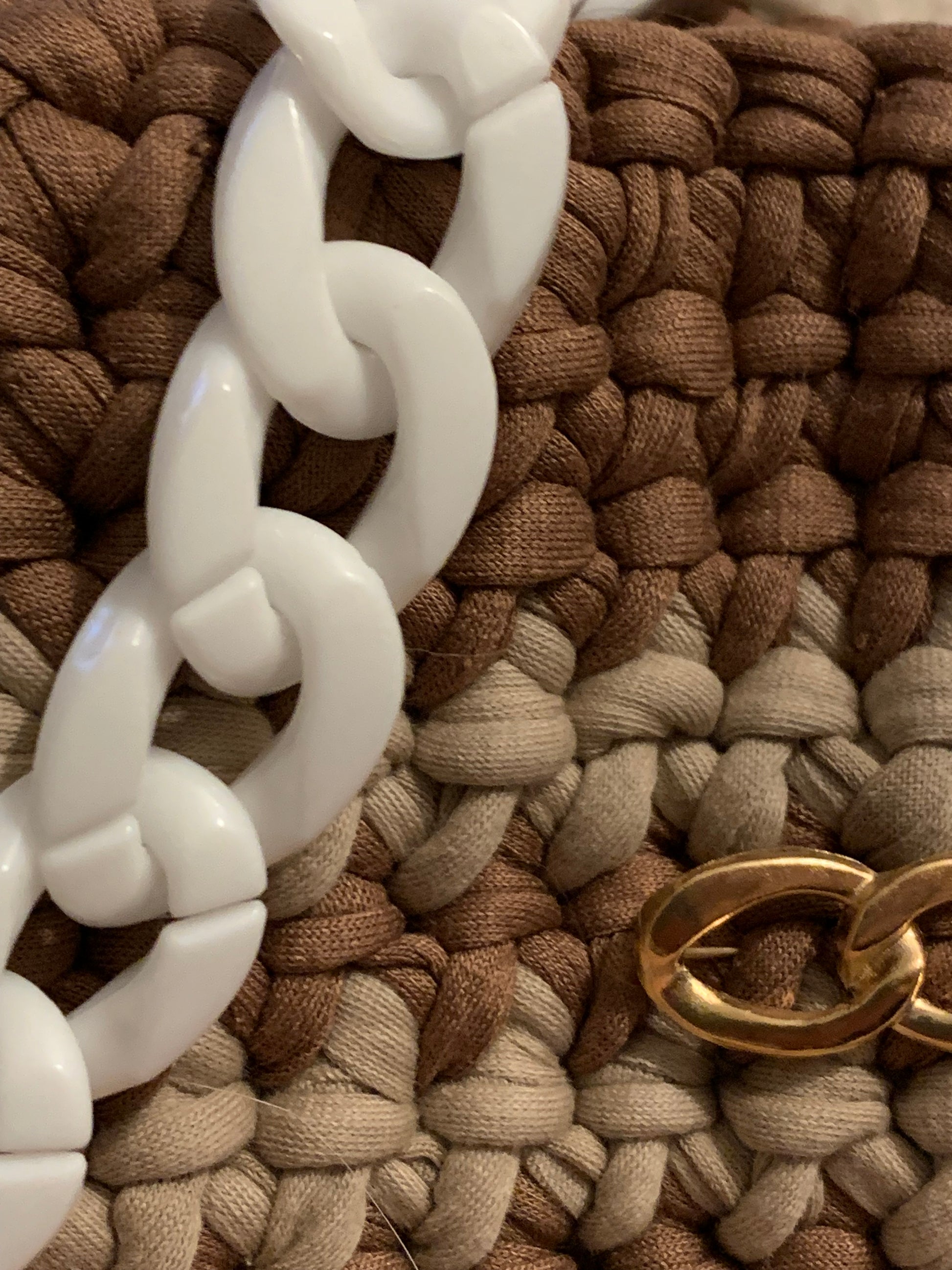 Mettez en valeur votre style avec le sac à main Lisa, crocheté à la main dans un magnifique dégradé de marron allant du beige clair au chocolat profond. Sa chaîne blanche épaisse ajoute une touche contemporaine, tandis que l’anneau doré décoratif apporte une note élégante et sophistiquée.
