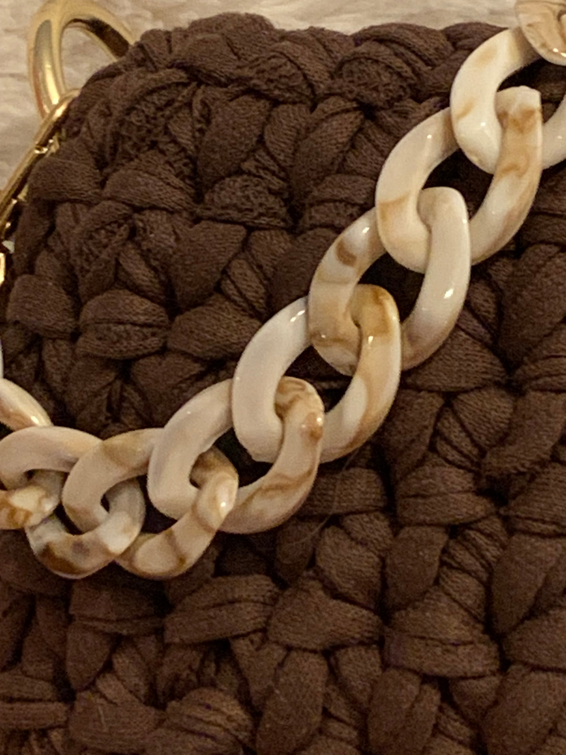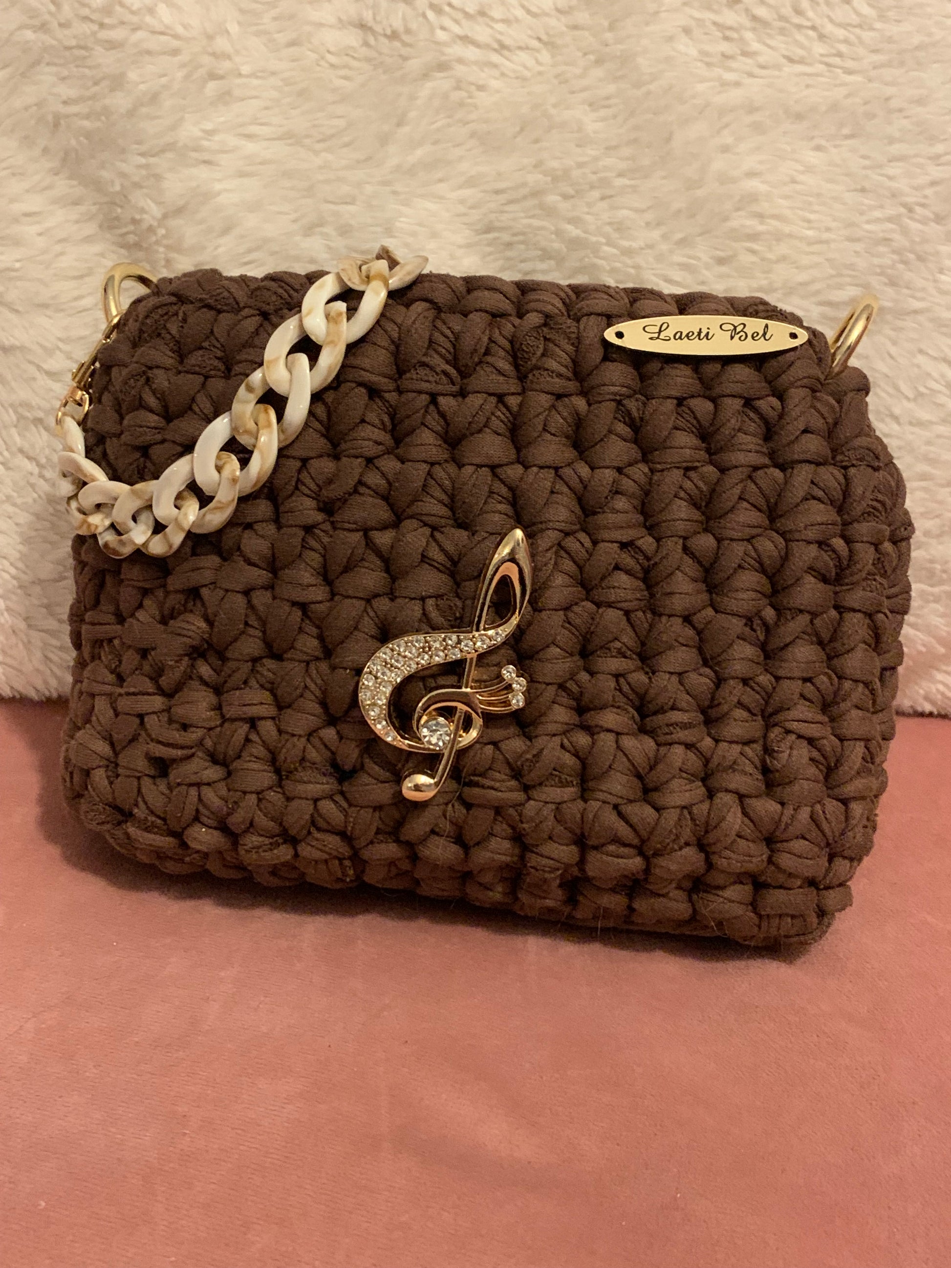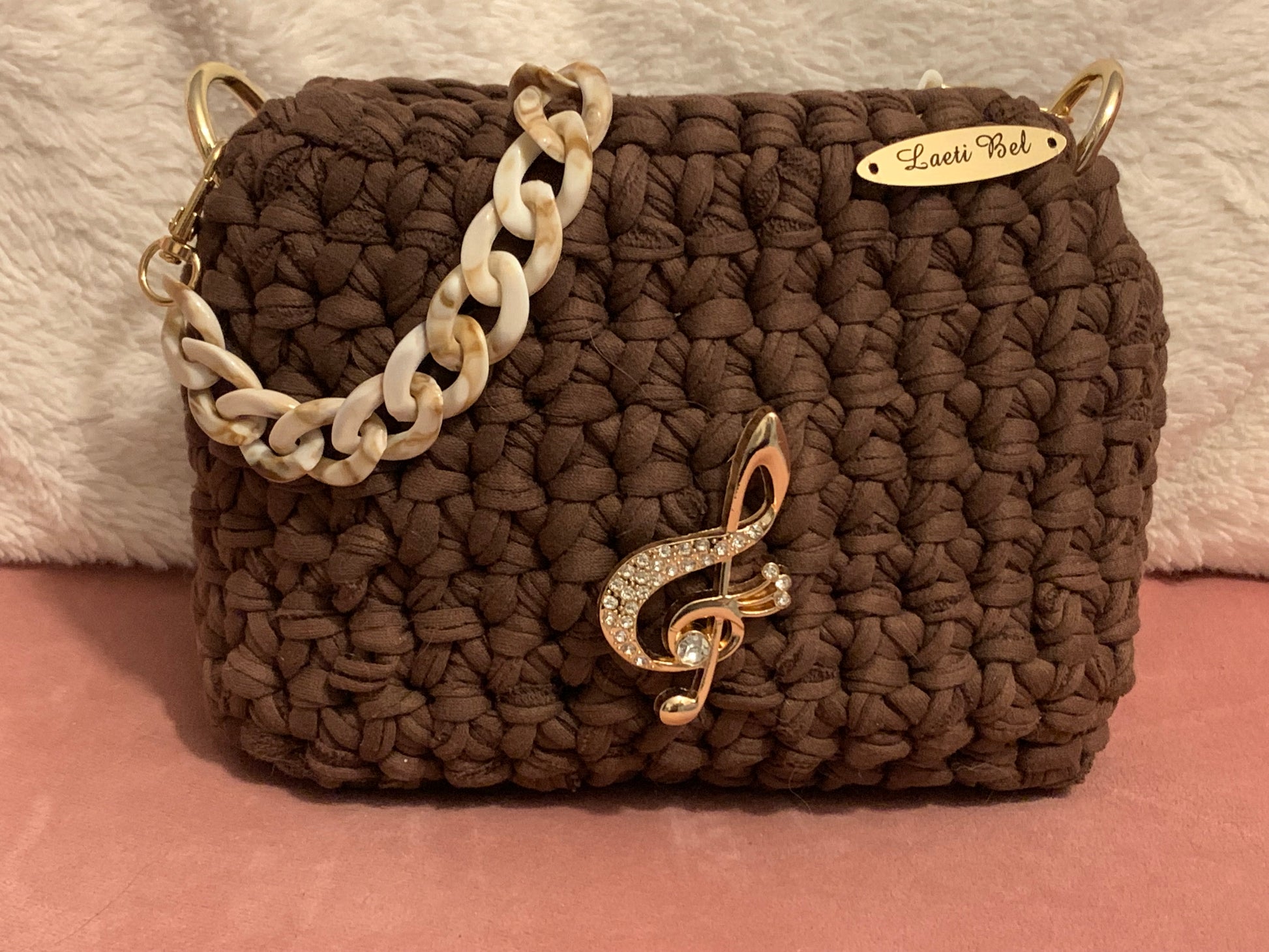 Optez pour le charme intemporel du sac à main Lisa, crocheté à la main dans un fil marron profond. Sa chaîne blanche épaisse apporte un contraste moderne, tandis que la broche clé de sol dorée sertie de strass lui confère une touche artistique et raffinée.
