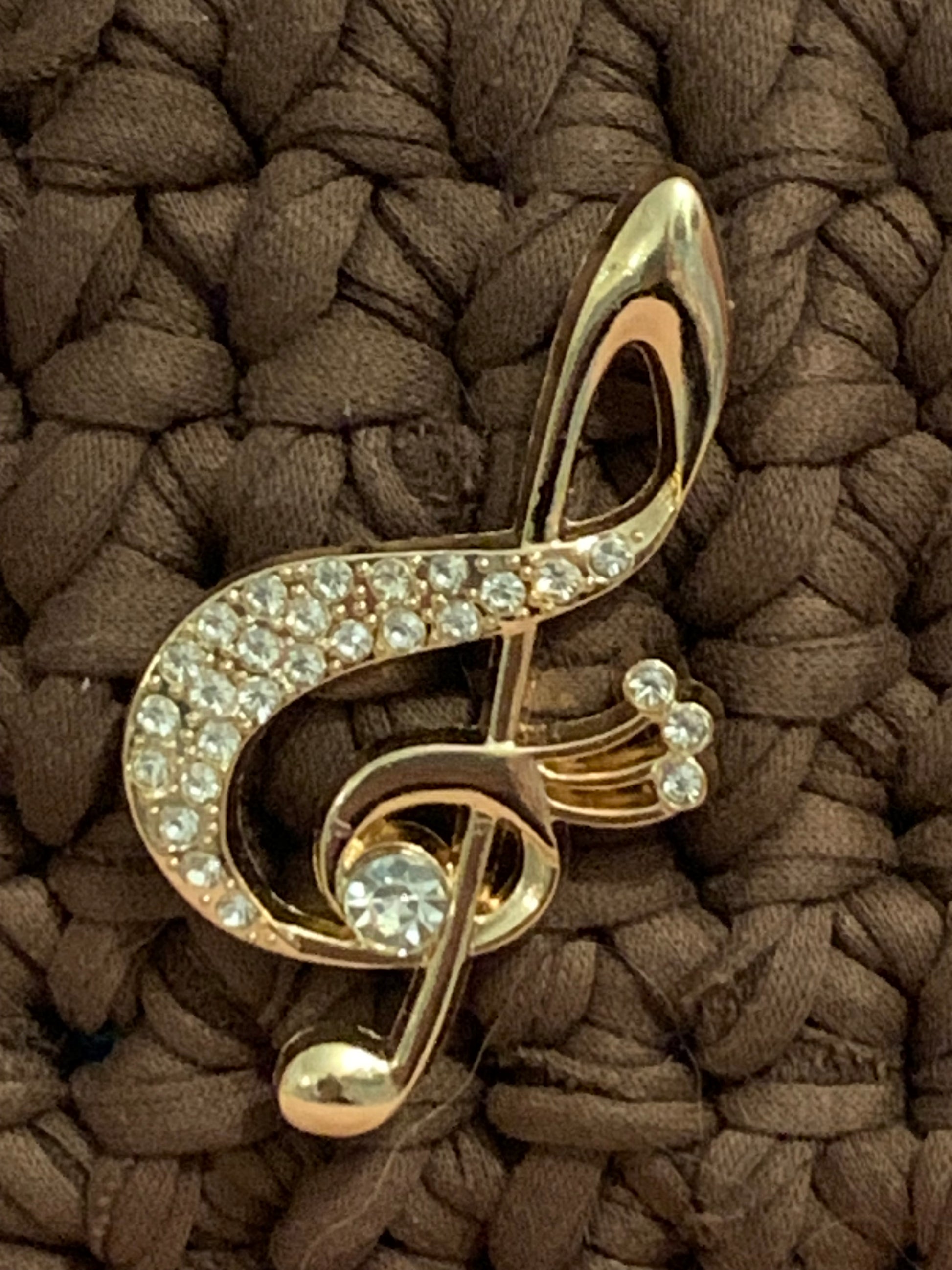 Détails décoratifs : Chaîne blanche épaisse et broche clé de sol dorée à strass.