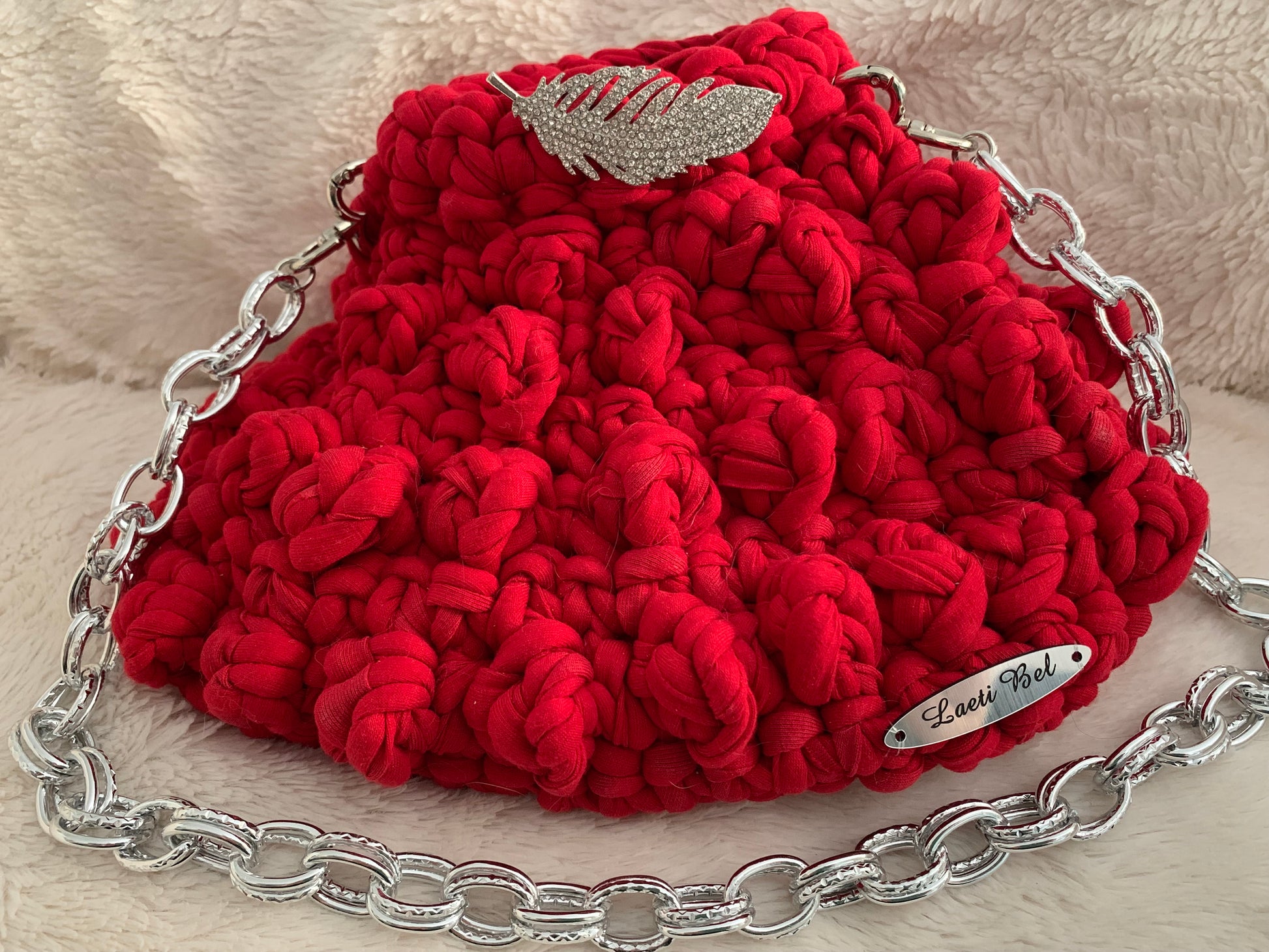 Le sac Lola rouge incarne l’élégance audacieuse. Confectionné en crochet artisanal, il séduit par son rouge éclatant, sa chaîne argentée solide et son bijou plume argentée scintillante qui apporte une touche de raffinement unique.