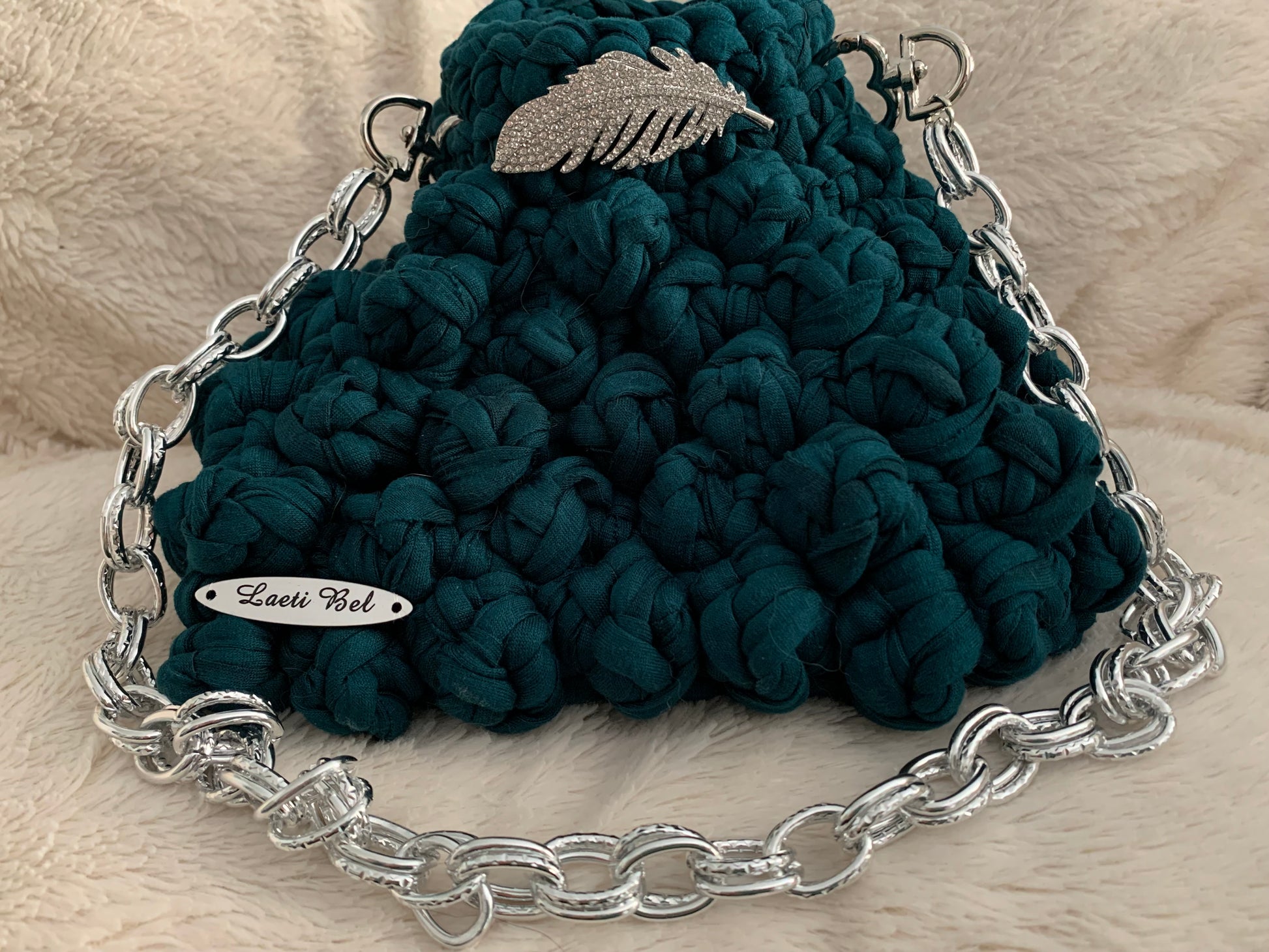 Le sac Lola vert émeraude est une véritable pièce de caractère. Fait à la main en crochet artisanal, il séduit par sa texture en relief et son style élégant. Sa chaîne argentée brillante et son bijou plume argentée scintillante en font un accessoire aussi raffiné qu’original.