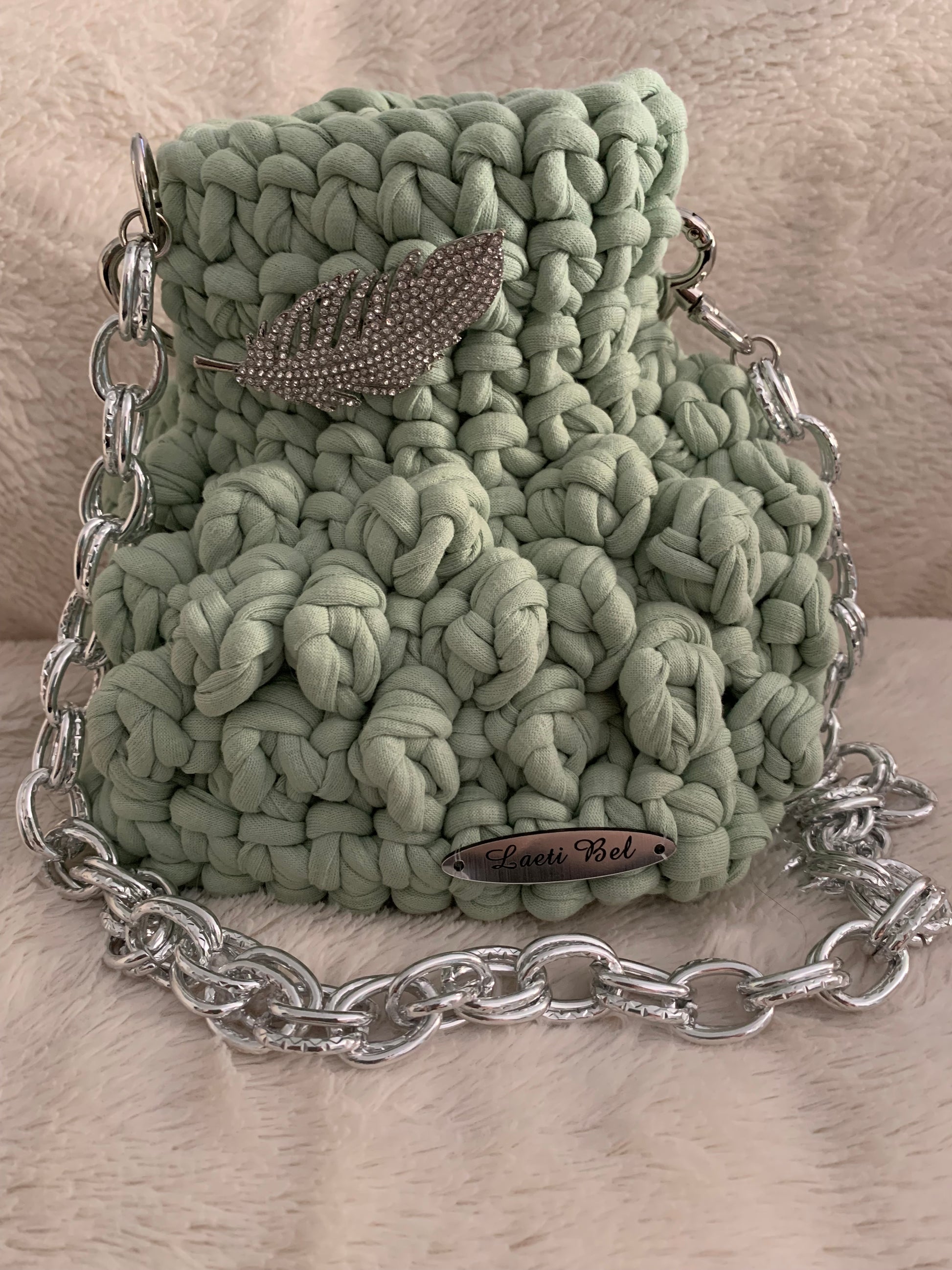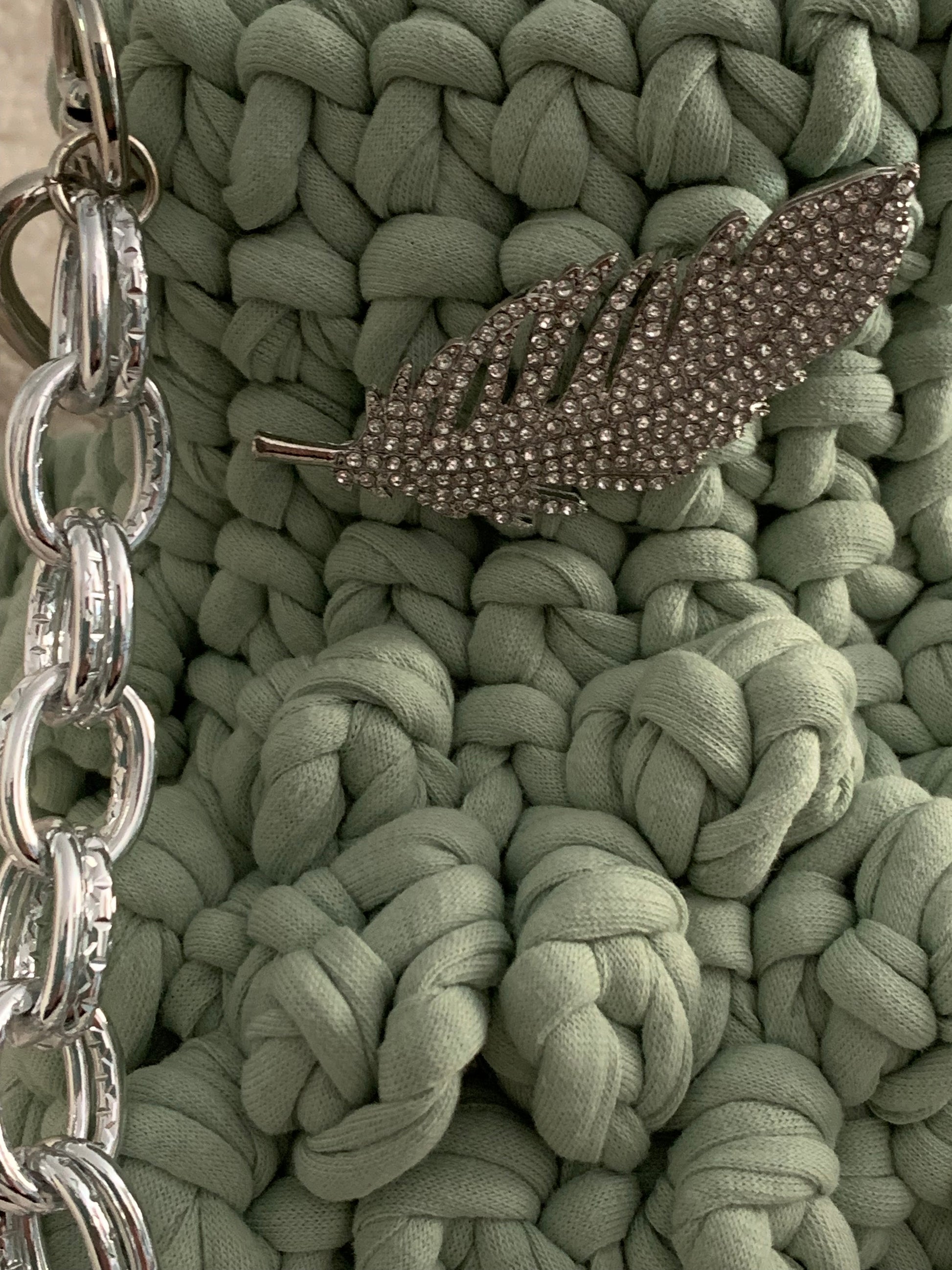 Le sac Lola vert sauge est une véritable pièce de caractère. Fait à la main en crochet artisanal, il séduit par sa texture en relief et son style élégant. Sa chaîne argentée brillante et son bijou plume argentée scintillante en font un accessoire aussi raffiné qu’original.