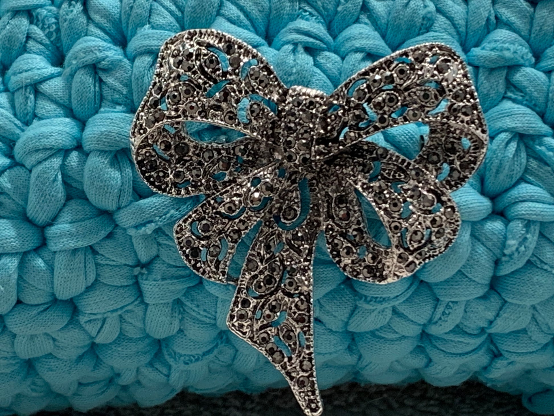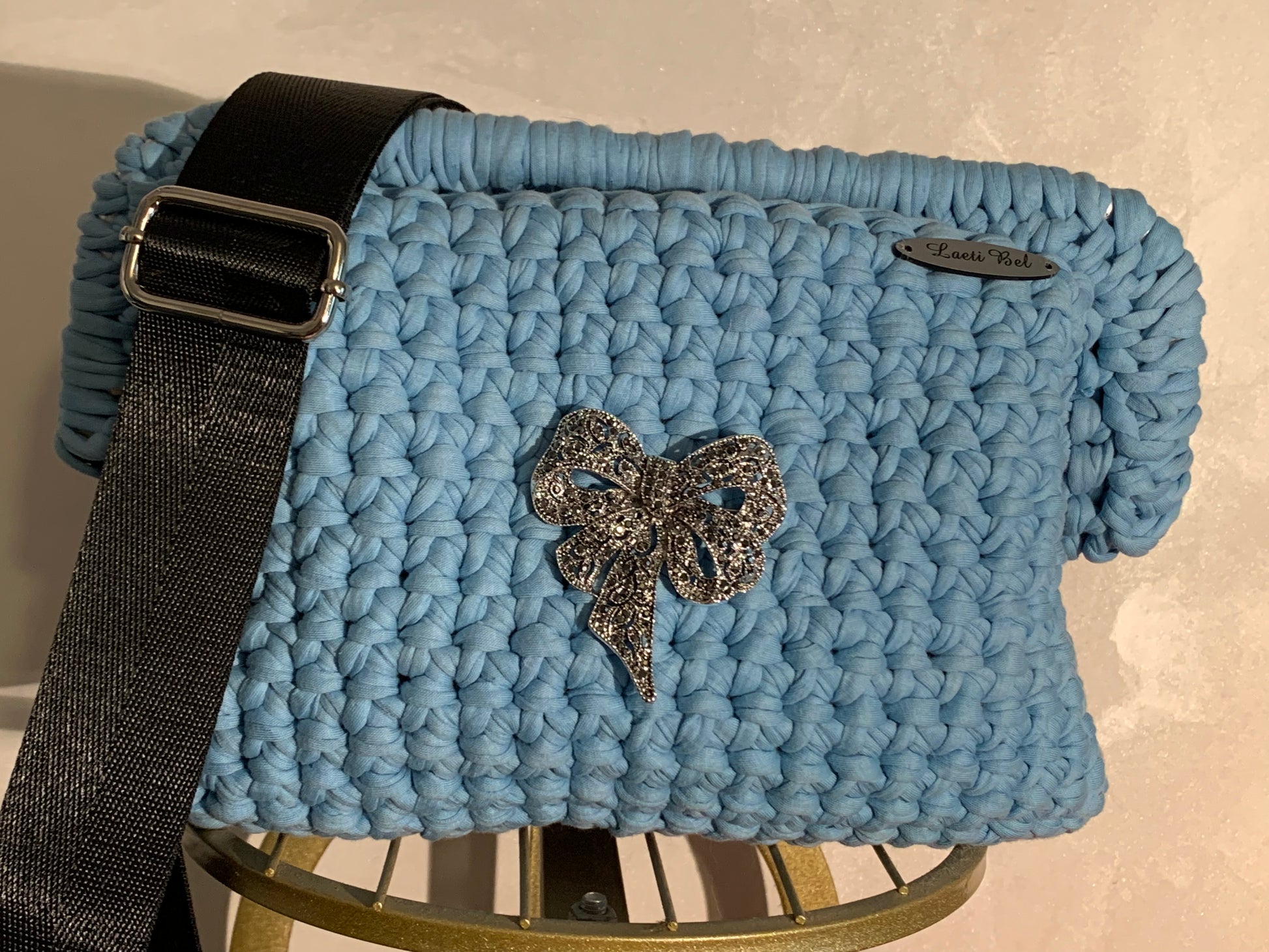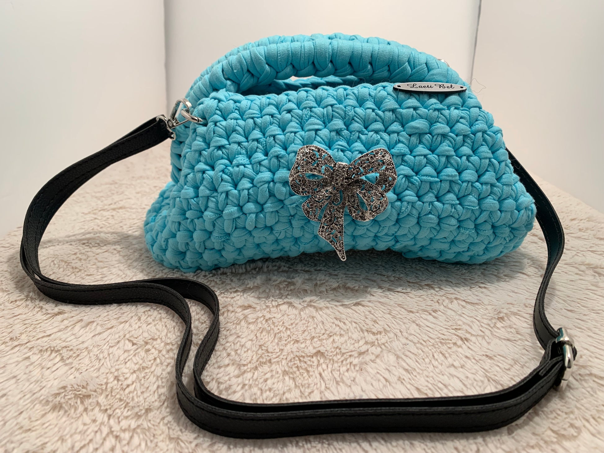 Apportez une note de fraîcheur et de vitalité à vos tenues avec le sac à main Lou. Entièrement crocheté à la main dans un fil épais d’un turquoise éclatant, il séduit par sa texture moelleuse et son charme artisanal. Le nœud papillon décoratif en métal argenté, finement travaillé, lui confère une élégance délicatement bohème.