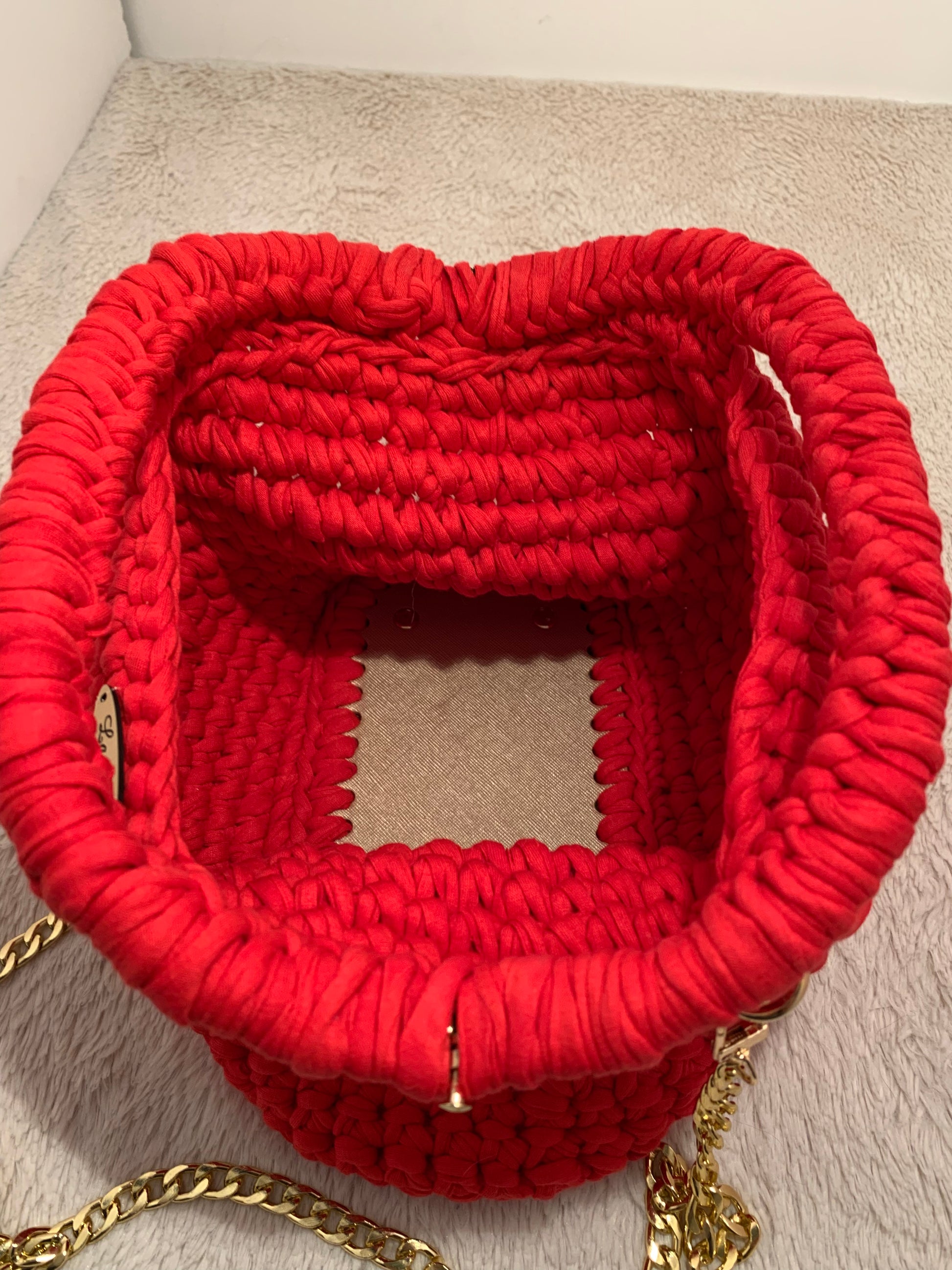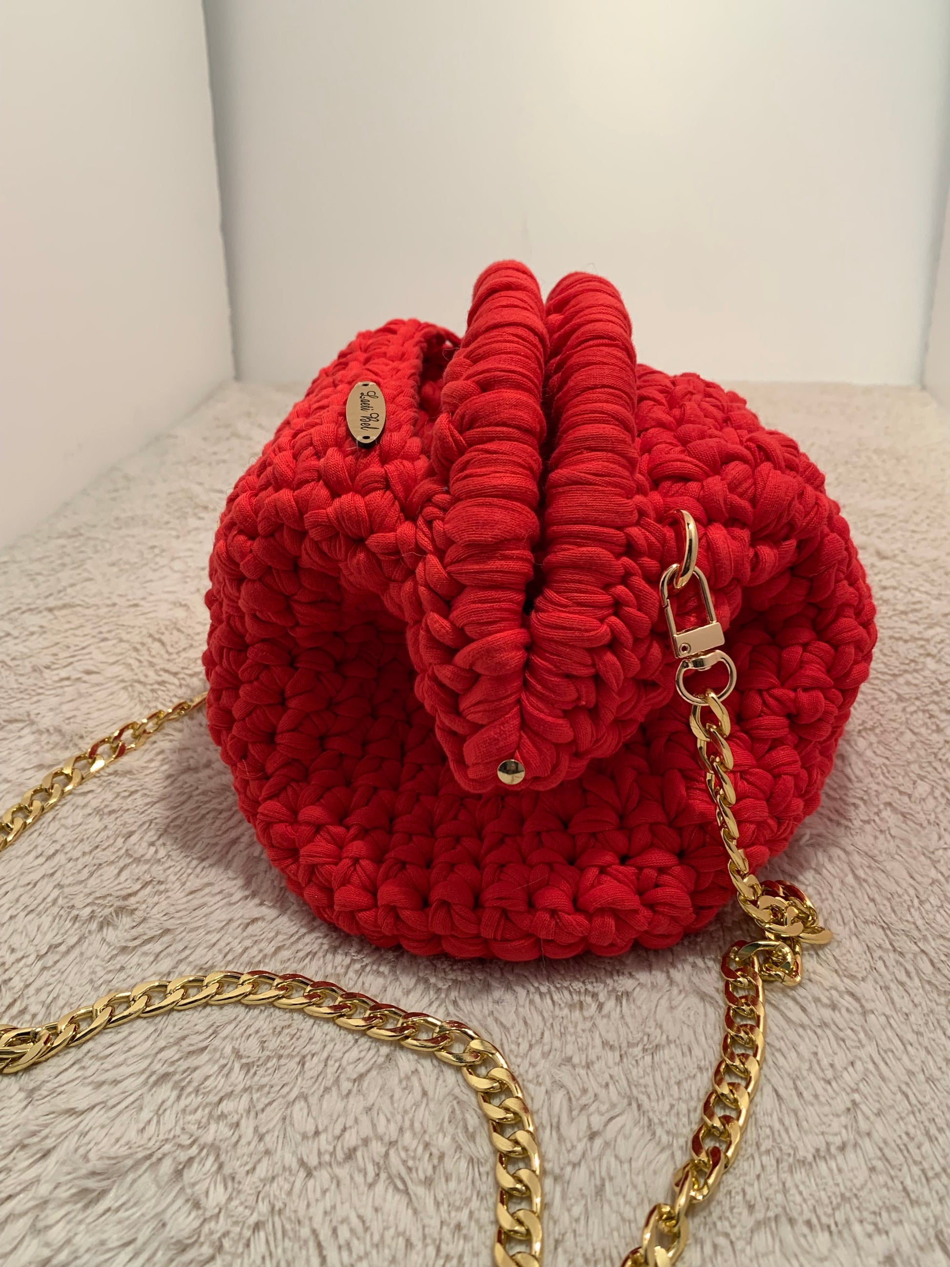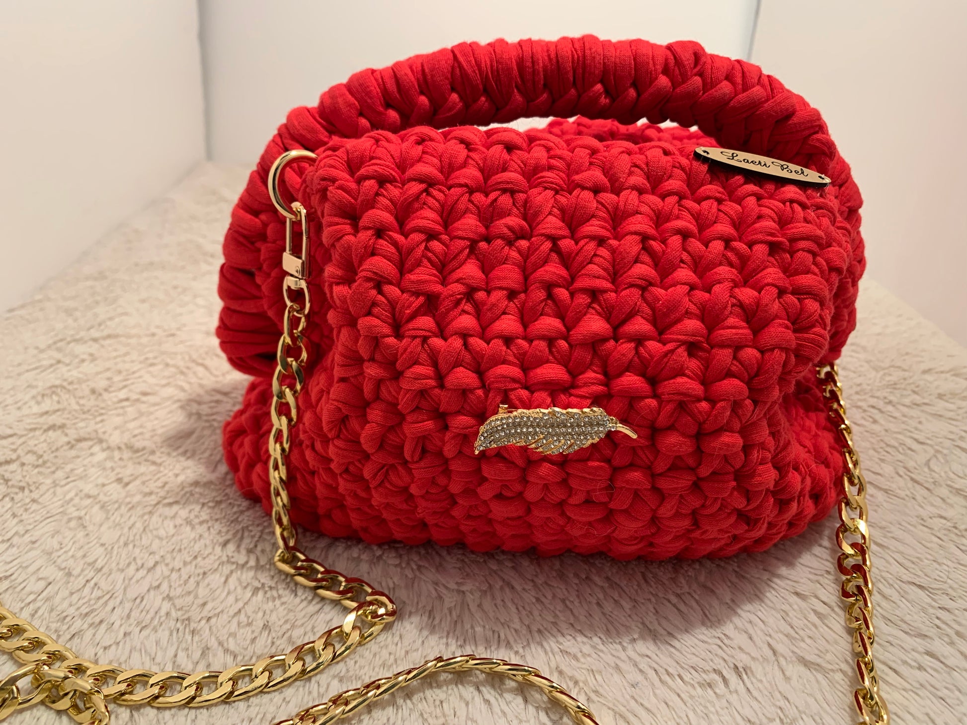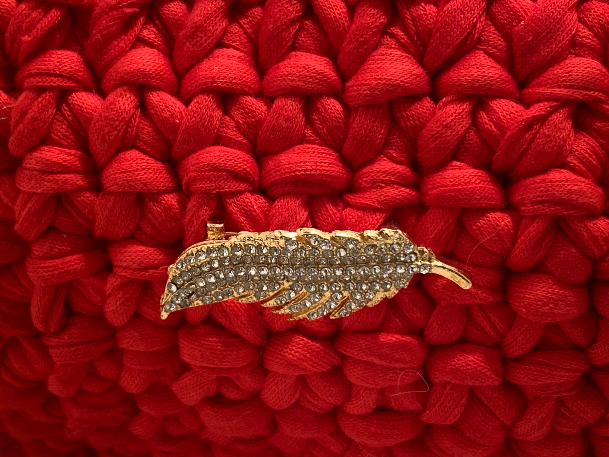 Affirmez votre style avec le sac à main Lou mini, crocheté à la main dans un fil rouge éclatant qui attire tous les regards. Sa texture épaisse et douce est sublimée par une chaîne dorée élégante et une breloque plume assortie, offrant un contraste luxueux et raffiné. Parfait pour rehausser une tenue simple ou accompagner un look de soirée, ce modèle respire la passion et l’élégance.