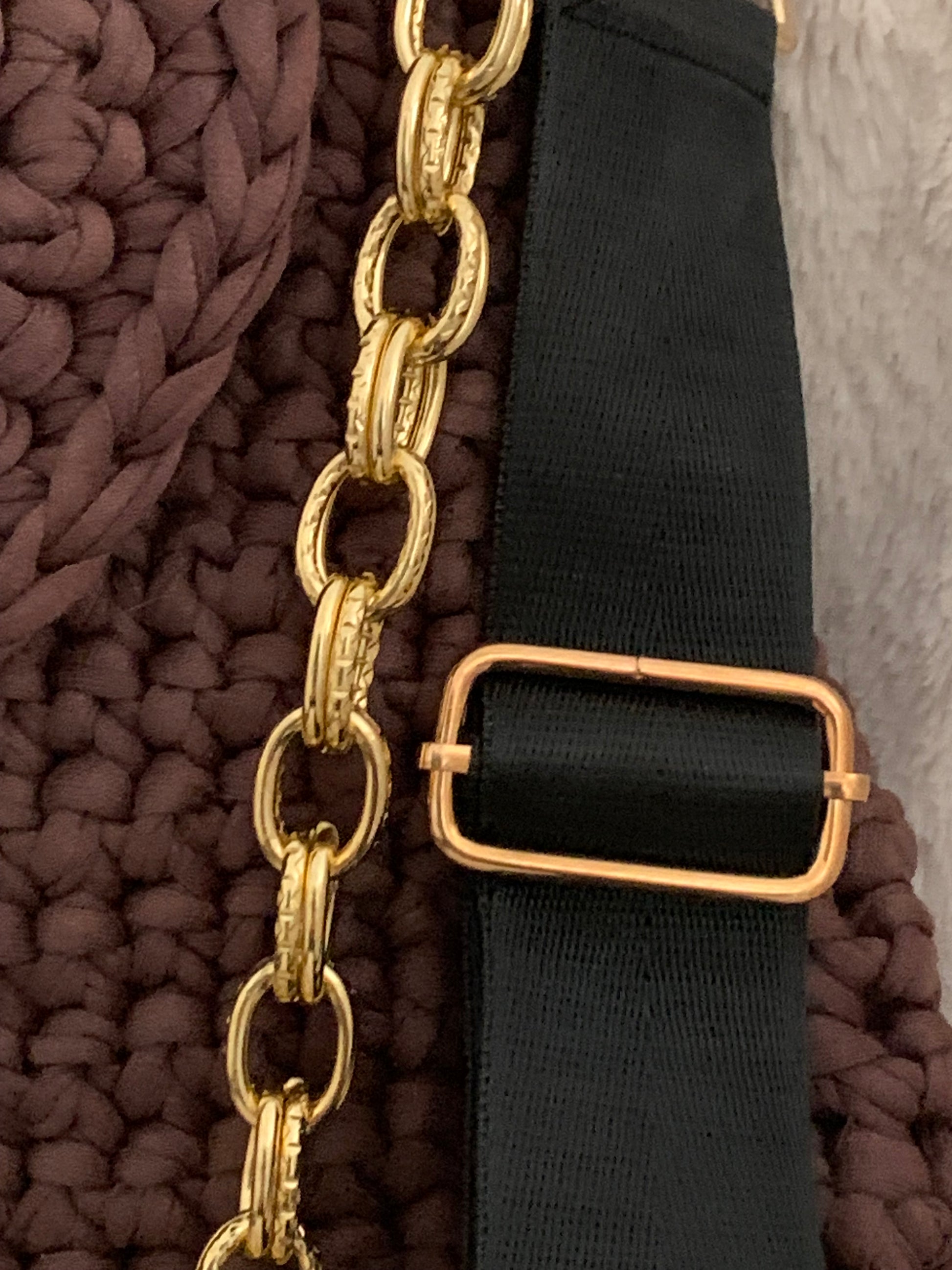 Le modèle Nina allie praticité et élégance. Réalisé en crochet artisanal dans une teinte chocolat profonde, il se distingue par sa chaîne dorée brillante et ses finitions soignées. Conçu comme un mini sac à dos, il est idéal pour un usage quotidien tout en gardant une allure chic et moderne.